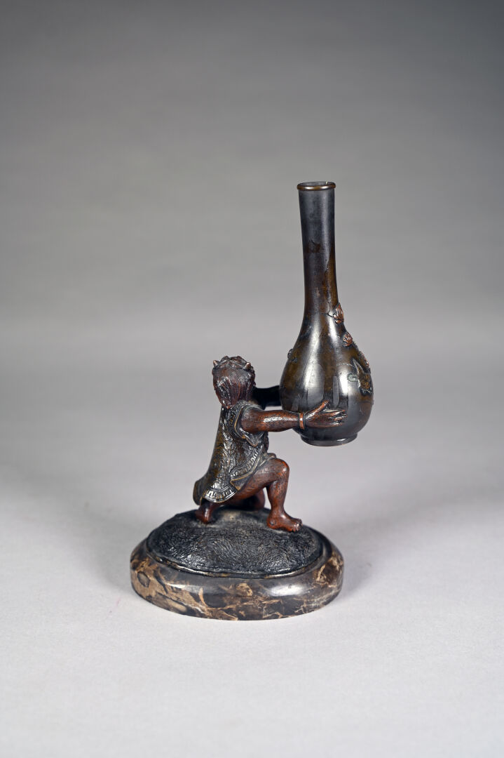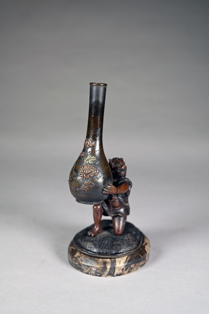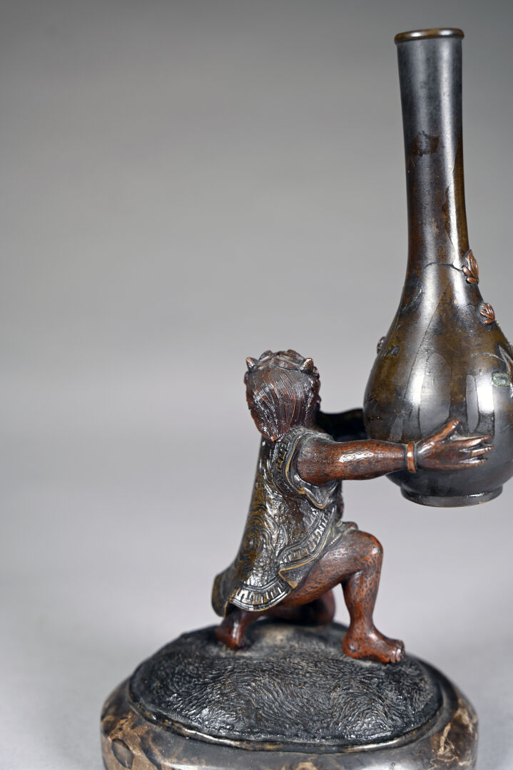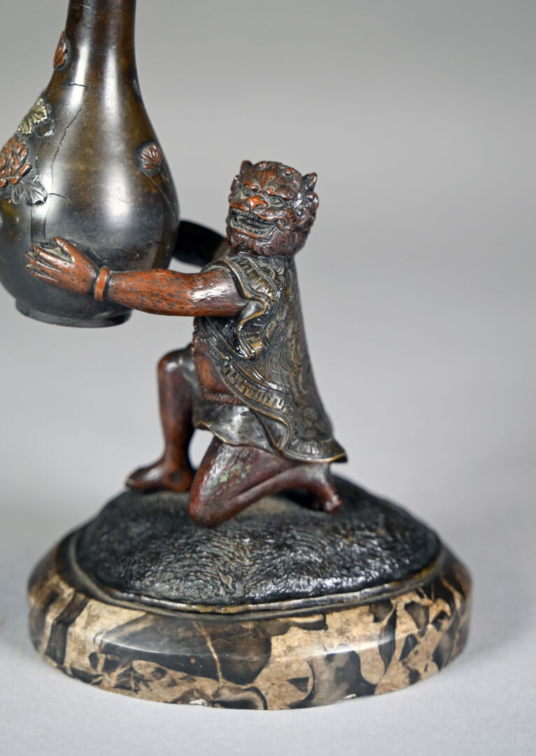 Solifolre en bronze à plusieurs patines, le fût représentant un oni (diablotin) portant un vase. Socle de marbre gris. Japon, période Meiji. Haut. : 25 cm.