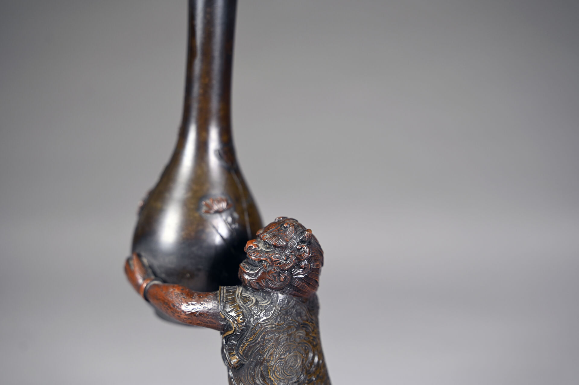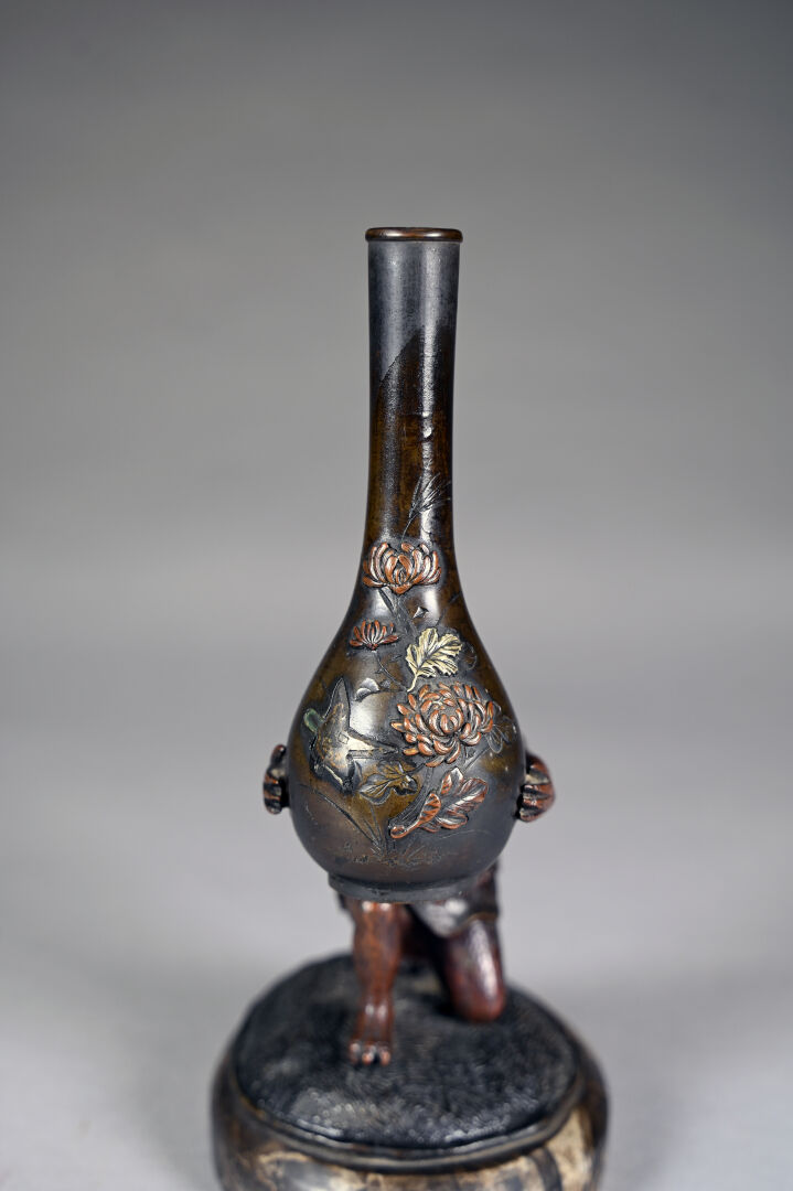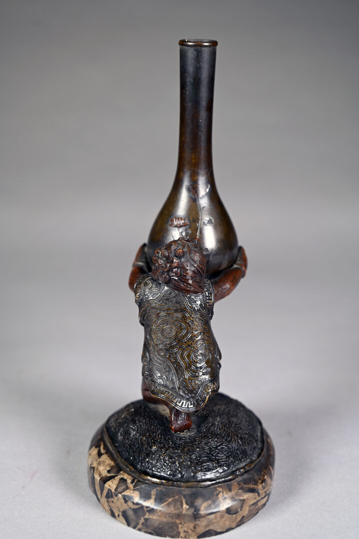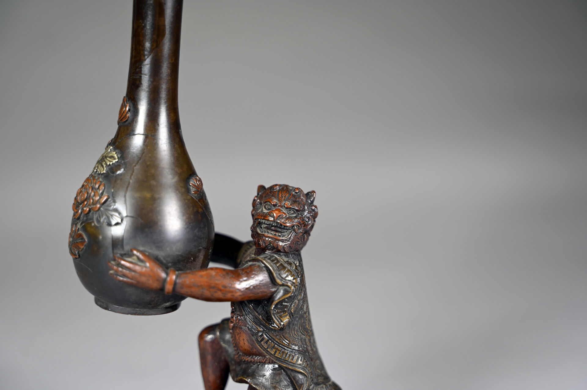 Solifolre en bronze à plusieurs patines, le fût représentant un oni (diablotin) portant un vase. Socle de marbre gris. Japon, période Meiji. Haut. : 25 cm.
