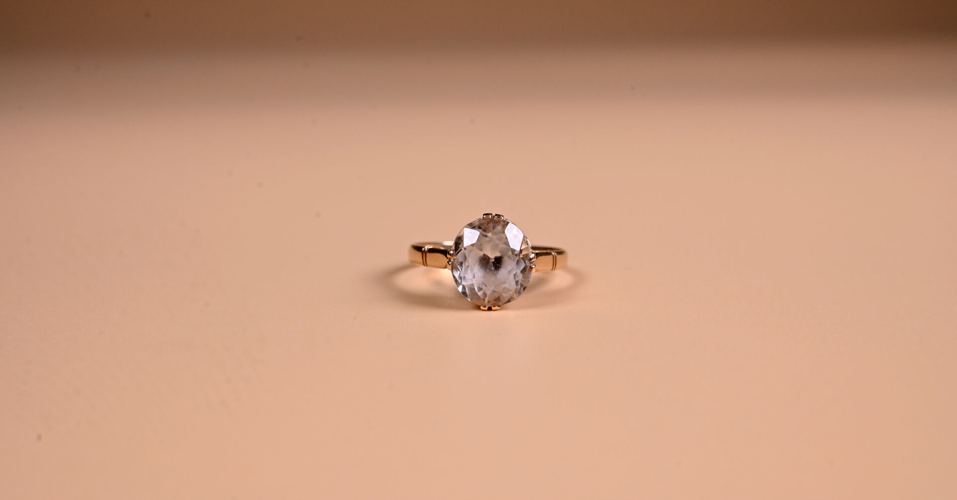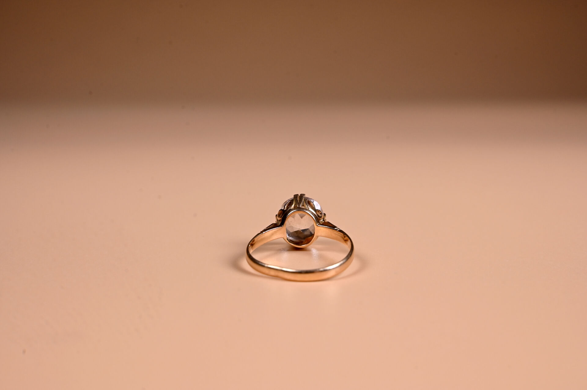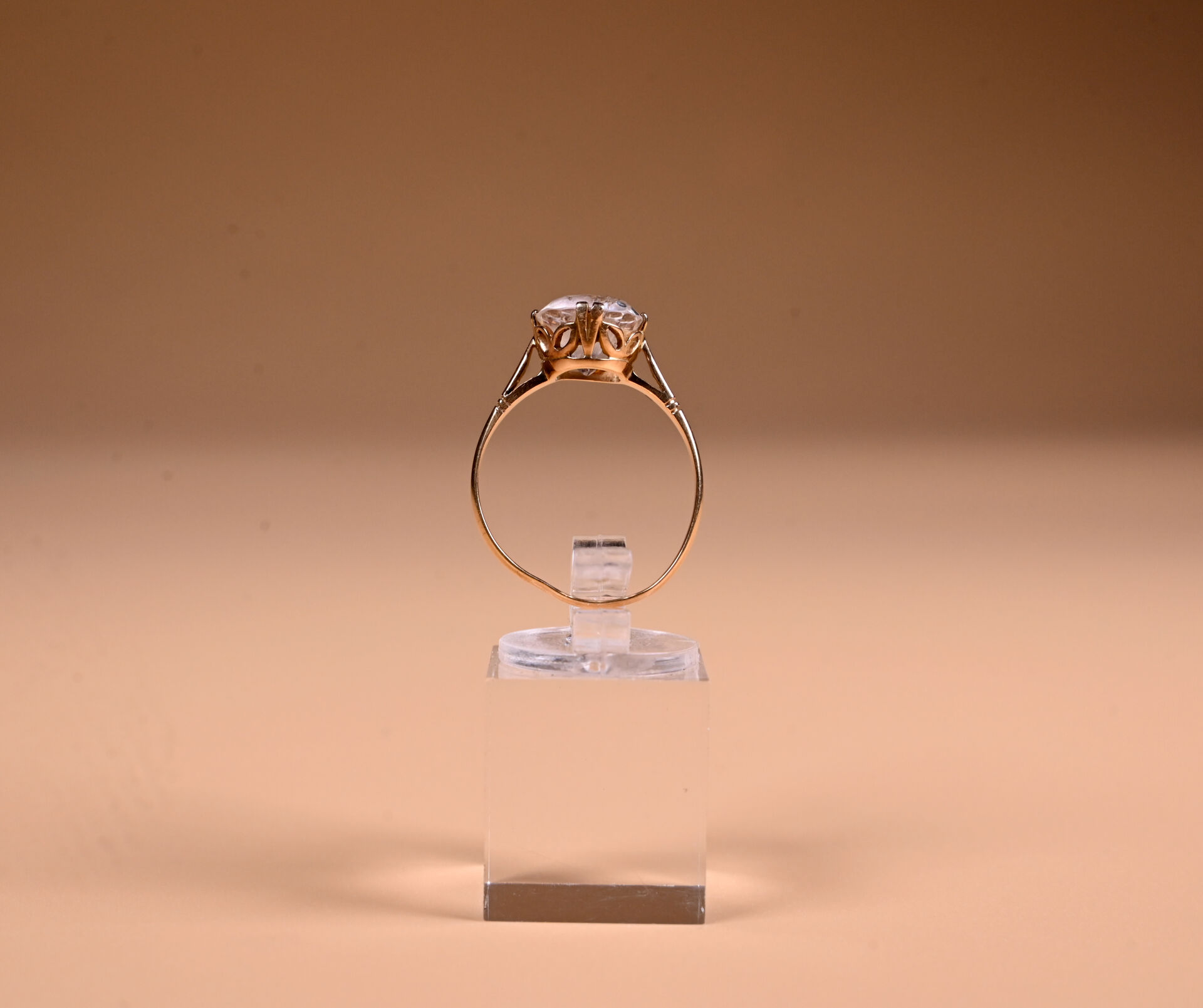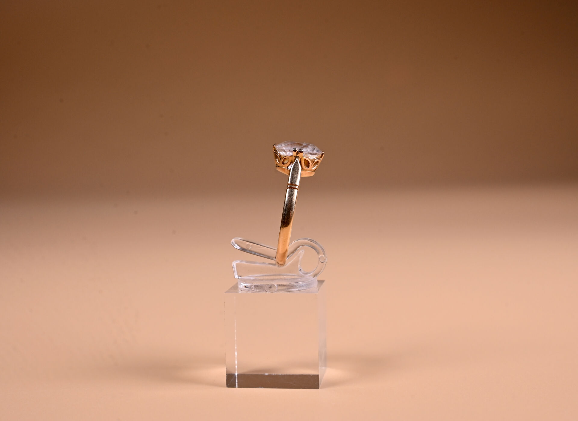 Solitaire en or jaune 18K 750/1000e et pierre imitant le diamant. TDD 61 (tordue). Poids brut. : 3,9 g.