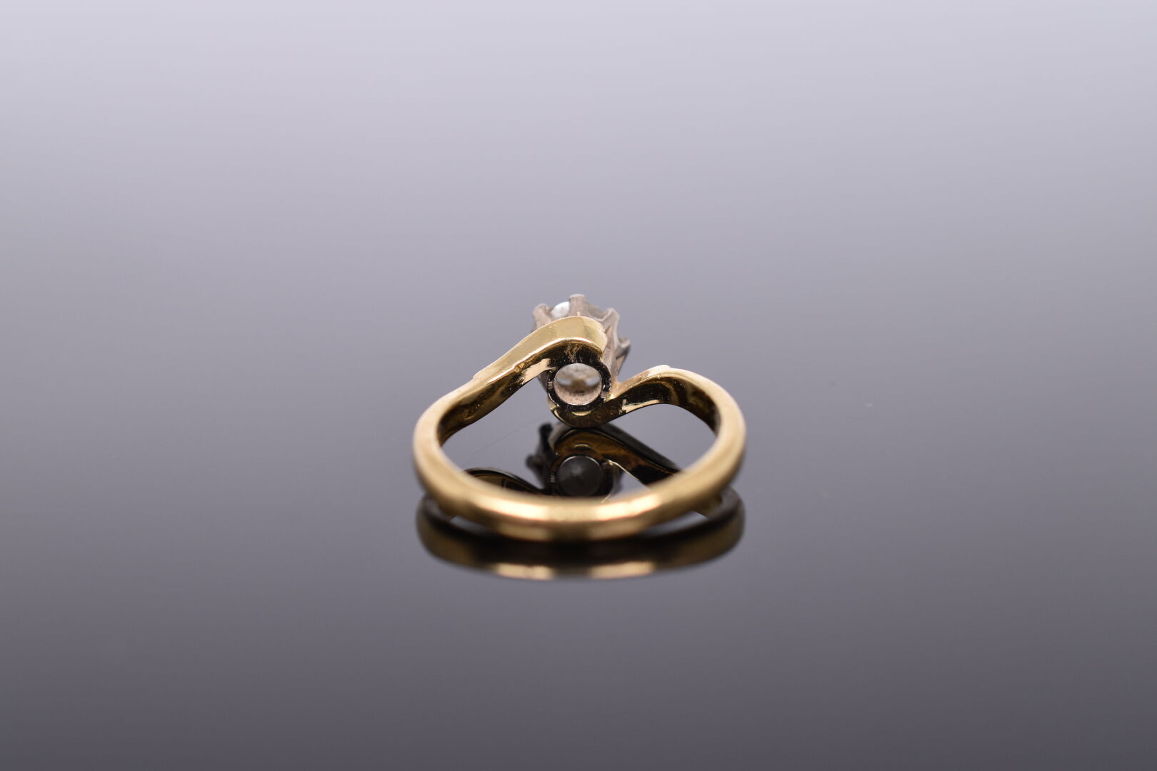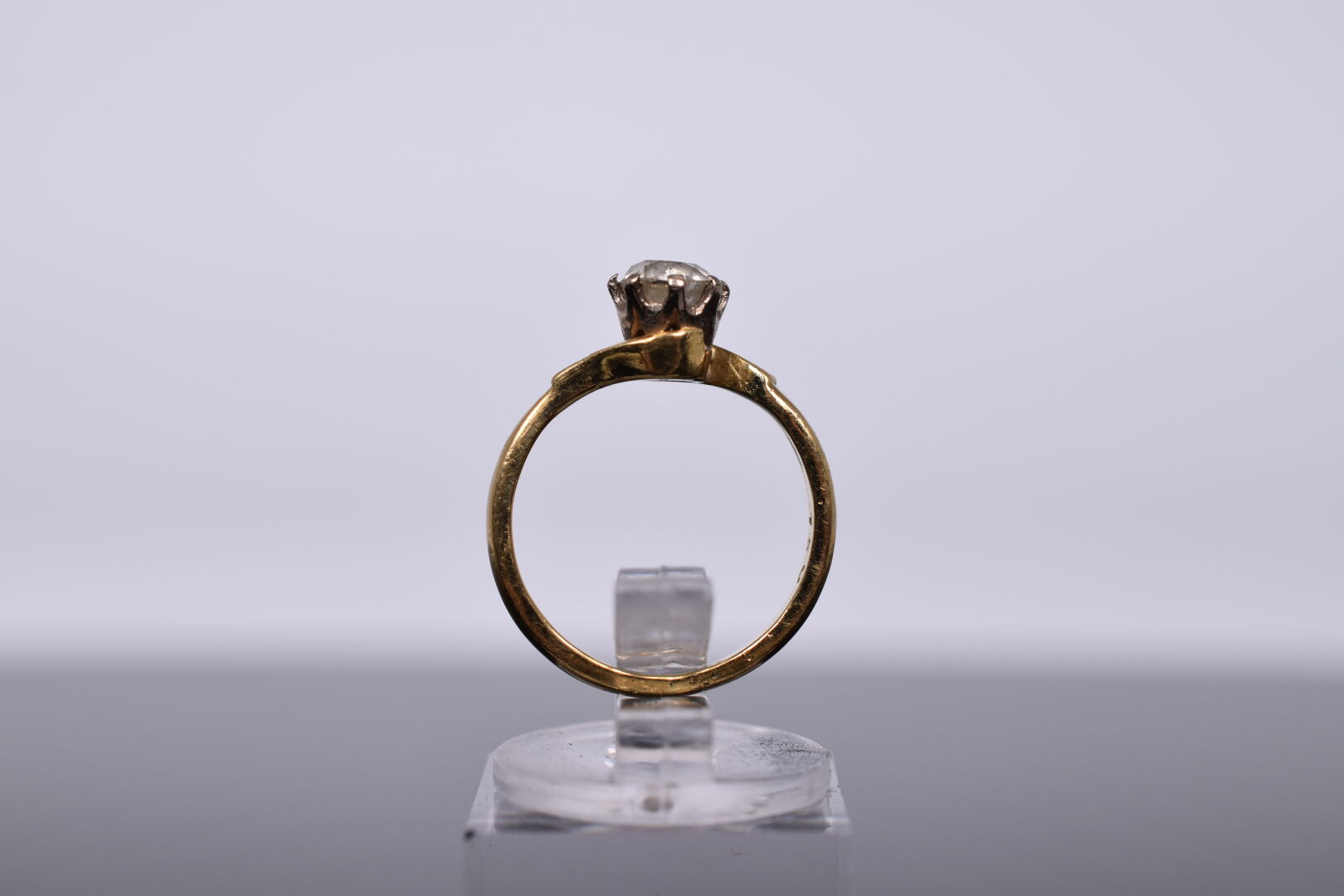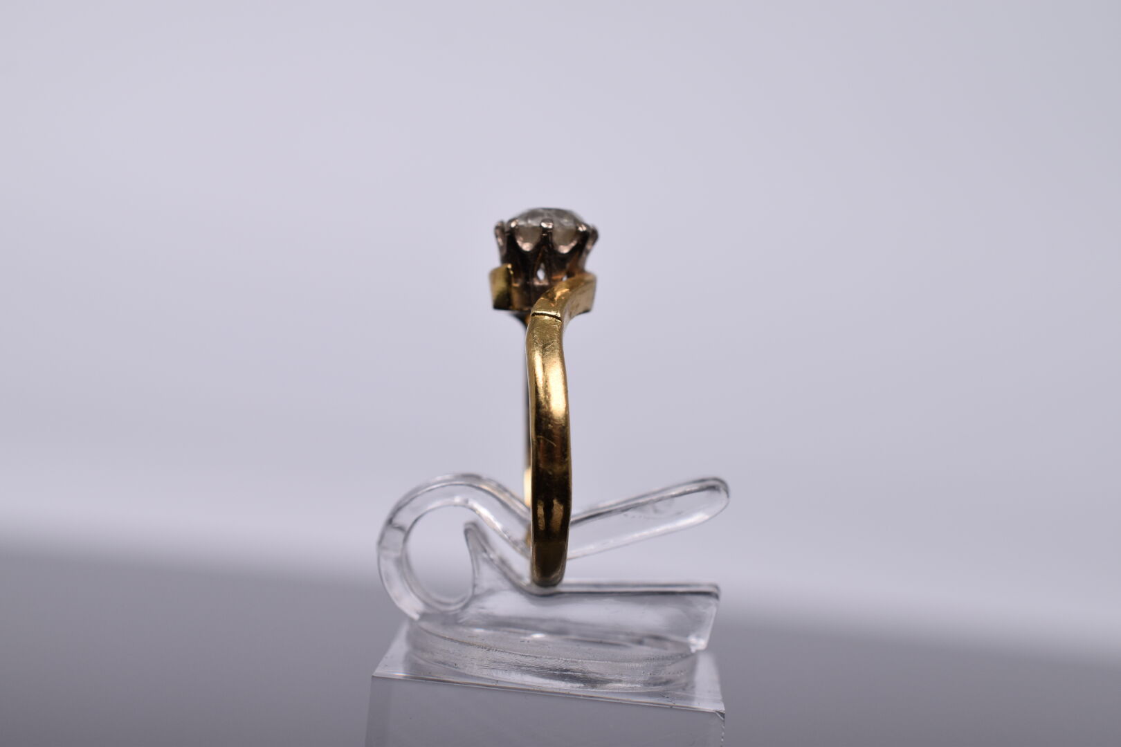 Solitaire en or jaune 18K 750/1000e orné en serti griffe d’un diamant de taille semi-ancienne d’environ 0,40 carat. TDD : 49. Poids brut : 3,25 g.