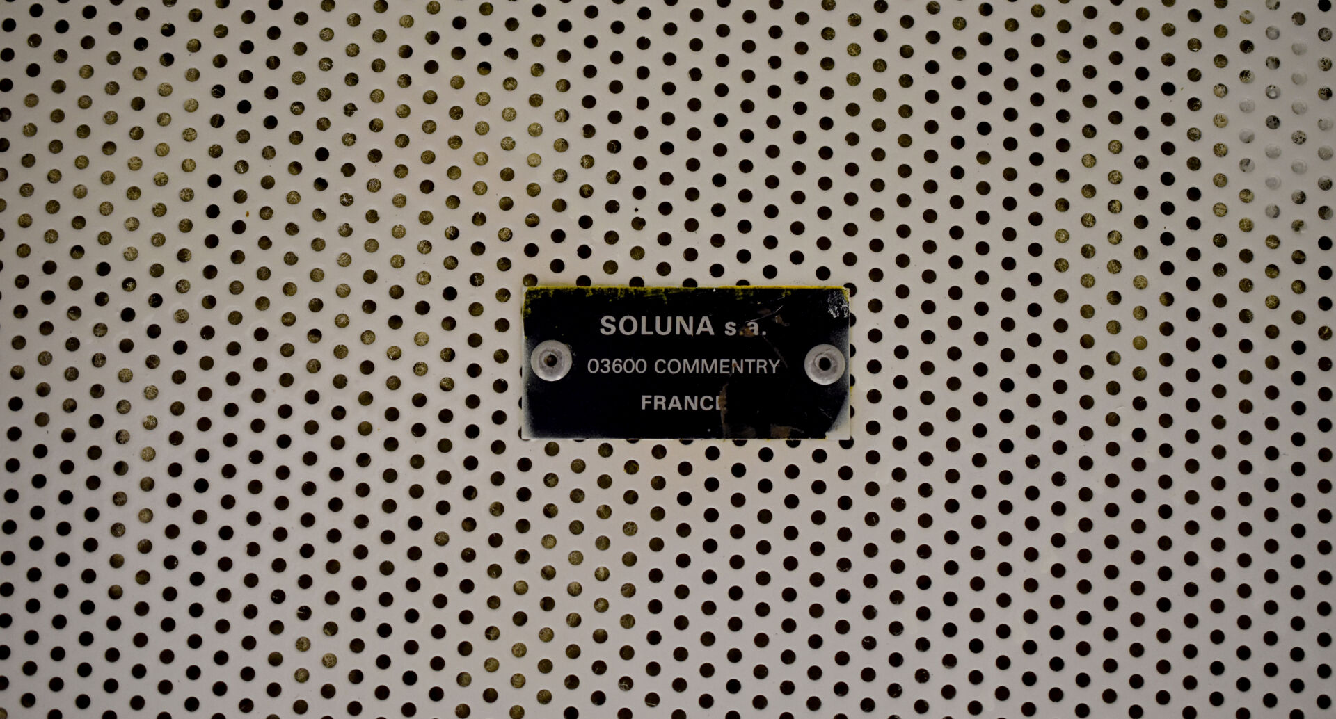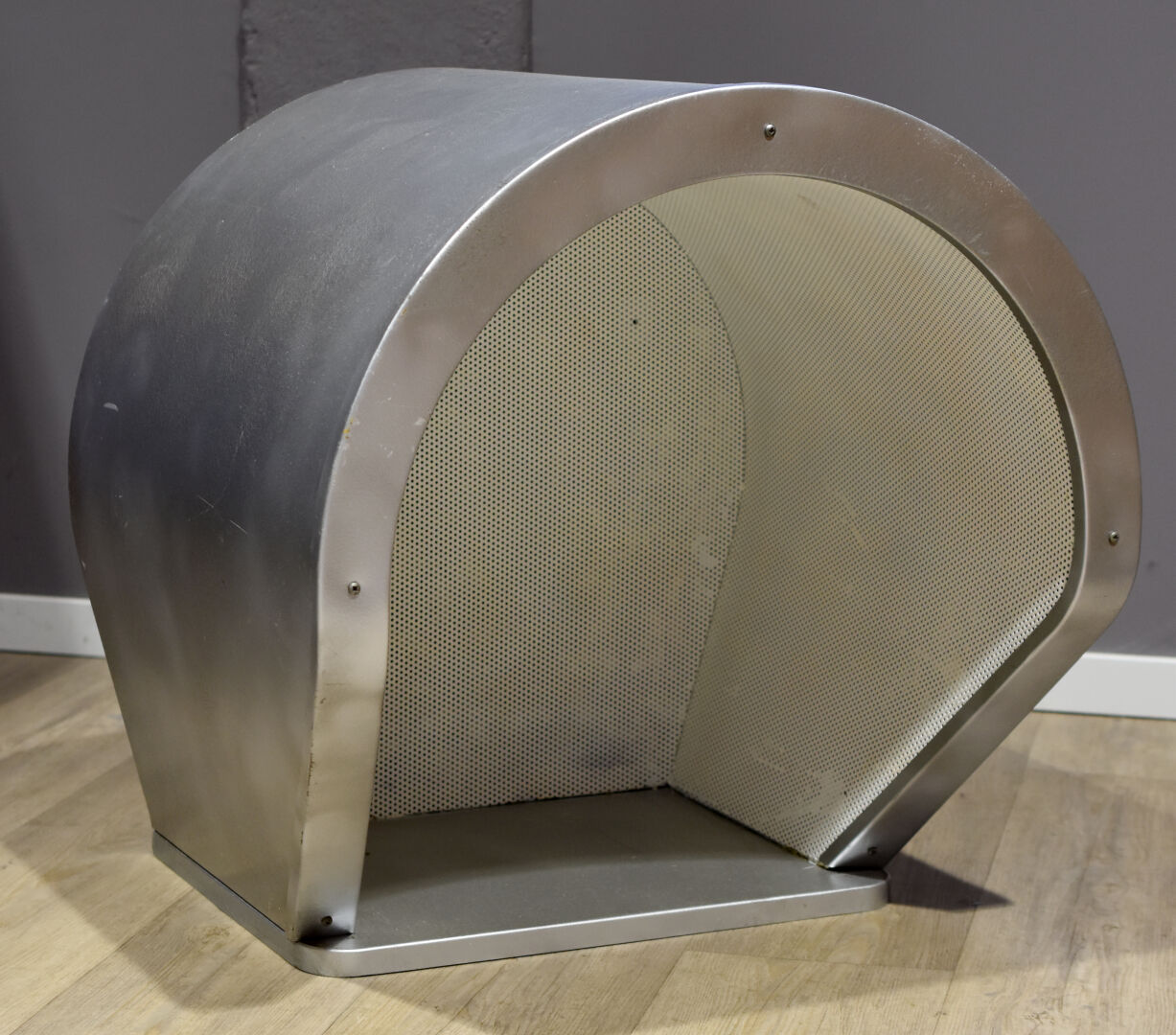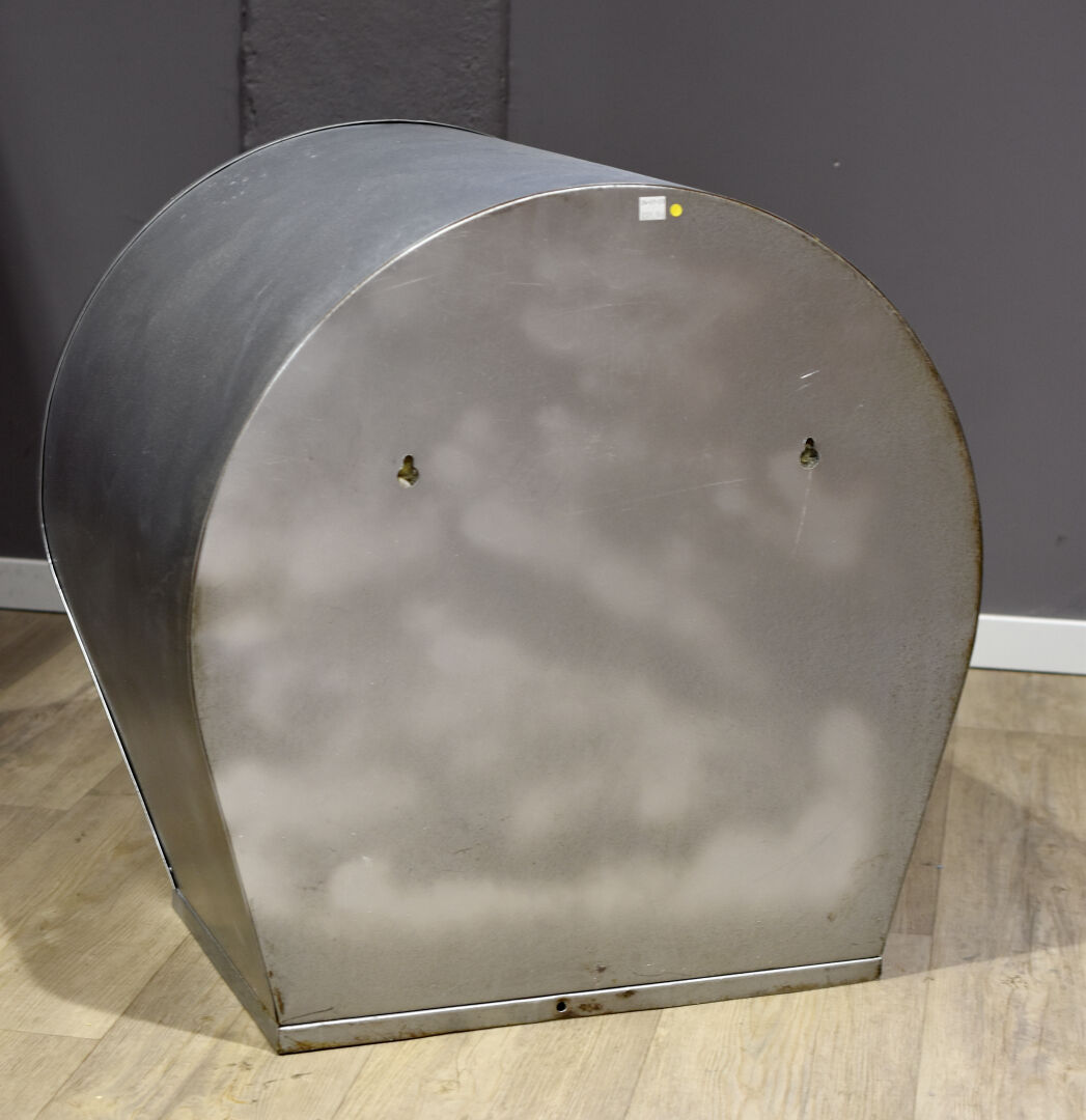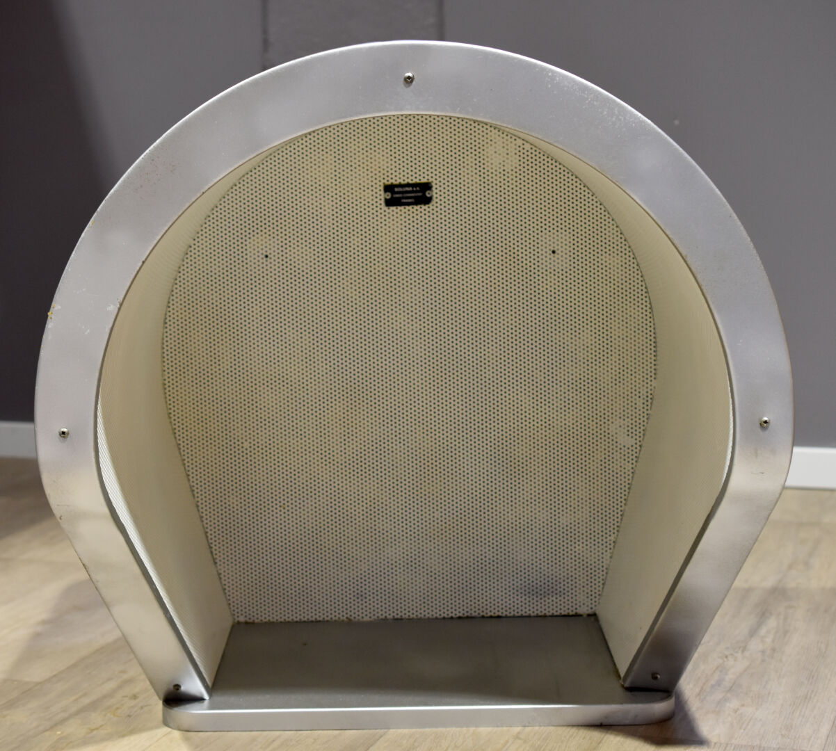 SOLUNA. Cabine téléphonique en métal laqué gris. A l’intérieur métal perforé blanc. Plaque « SOLUNA. S.A. 03600 Commentry France ». Haut. : 64 cm – Larg. : 64 cm – Prof. : 54 cm.