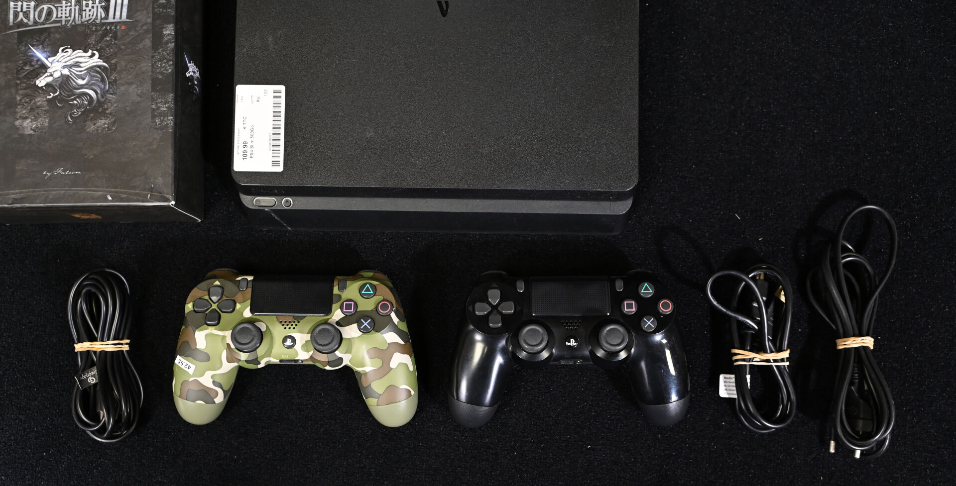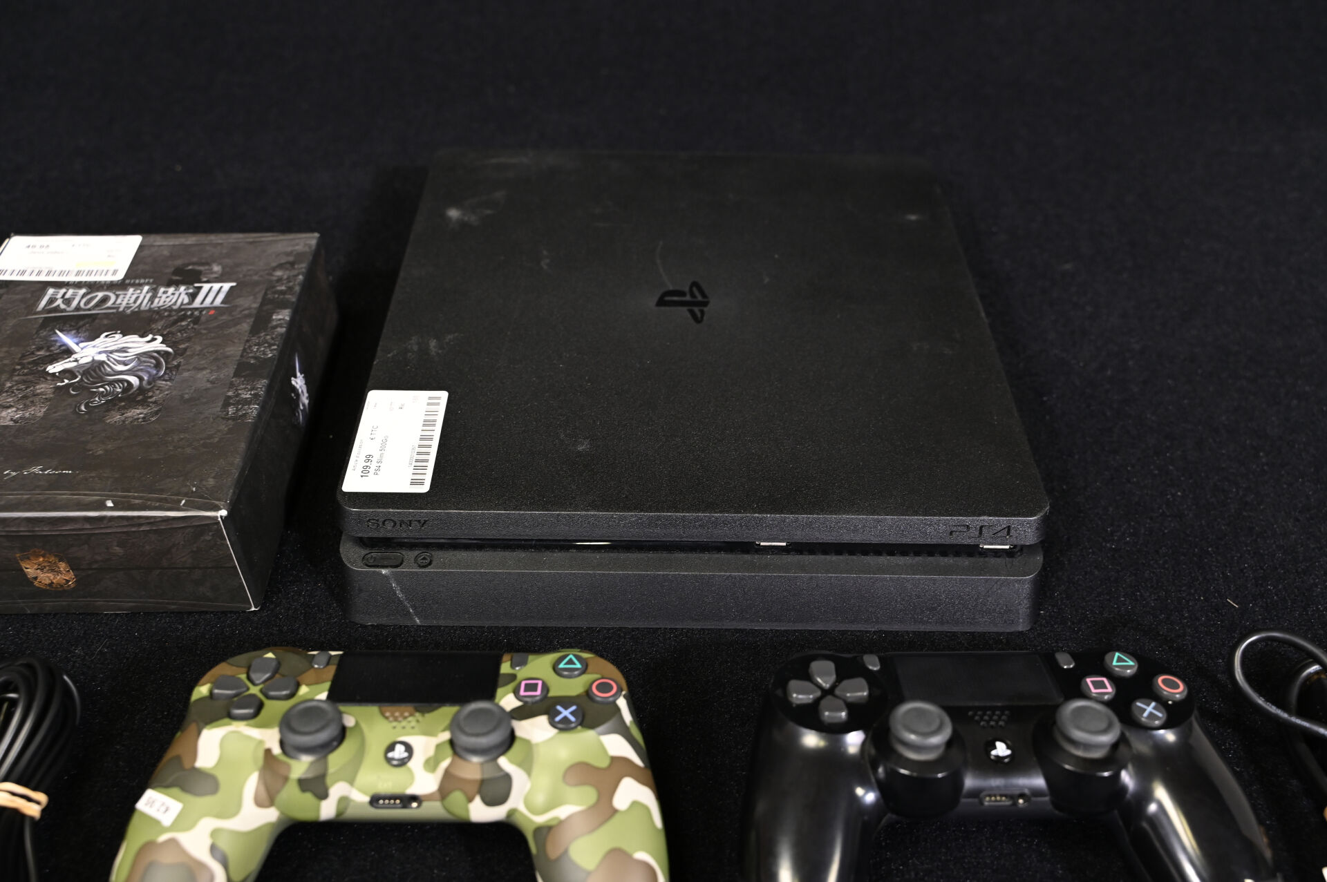 * SONY Console PS4 Slim 03-27452395-6244925 Avec câbles, 2 manettes dont une CUH-ZCT2E (militaire) et le jeu FALCOM – THE LEGEND OF HEROES : SEN NO KISEKI III, édition Japonaise avec soundtrack et livret. Sans boîte.