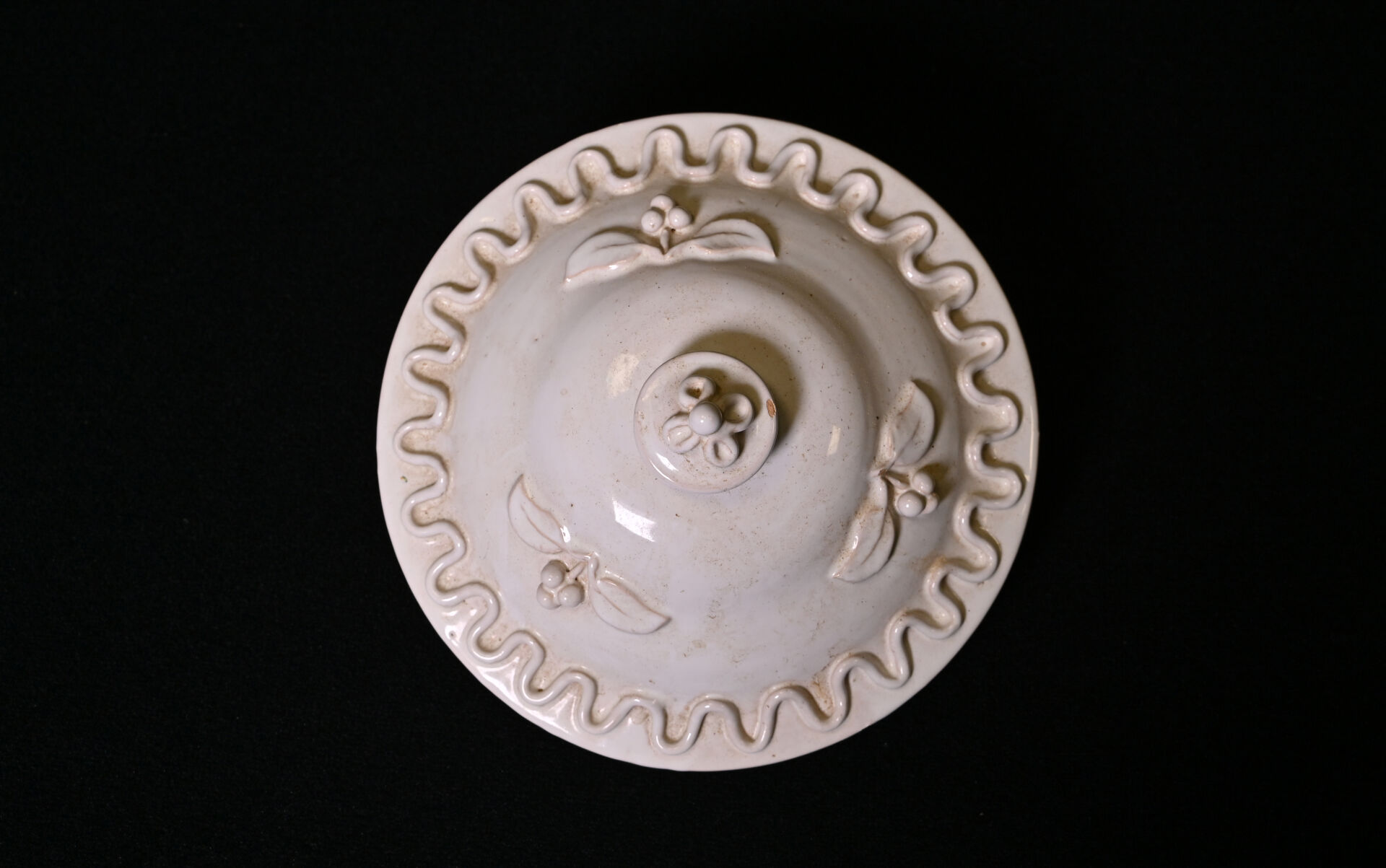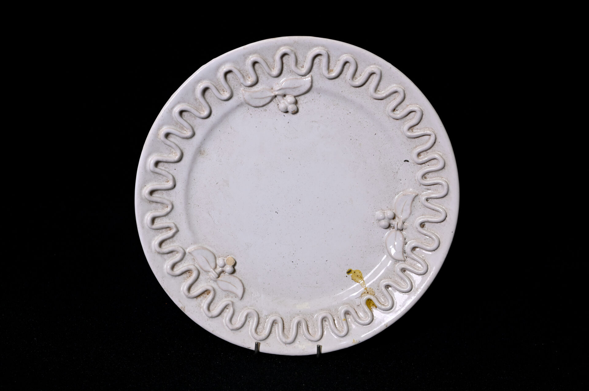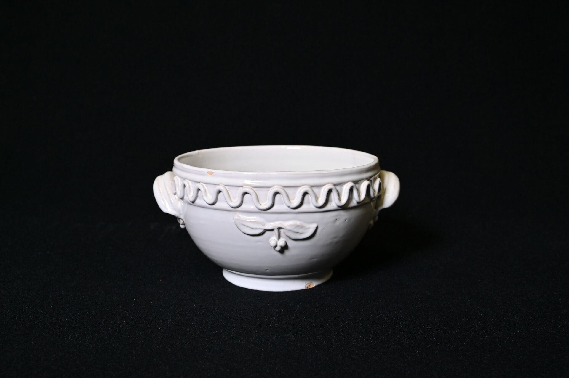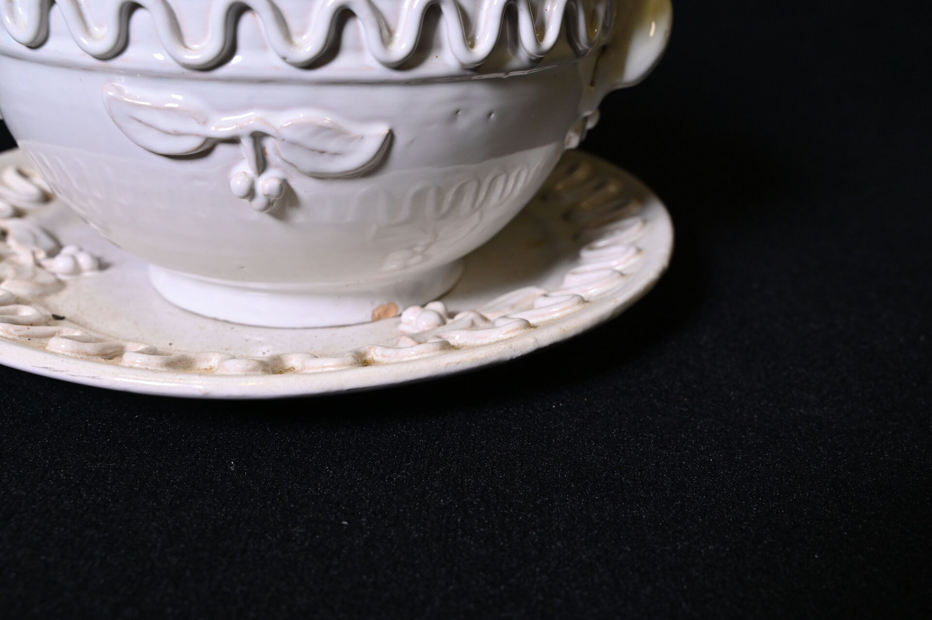 Soupière et son plat en faïence à décor de fruits et serpentins (éclats, manques). Marquée TE FRANCE au dessous. Haut. soupière: 24 cm.