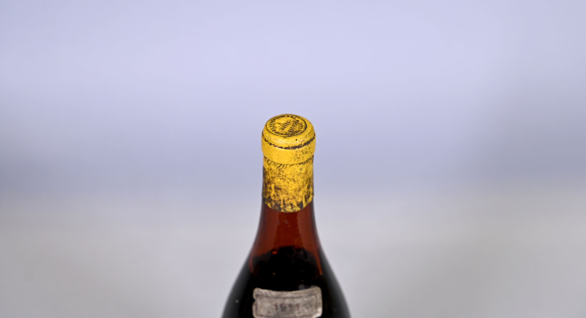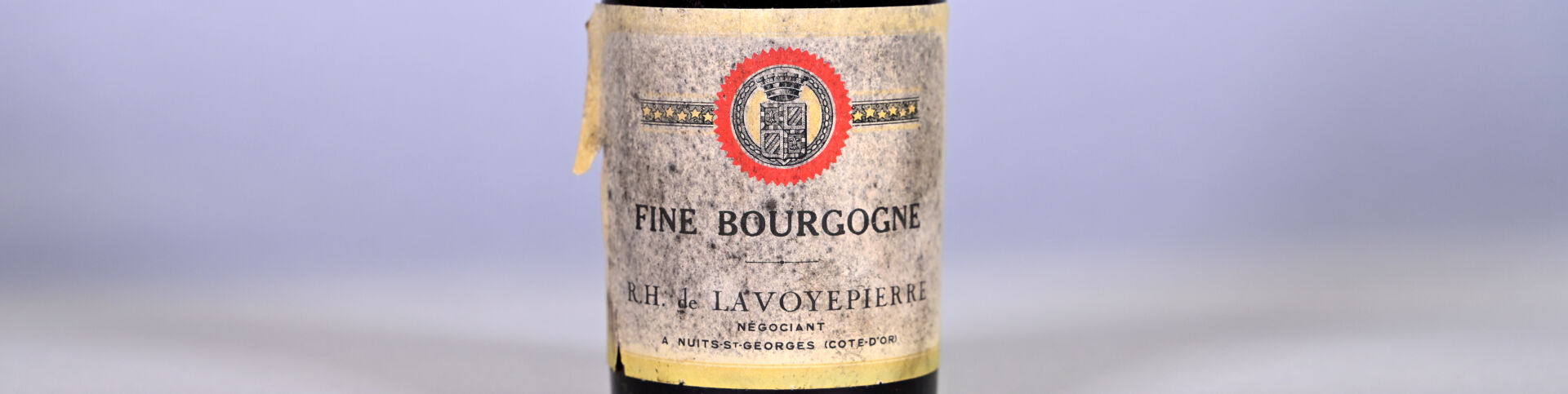 SPIRITUEUX – 1 bouteille, Fine Bourgogne, R.H. de Lavoyepierre, 1911. Niveau à 5,3 cm sous la capsule. Capsule très sale. Bandeau sale et légèrement abimé. Etiquette sale, abimée avec des déchirures et des points de décollement.
