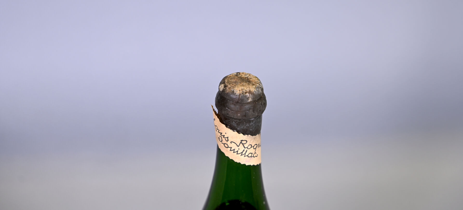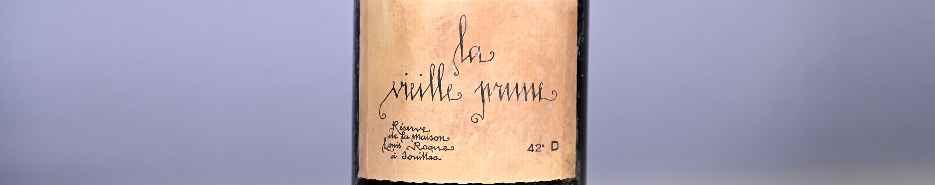SPIRITUEUX – 1 magnum, Louis Roque, La Vieille Prune. Niveau légèrement bas. Capsule en cire sale et abimée. Ecusson sale. Etiquette sale et entièrement décollée.