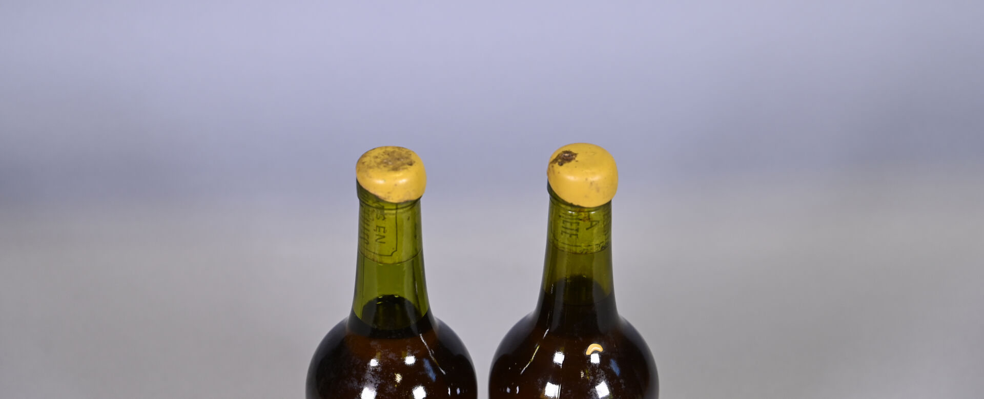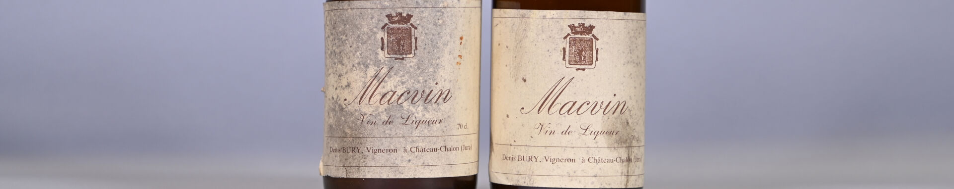 SPIRITUEUX – 2 bouteilles, Macvin, Denis Bury. Un niveau légèrement bas. Capsules en cire légèrement sales avec des manques. Etiquettes sales avec des traces d’humidité et quelques petits points de décollement. Contre-étiquettes manquantes.