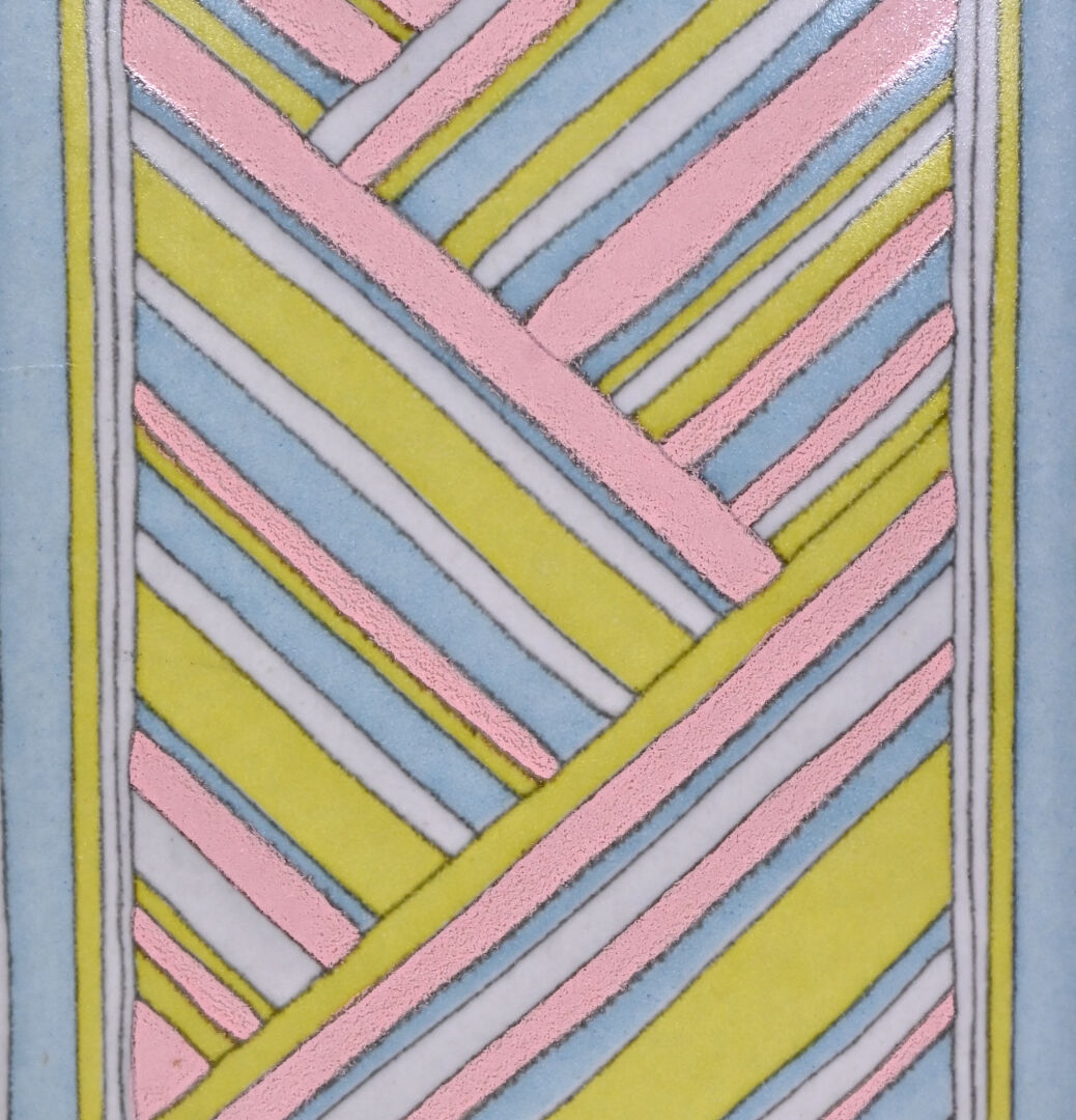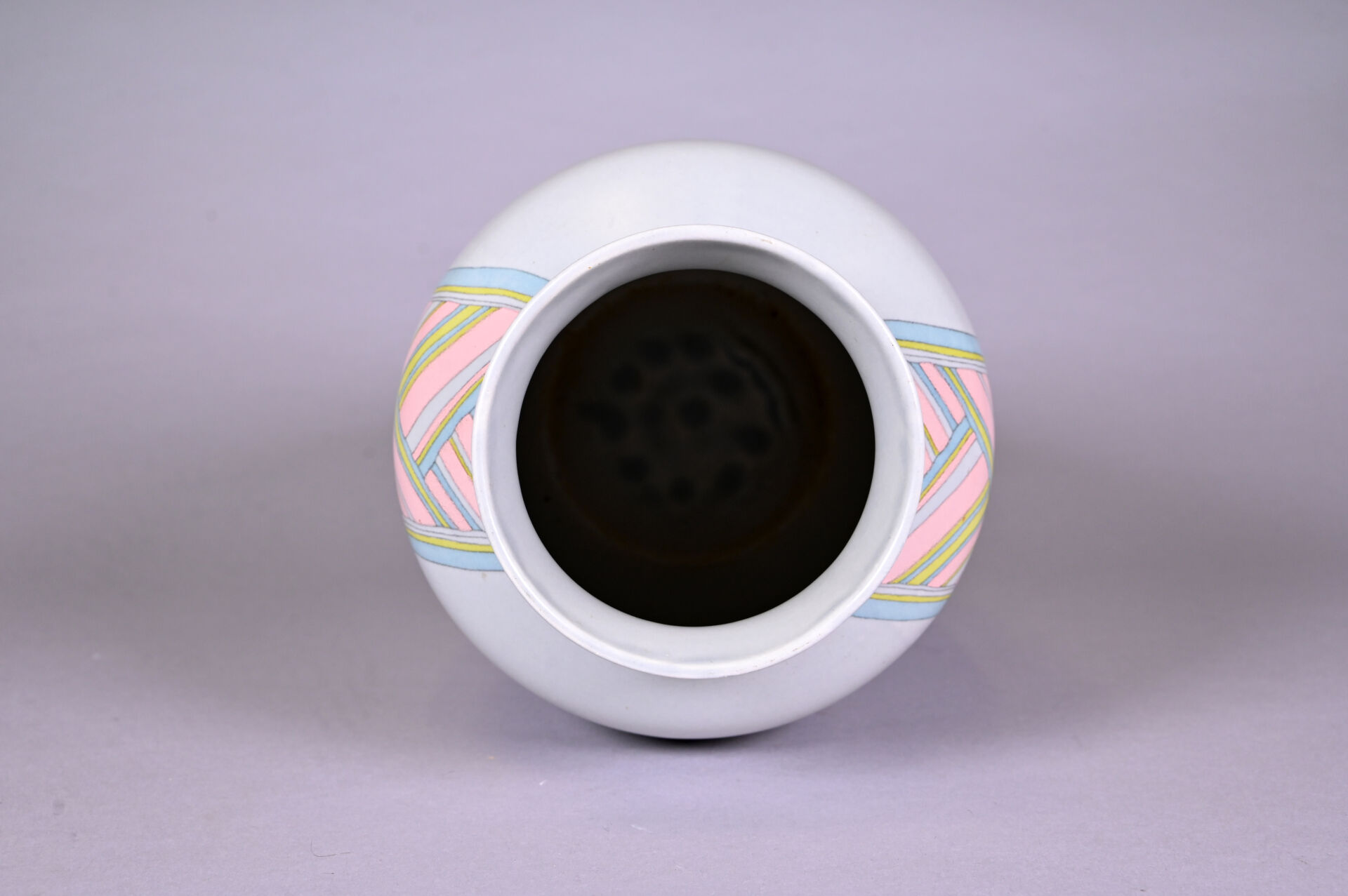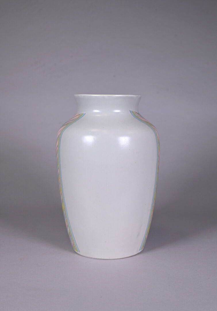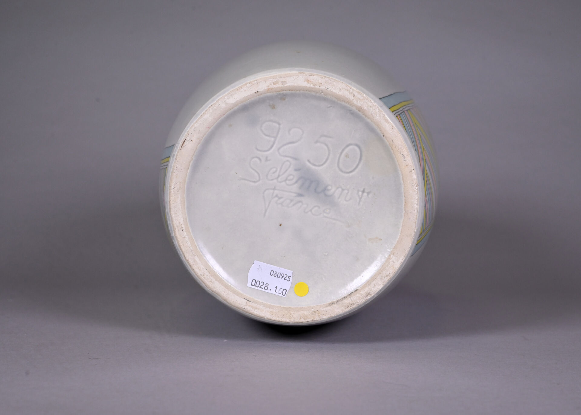 ST CLEMENT. Vase en céramique à décor d’un bandeau à rayures rose, vert et bleu. Signé, vers 1960 ?. Haut. : 32 cm.