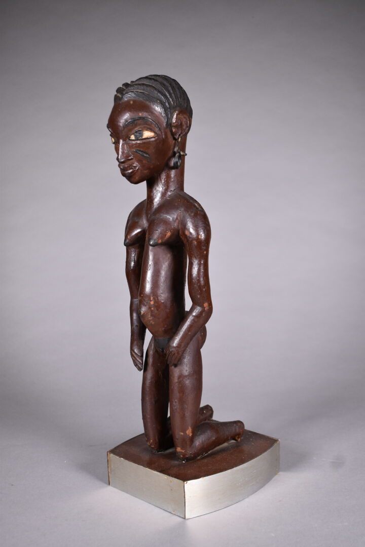 Intéressante statue figurant un personnage féminin agenouillé. Les bras sont démarqués du corps, se rejoignant sur le haut des cuisses. Le visage aux grands yeux est paré de boucles d’oreilles et surmonté d’une délicate coiffe tressée. L’ensemble de la statue est recouvert d’une peinture d’origine européenne appliquée néanmoins dans son contexte d’origine en Afrique.