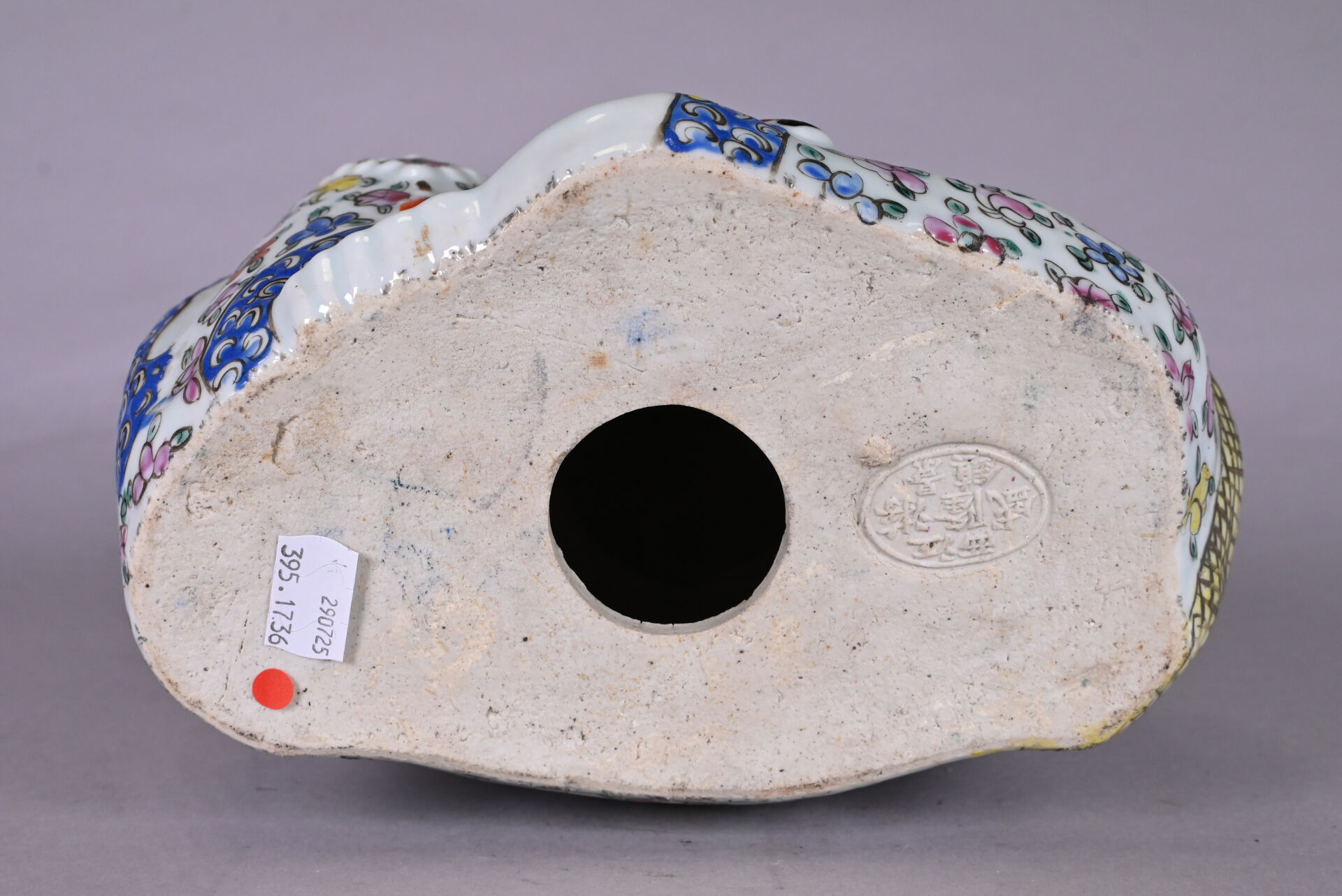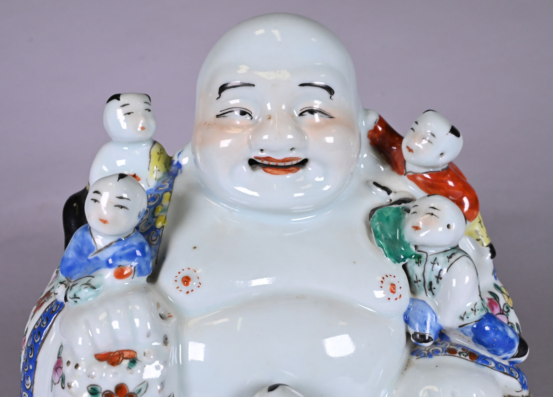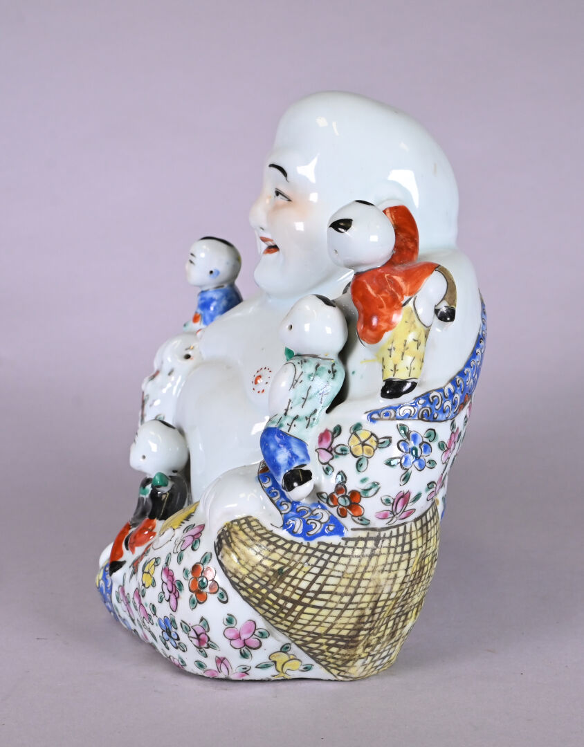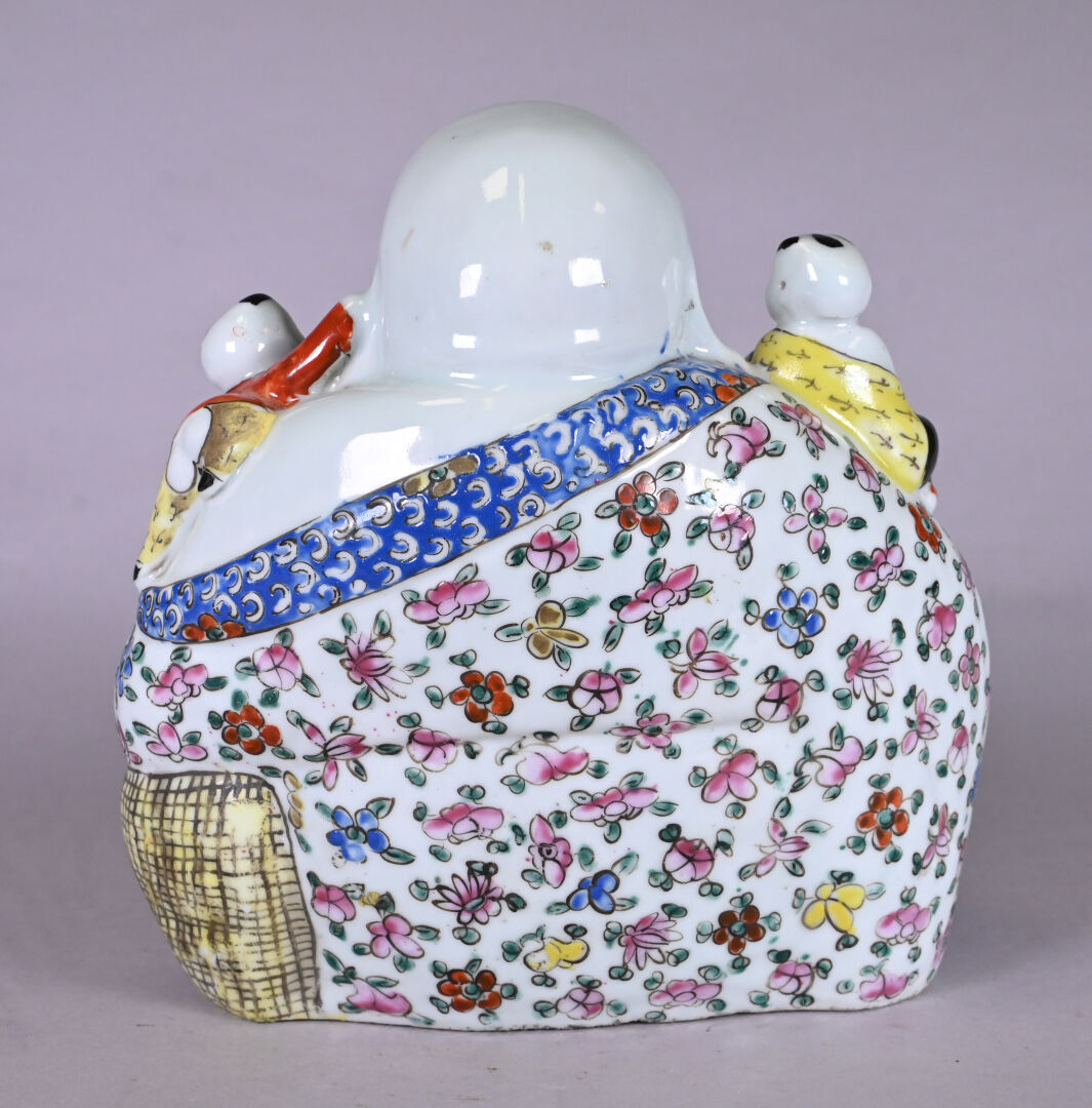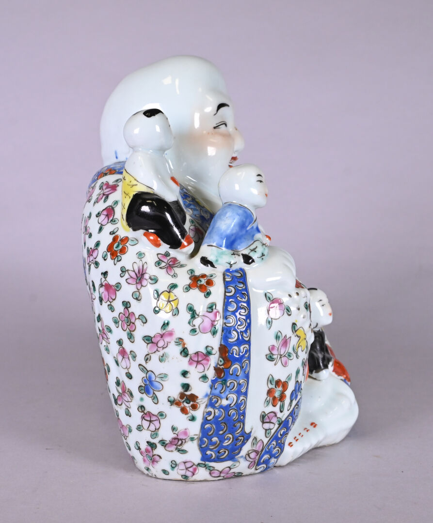 Statuette en porcelaine de la famille rose représentant le Bouddha Milefo. Chine, début du XXe siècle. Haut. : 26 cm.