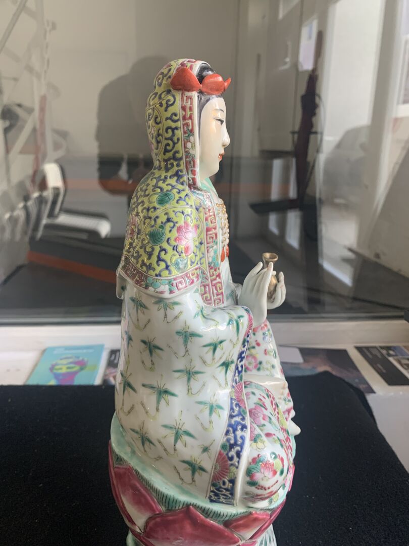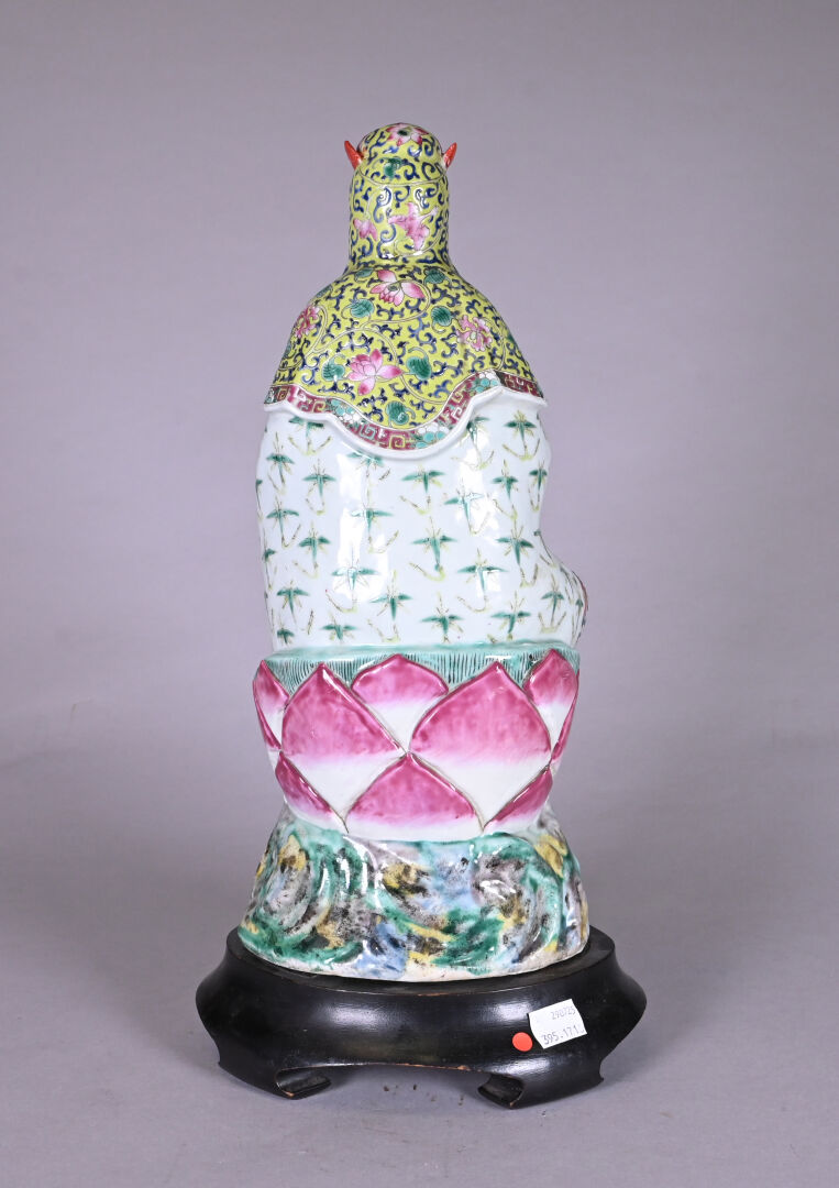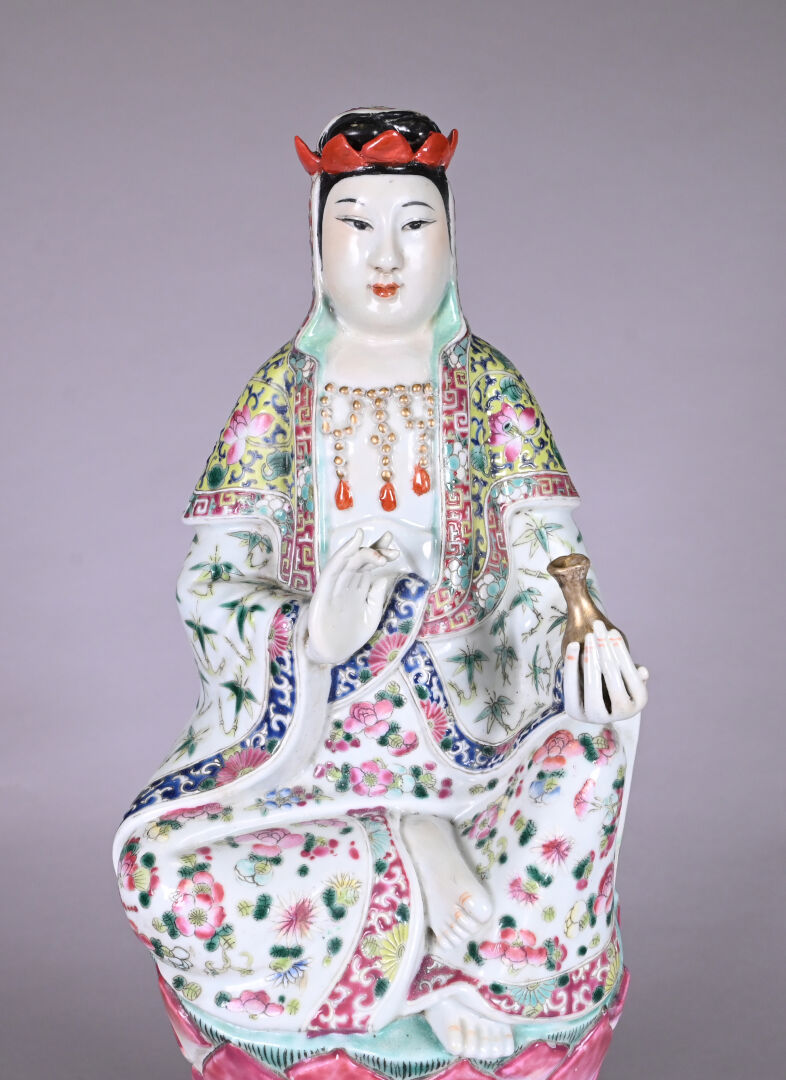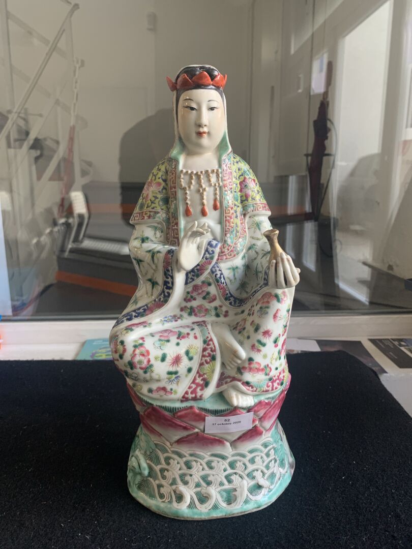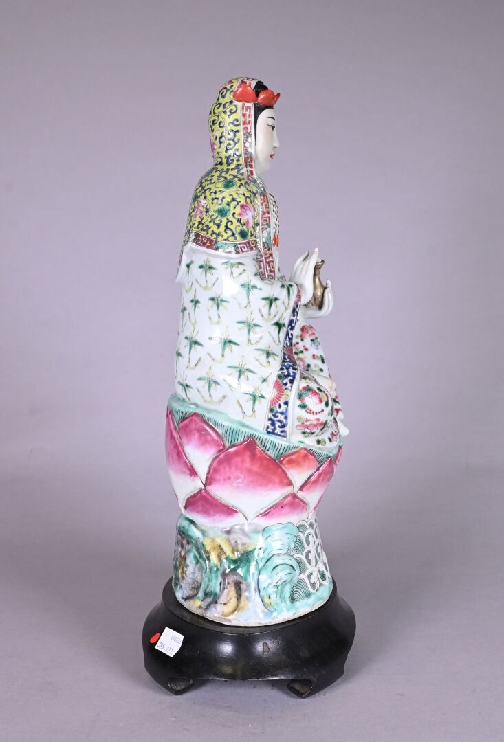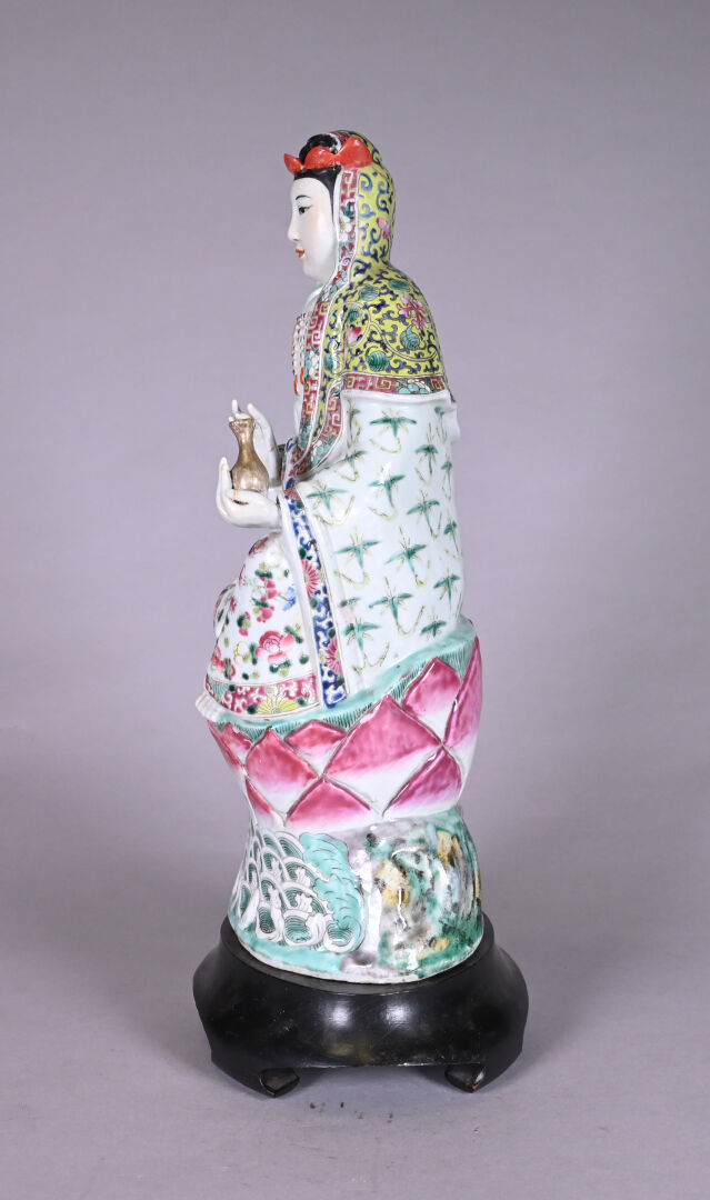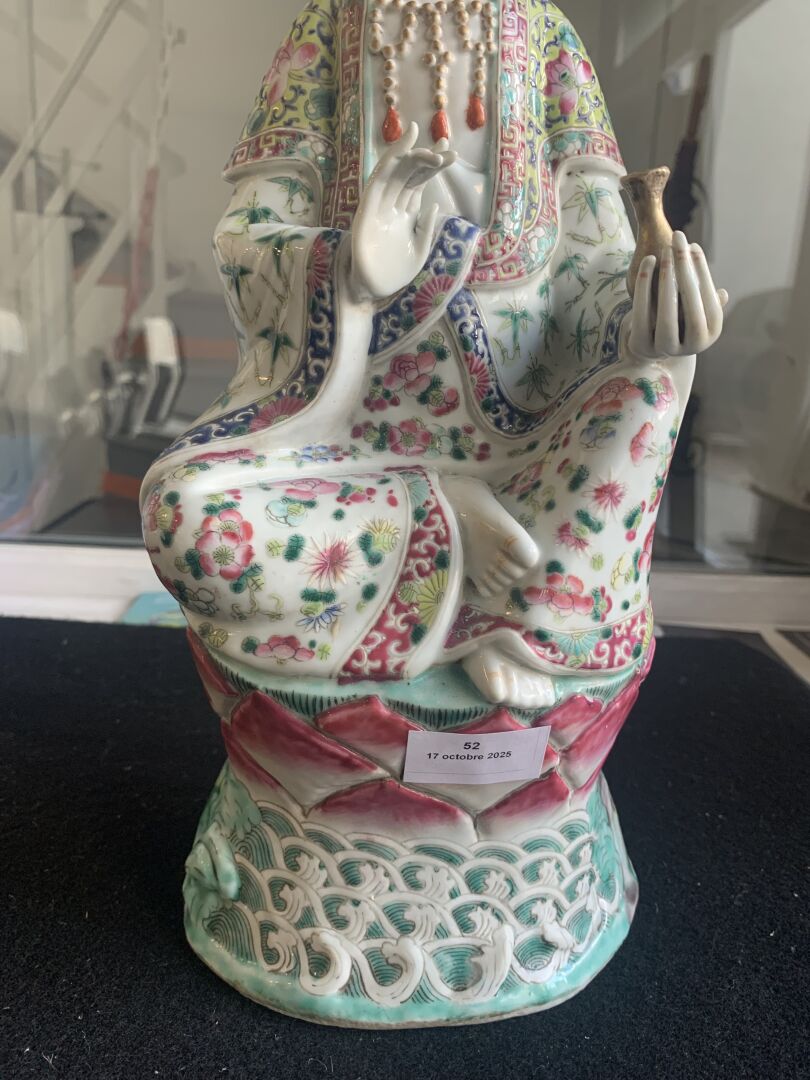 Statuette en porcelaine et émaux de la famille rose, représentant une divinité féminine assise en lalitasana sur un lotus, et tenant un vase à eau lustrale. Socle de bois noirci. Chine, XXe siècle. Haut. : 43 cm.