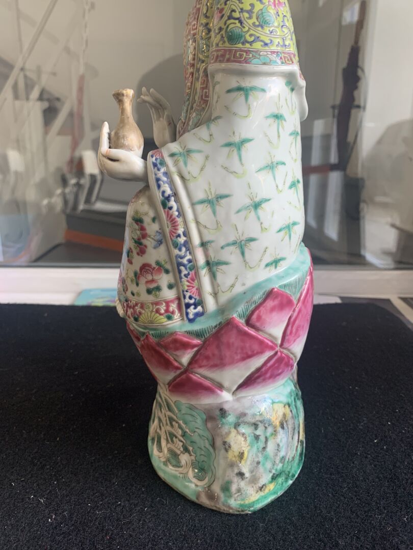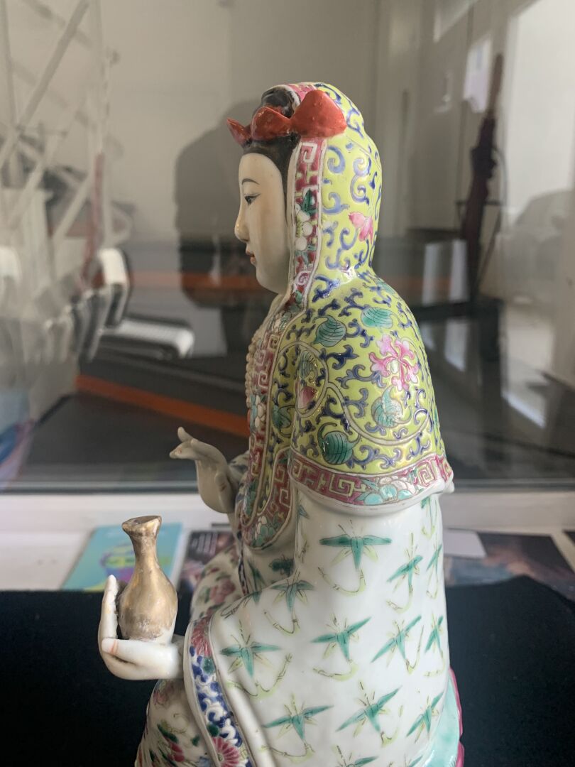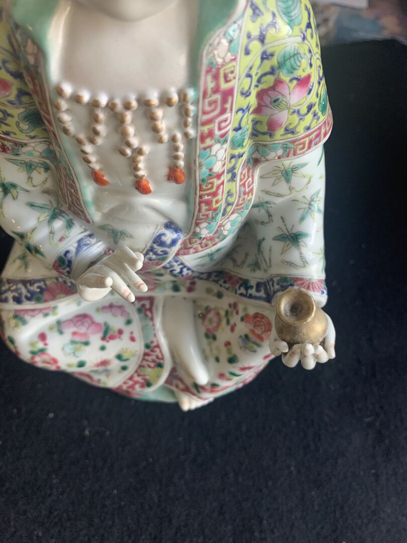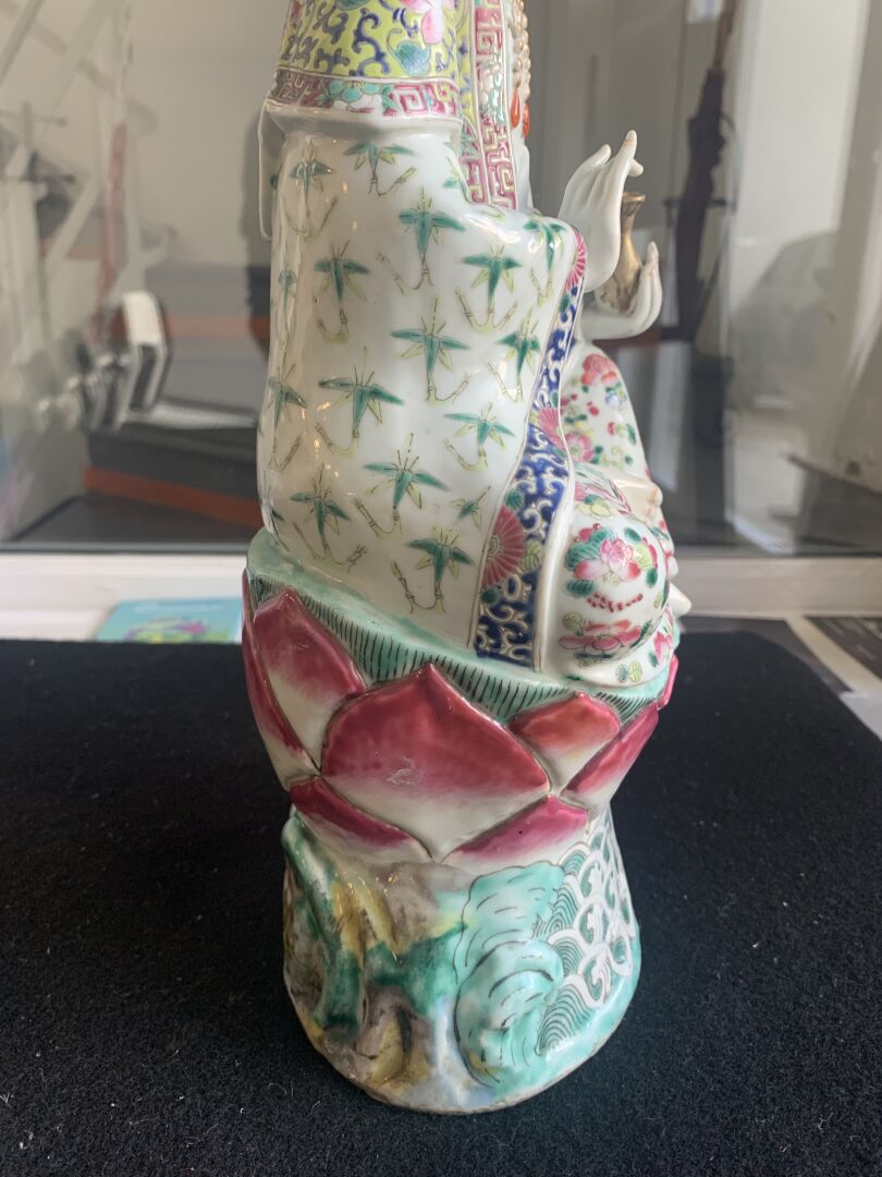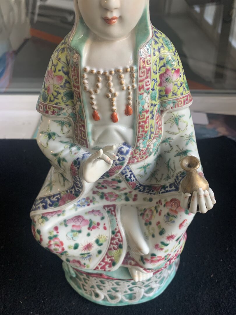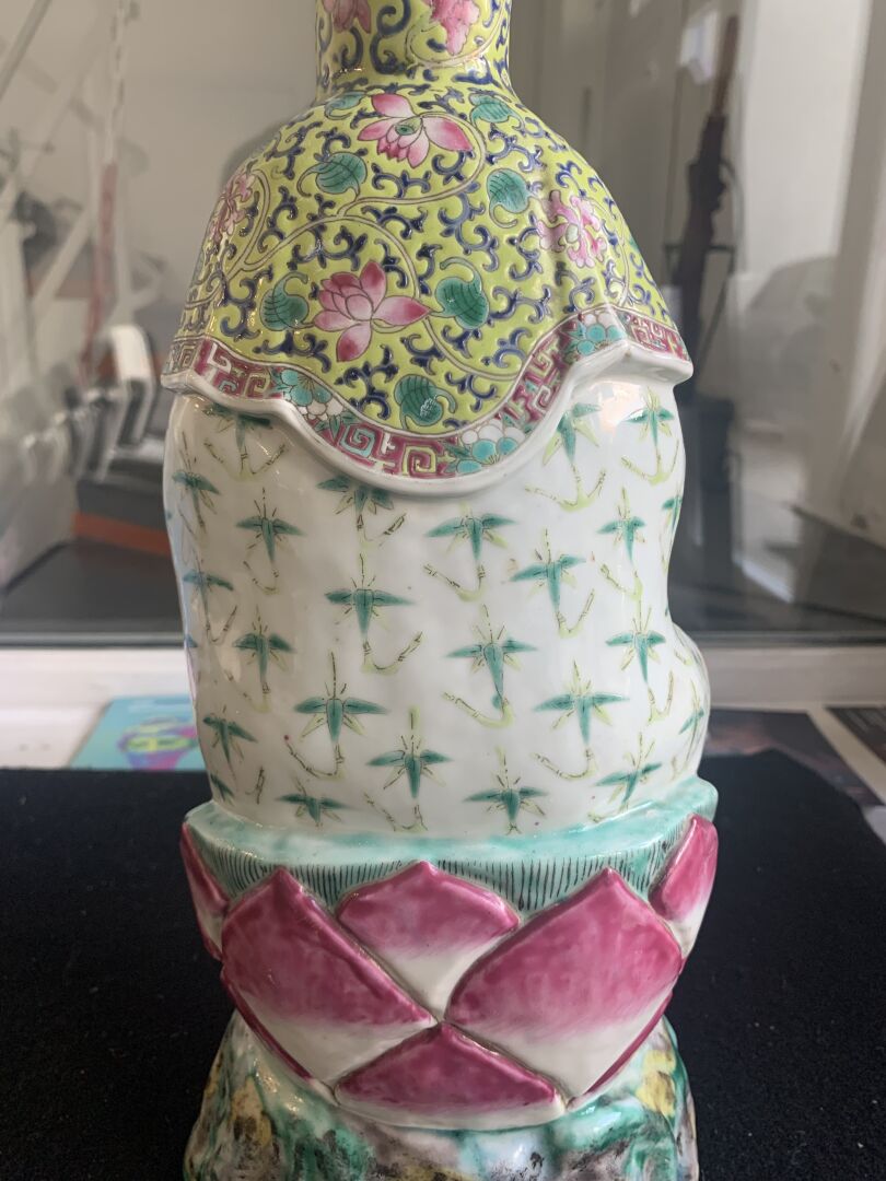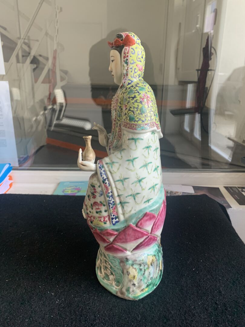 Statuette en porcelaine et émaux de la famille rose, représentant une divinité féminine assise en lalitasana sur un lotus, et tenant un vase à eau lustrale. Socle de bois noirci. Chine, XXe siècle. Haut. : 43 cm.