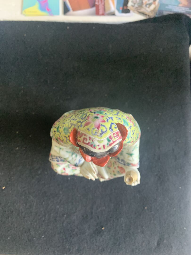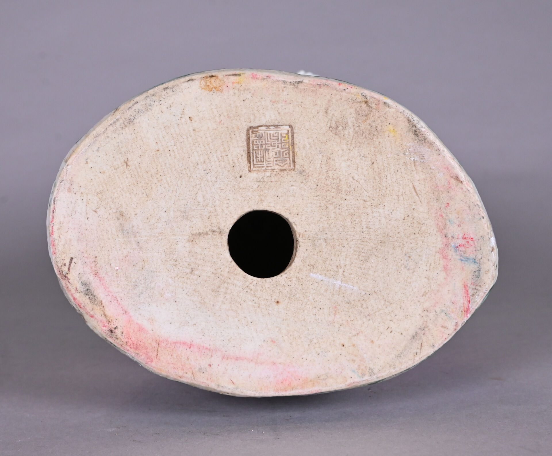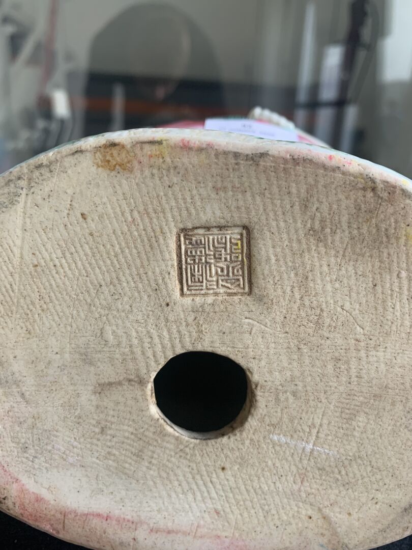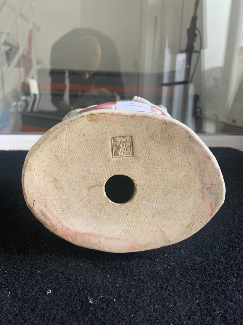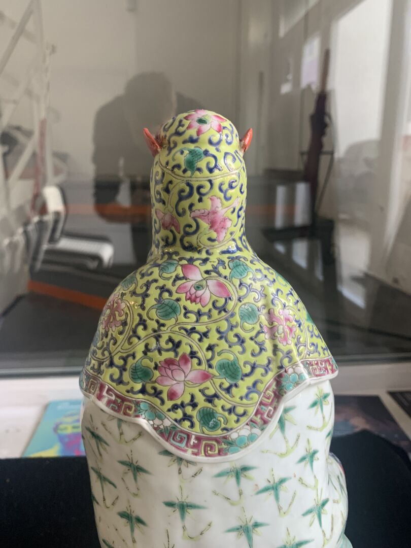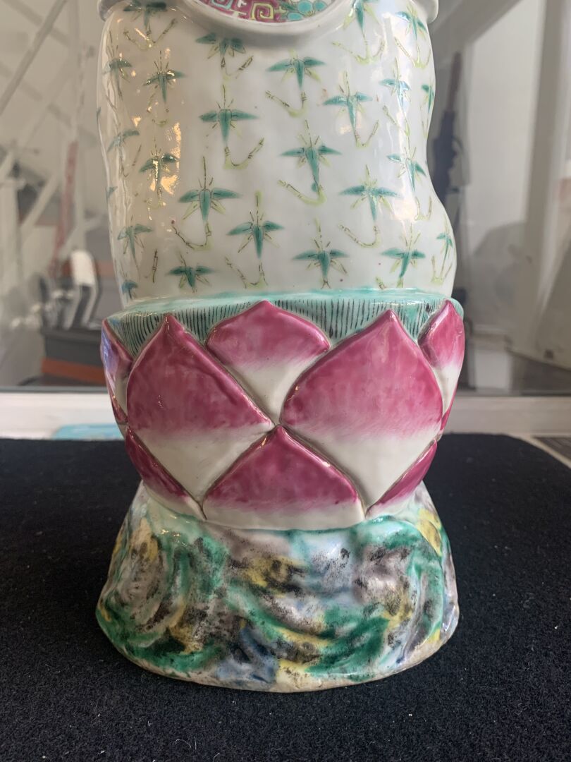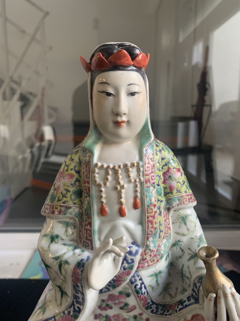 Statuette en porcelaine et émaux de la famille rose, représentant une divinité féminine assise en lalitasana sur un lotus, et tenant un vase à eau lustrale. Socle de bois noirci. Chine, XXe siècle. Haut. : 43 cm.