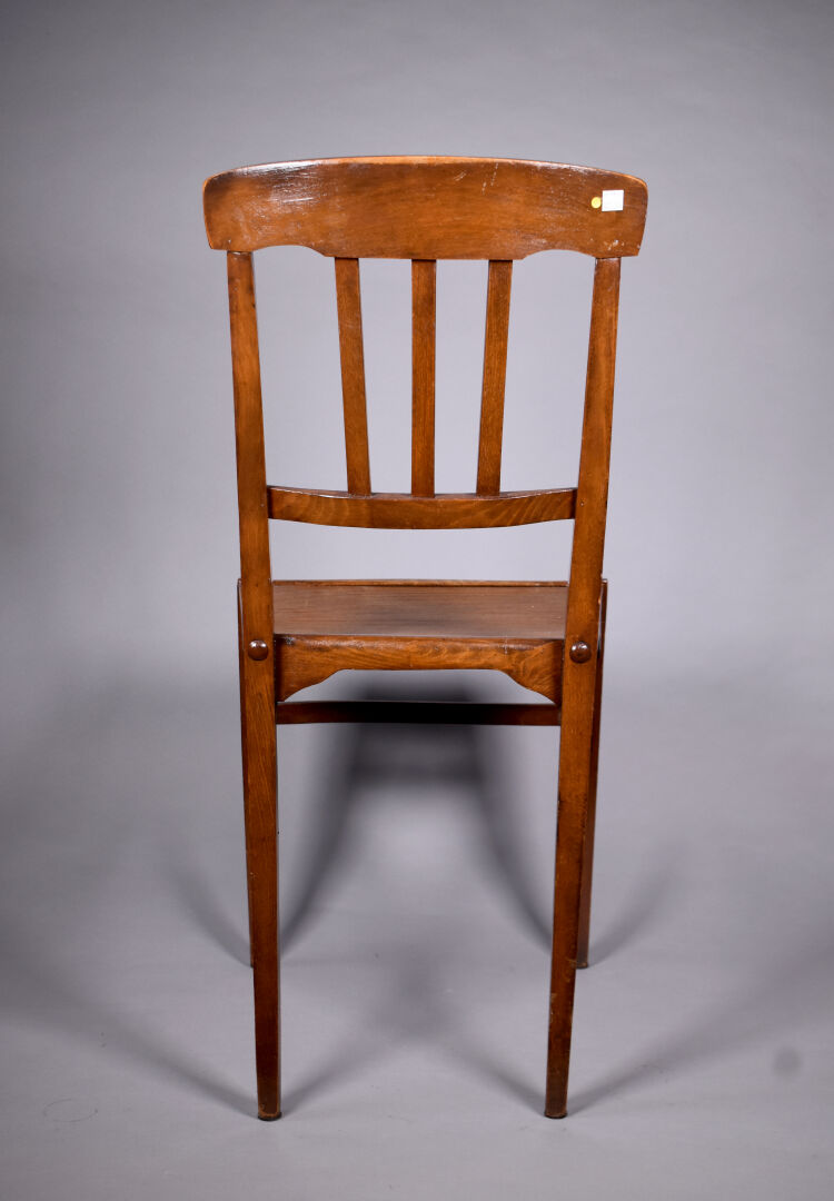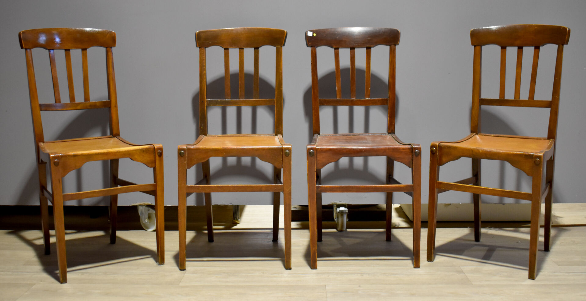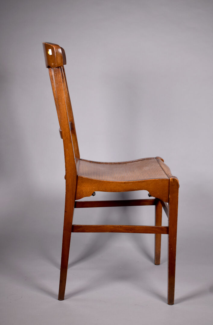 STELLA. Suite de quatre chaises en hêtre verni. Marquées. Haut. : 89 cm.