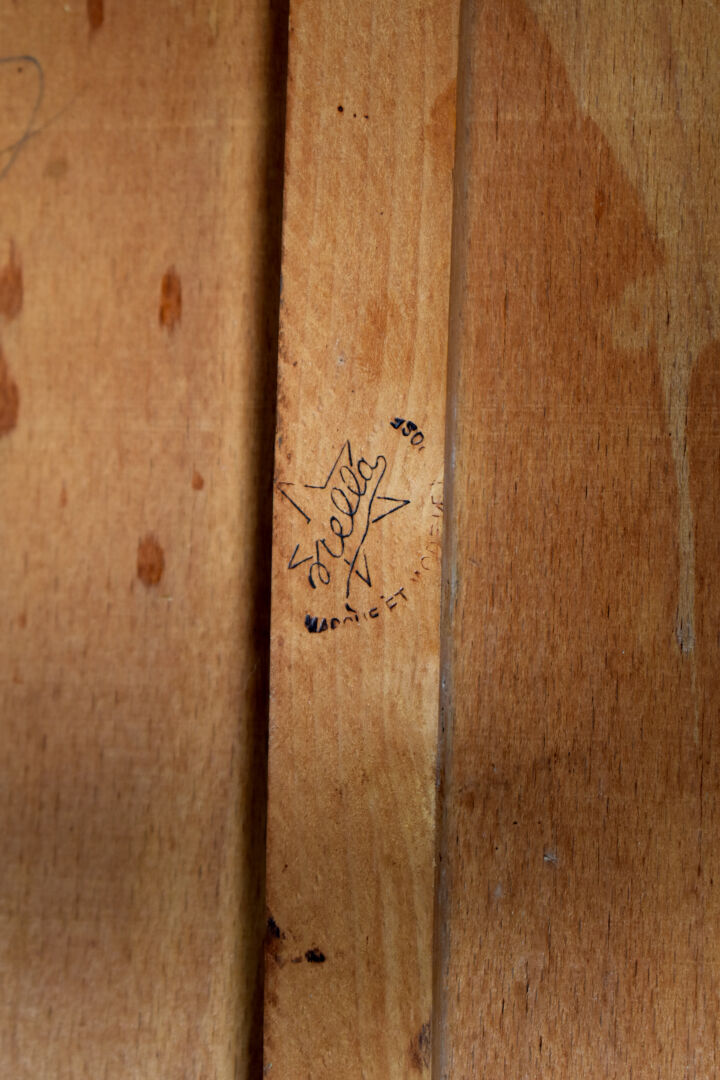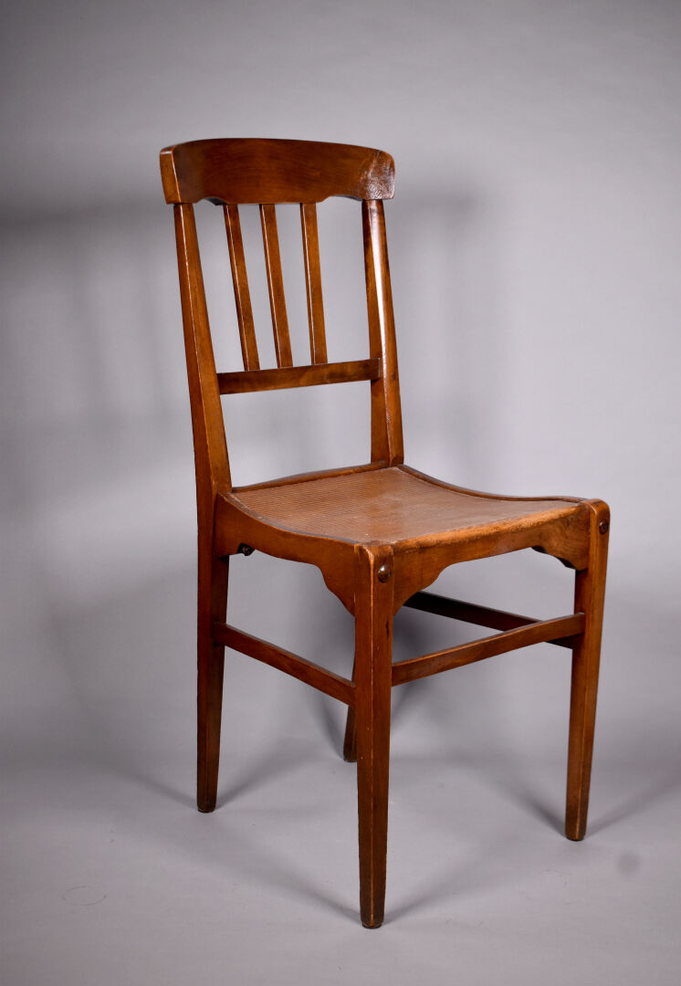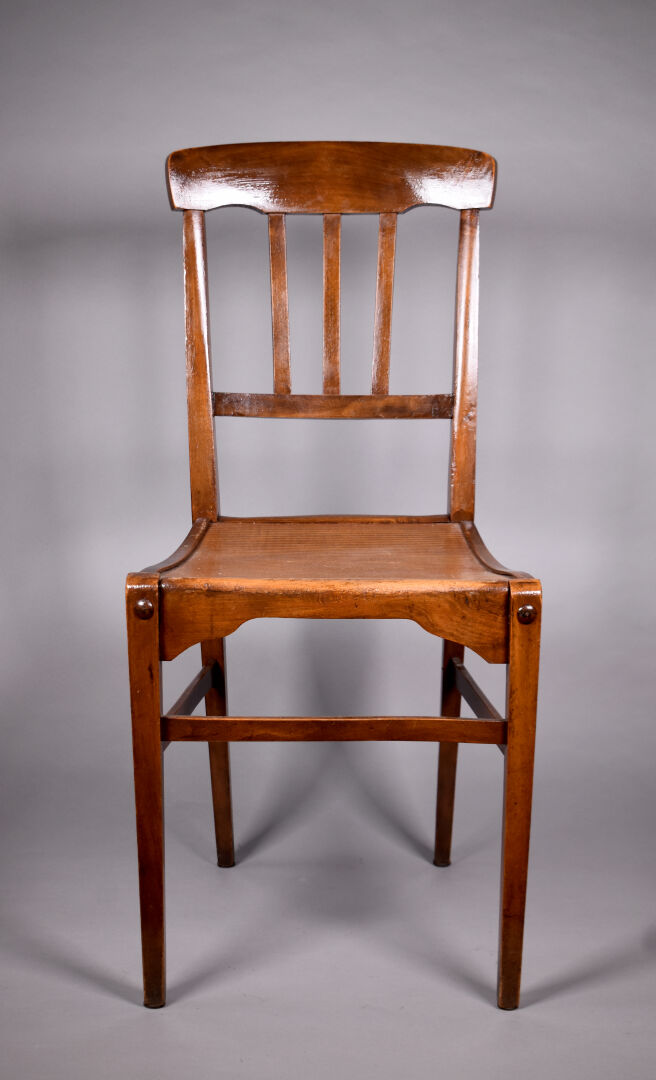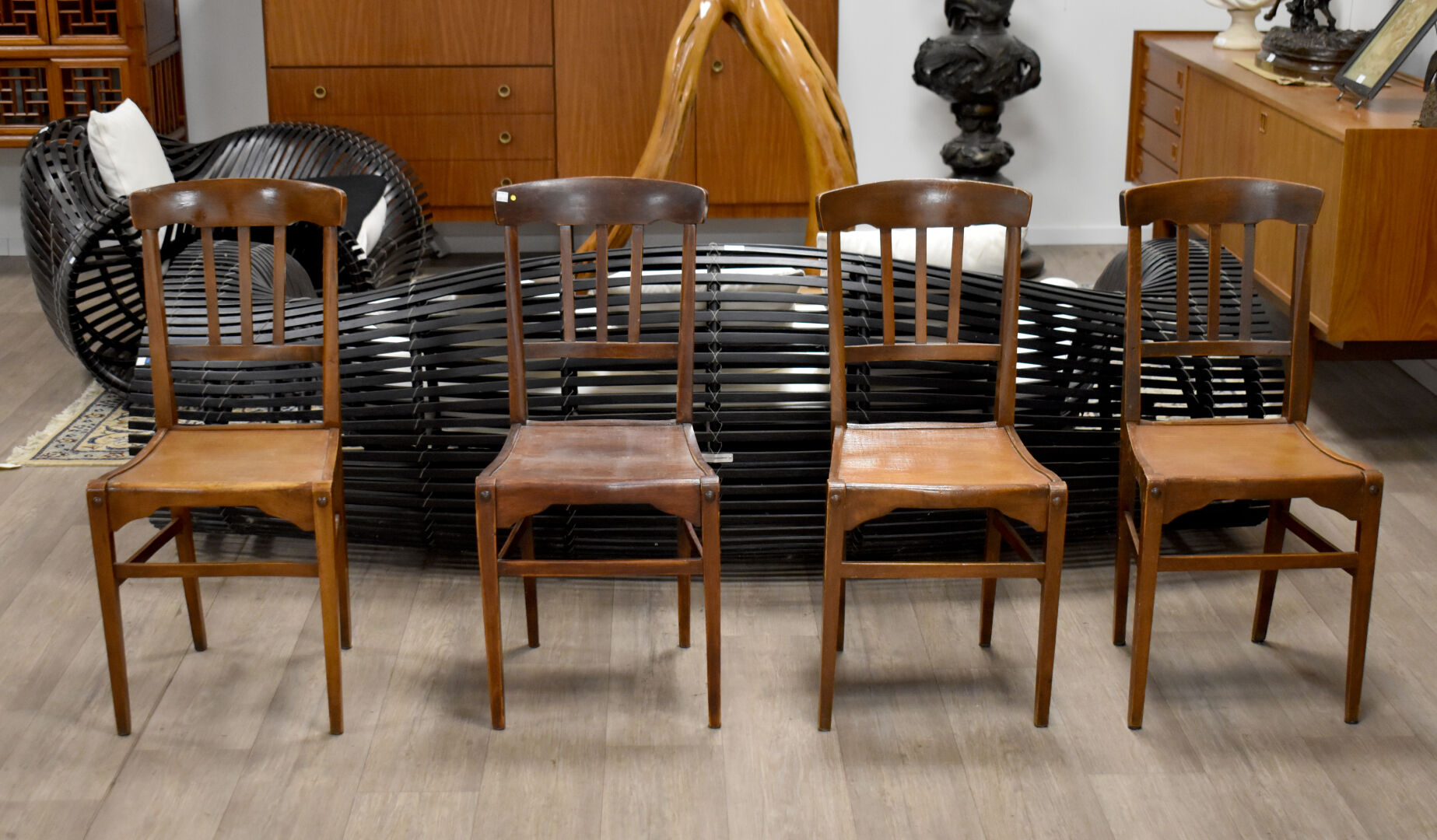 STELLA. Suite de quatre chaises en hêtre verni. Marquées. Haut. : 89 cm.