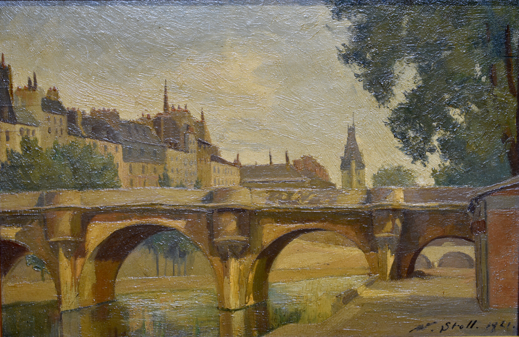STOLL (XIXe-XXe siècle). Le pont neuf à Paris. Huile sur panneau signée et datée 1921 en bas à droite. 26 x 40 cm.