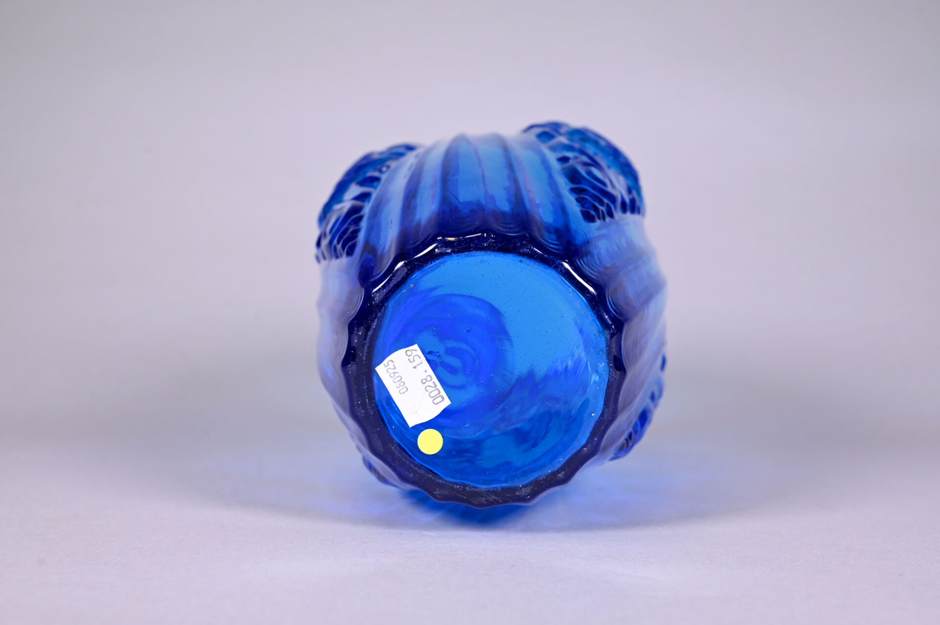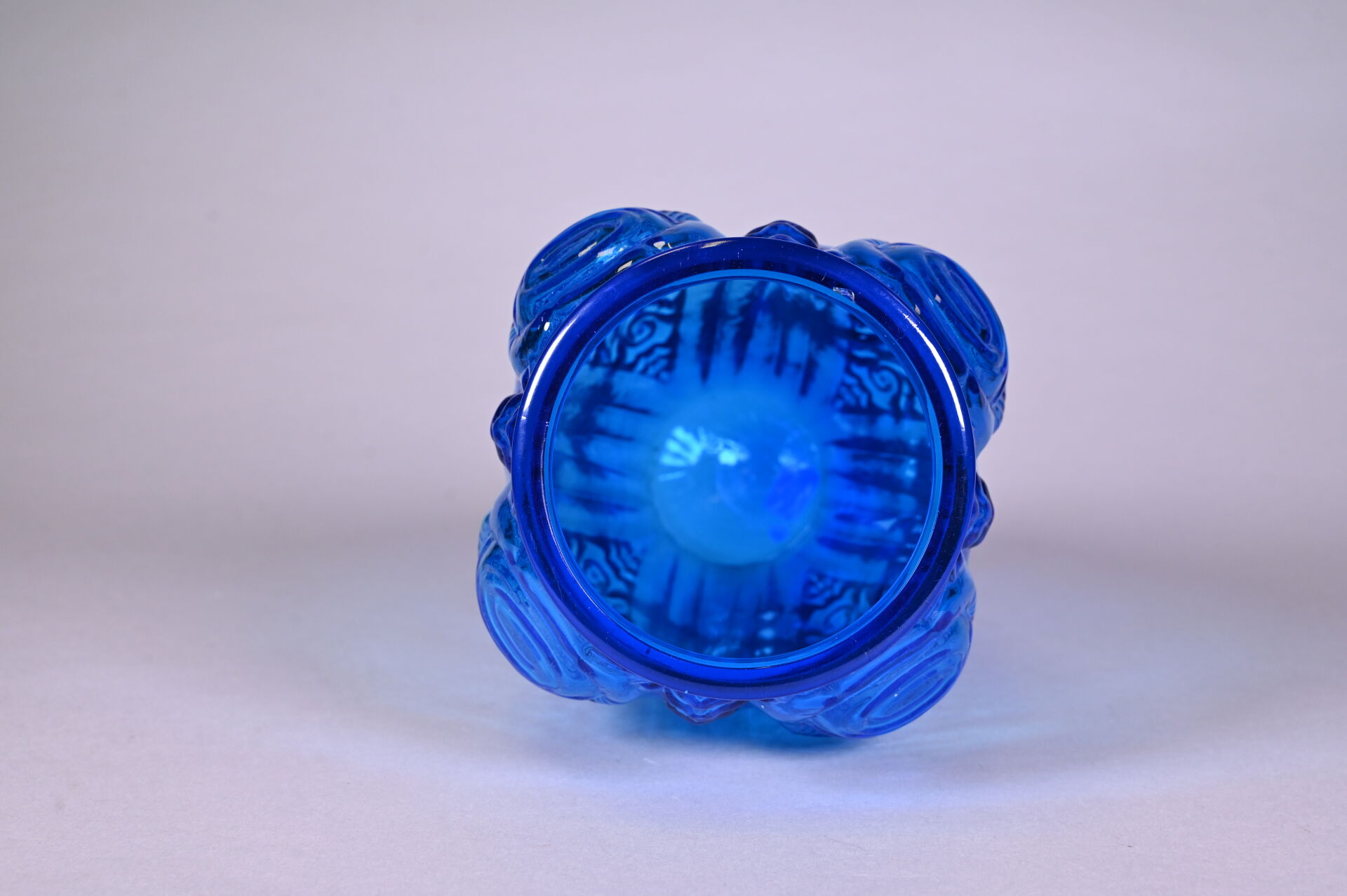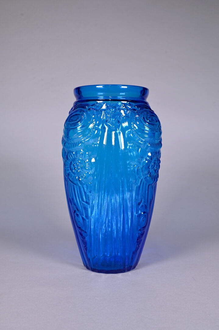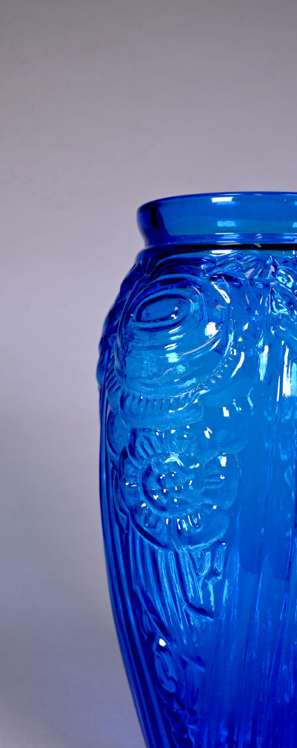 STOLLE ? Vase en verre moulé bleu cobalt à décor de fleurs et drapé géométrique (un défaut de cuisson). Epoque Art déco. Haut. : 32 cm.