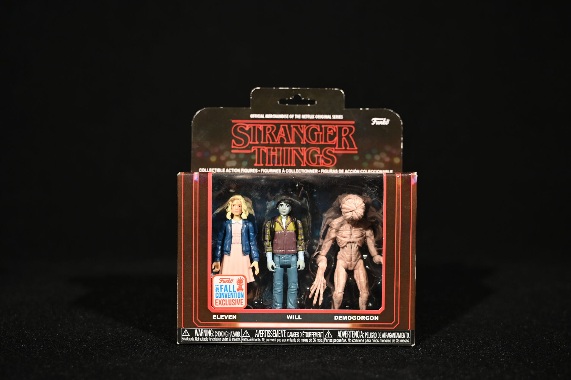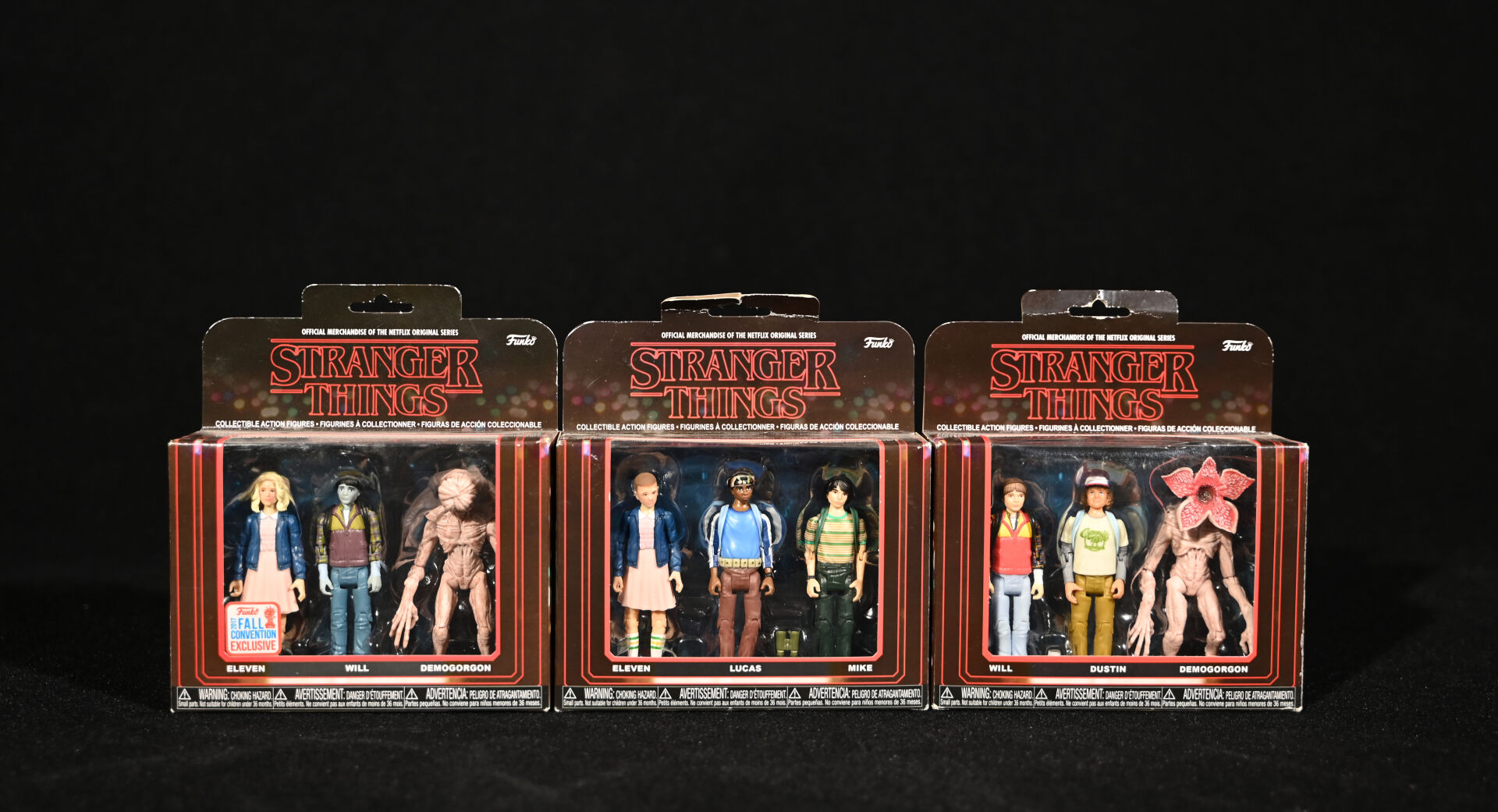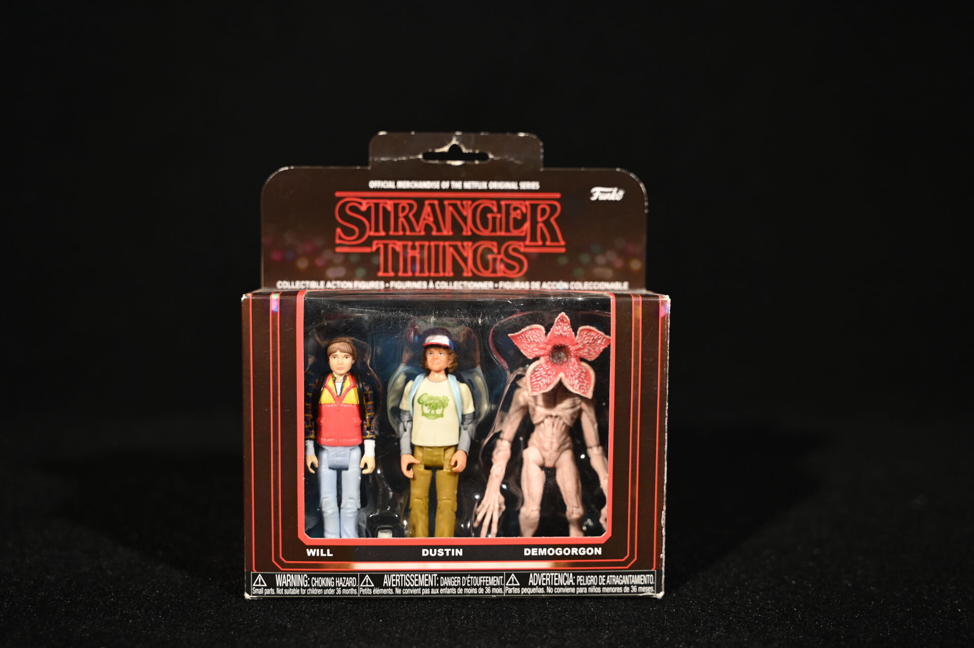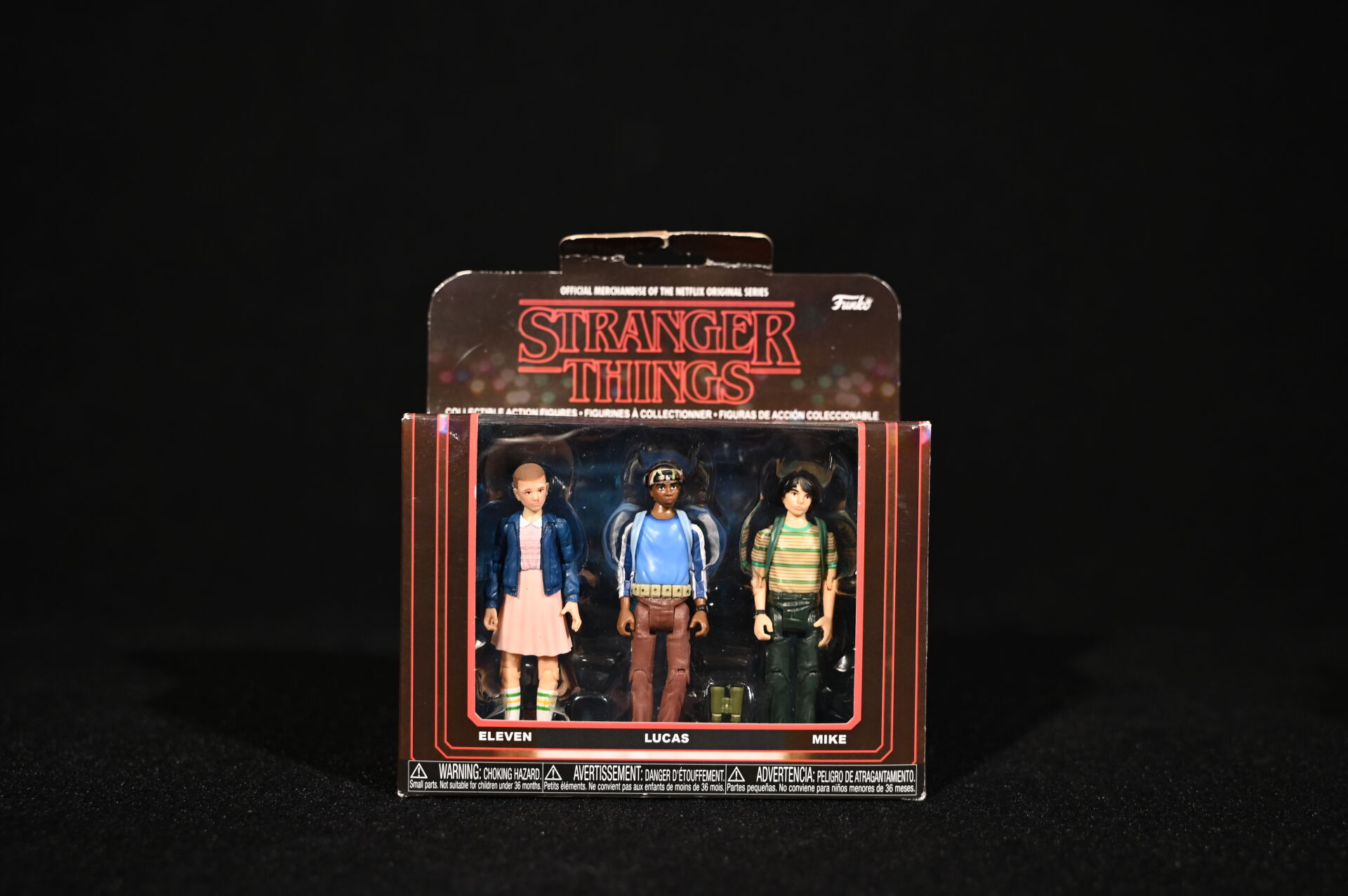 STRANGER THINGS – FUNKO. 3 boites de figurines, soit 9 personnages dont Eleven, Will, Dustin, Demogorgon et divers (boites ouvertes). 2017. Dim. d’une boîte : 18 x 16 cm.