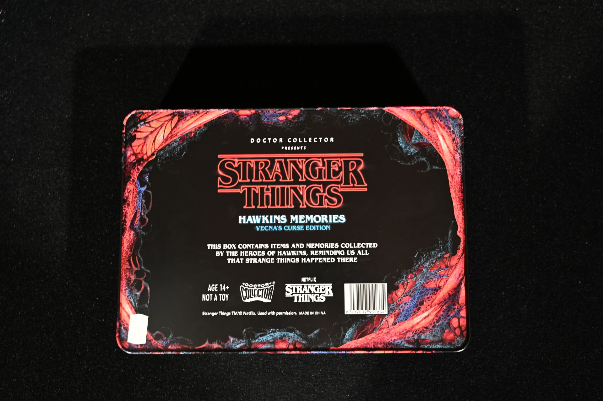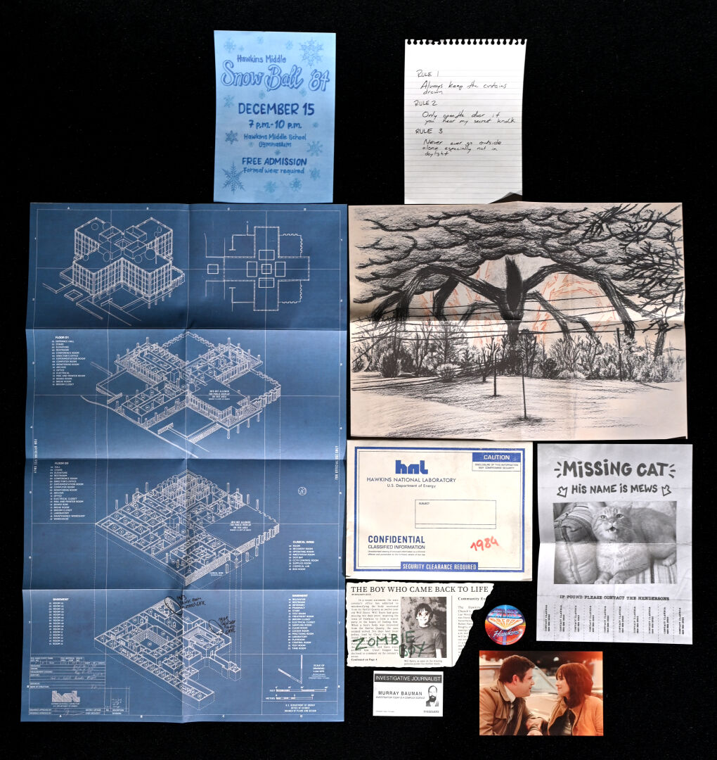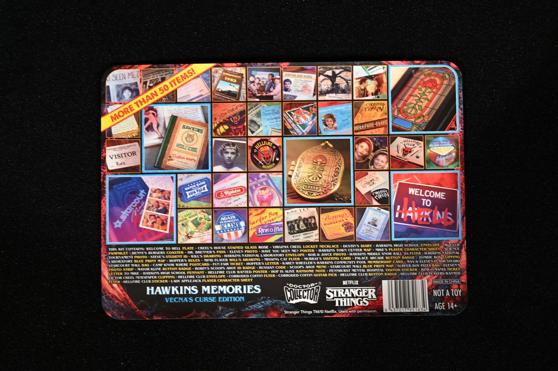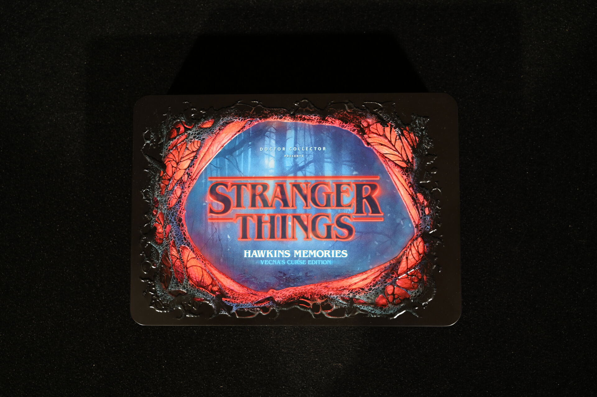STRANGERS THINGS – DOCTOR COLLECTOR. Boîte « Hawkins Memories Vecna’s Curse Edition » comprenant des objets en lien avec la série (poster, vignettes etc). On joint une boîte PANINI « Wonder Box » avec cartes et stickers. 2021. Dim. de la boîte : 22 x 31 cm. Aucune information sur la complétude.