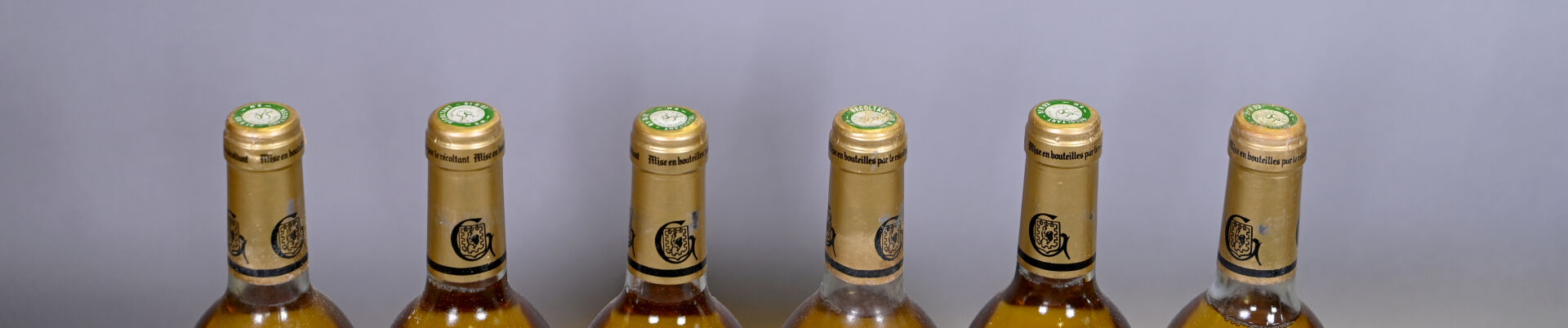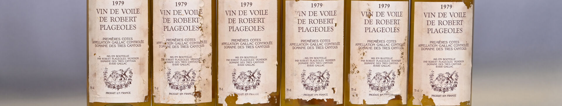 SUD-OUEST – 1 CBO, 6 bouteilles, Vin de Voile de Robert Plageoles, 1979. 2 BG, 1 BG (-) et 1 TLB. Capsules légèrement sales et légèrement abimées. Etiquettes sales et dégradées.