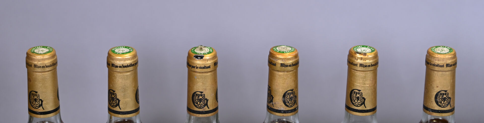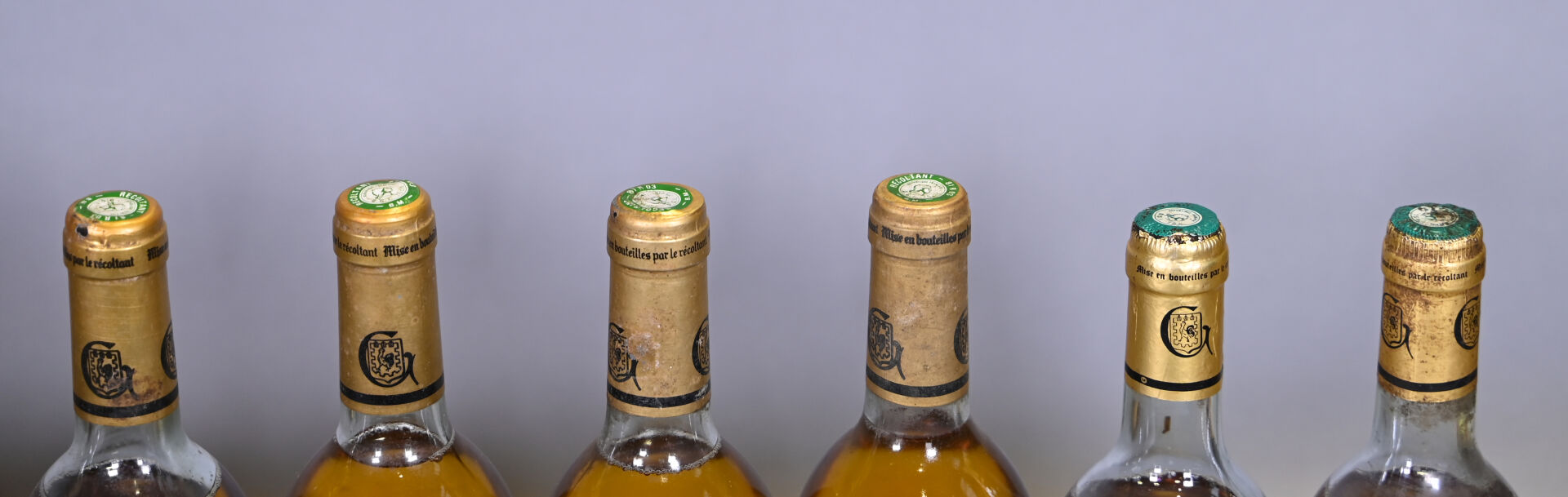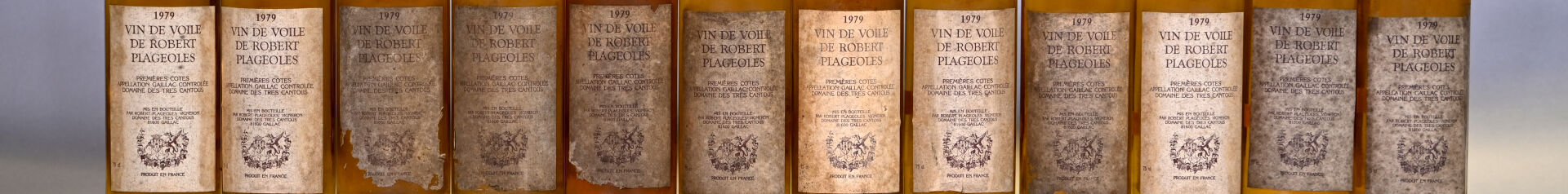 SUD-OUEST – 12 bouteilles, Gaillac, Vin de Voile de Robert Plageoles, 1979 (dont une bouteille supposée de ce millésime). 4 BG, 3 BG (-), 1 TLB, 2 HE et 2 ME (+). Capsules légèrement sales à sales dont quatre sont abimées. Etiquettes sales à très sales avec des points de décollement dont une est entièrement décollée et dont cinq sont légèrement abimées à abimées.