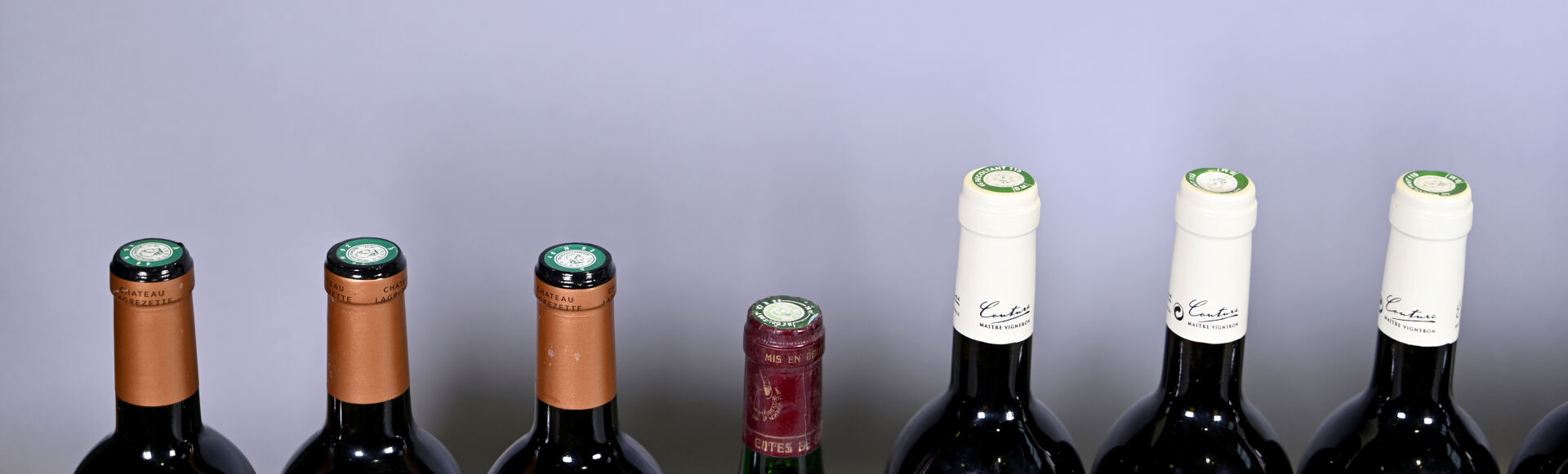 2 bouteilles, Côtes de Duras, Domaine de Laulan, 1990. 2 BG. Capsules légèrement sales. Etiquettes légèrement sales dont une est abimée. Une étiquette présente des points de décollement et l’autre est entièrement décollée.