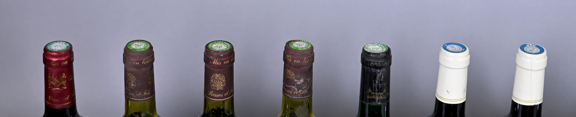 6 bouteilles, Cahors, Château La Caminade, La Commandery, 1990. 2 BG, 2 TLB (+), 1 TLB et 1 HE (+). Capsules légèrement sales dont deux sont abimées. Etiquettes légèrement sales à sales avec des points de décollement.