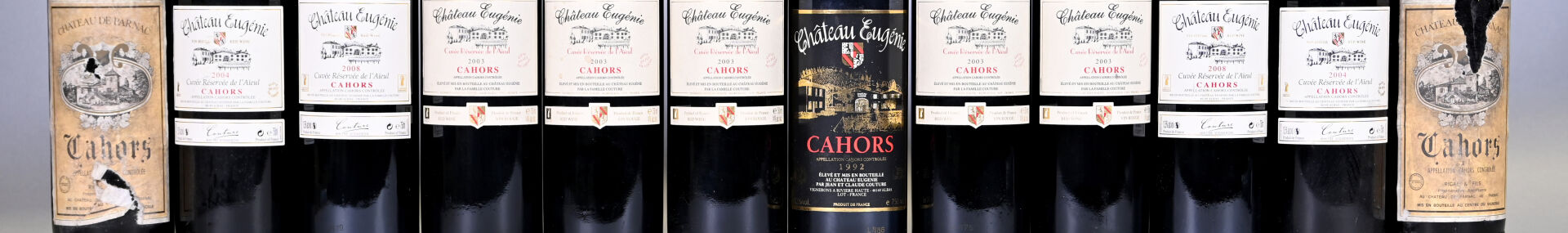 9 bouteilles, Cahors, Château Eugénie, Cuvée Réservée de l’Aïeul, 2003 (5), 2004 (2) et 2008 (2). En l’état.