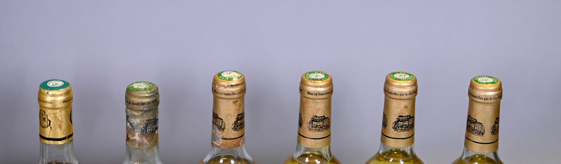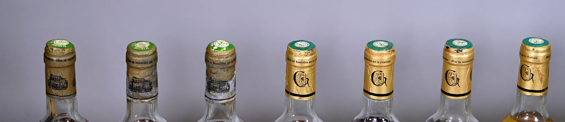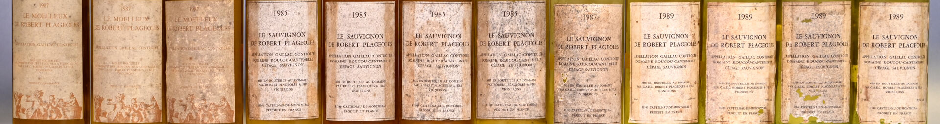9 bouteilles, Gaillac, Le Sauvignon de Robert Plageoles, 1985 (4), 1987 (1) et 1989 (4). 2 BG (-), 1 TLB (+), 1 TLB, 1 TLB (-), 1 HE, 2 ME (+) et 1 ME. Capsules légèrement sales à très sales dont deux sont abimées. Etiquettes sales avec des traces d’humidité et des points de décollement et dont cinq sont abimées.