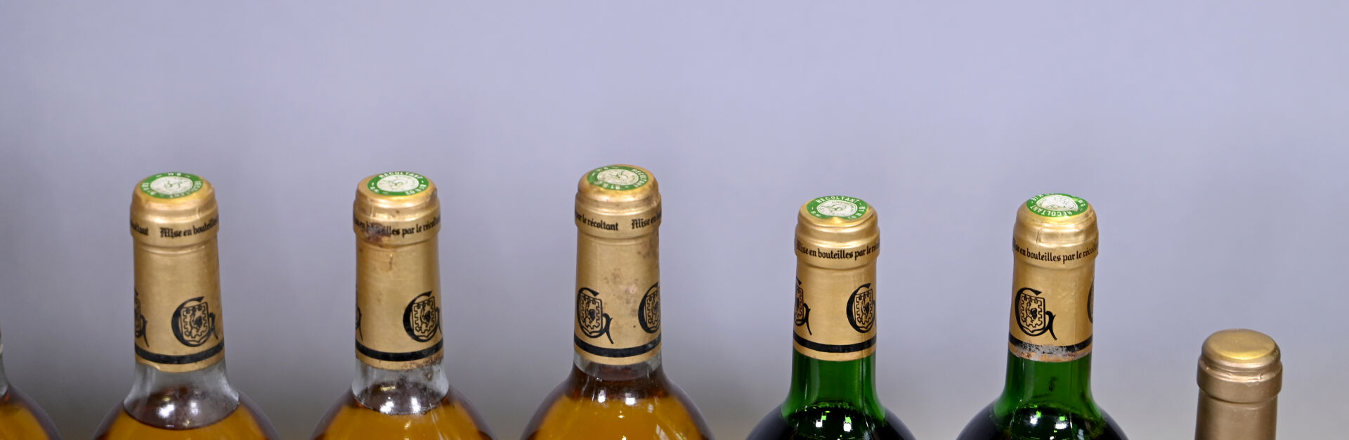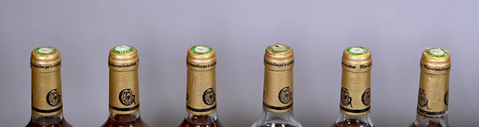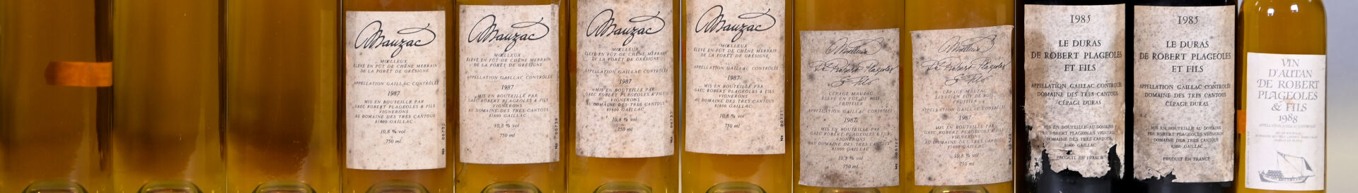 6 bouteilles, Gaillac, Robert Plageoles et fils, Mauzac, Moelleux, 1987. 2 BG (-), 1 TLB (+), 1 TLB et 1 HE. Capsules légèrement sales à sales dont une est abimée en son sommet. Etiquettes sales avec des points de décollement.