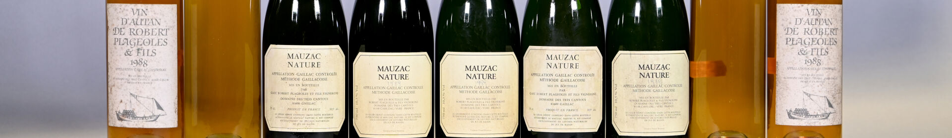 5 bouteilles, Gaillac, Robert Plageoles et fils, Mauzac Nature, Méthode Gaillacoise. Une étiquette partiellement décollée. 4 niveaux très légèrement bas et 1 niveau légèrement bas. Coiffes très légèrement sales. Etiquettes légèrement sales dont trois portent une inscription manuscrite et une présente une petite déchirure.