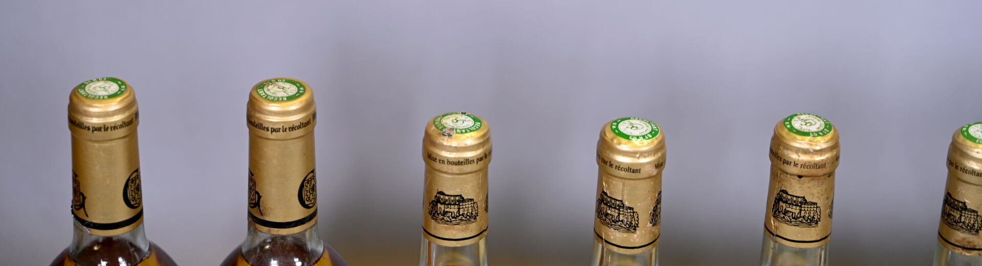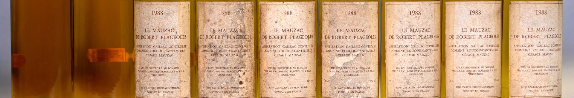 7 bouteilles, Gaillac, Le Mauzac de Robert Plageoles, 1988. 1 BG, 4 TLB (+) et 2 TLB. Capsules légèrement déformées en leur sommet, légèrement sales et dont deux sont légèrement abimées.