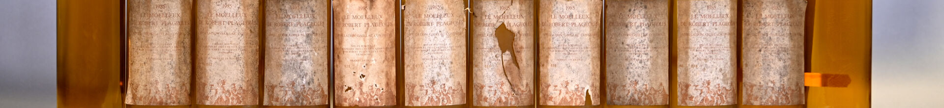 SUD-OUEST – Ensemble de 12 bouteilles composé de : 9 bouteilles, Gaillac, Le Moelleux de Robert Plageoles, 1985. 1 TLB, 3 HE (+), 2 HE, 3 HE (-) et 1 ME (+). Capsules légèrement sales à sales dont trois sont légèrement abimées. Etiquettes sales à très sales avec des traces d’humidité et des points de décollement et dont quatre sont légèrement dégradées à dégradées. 2 bouteilles, présumé Gaillac, Moelleux, présumé Robert Plageoles, référence ? Millésime ? 1 BG et 1 TLB (+). Etiquettes manquantes.