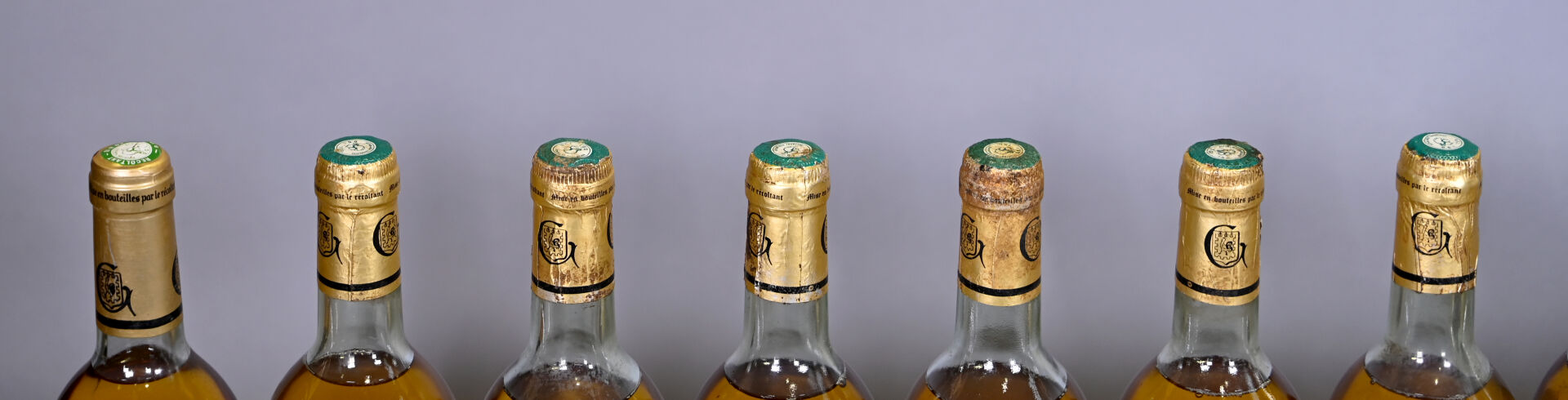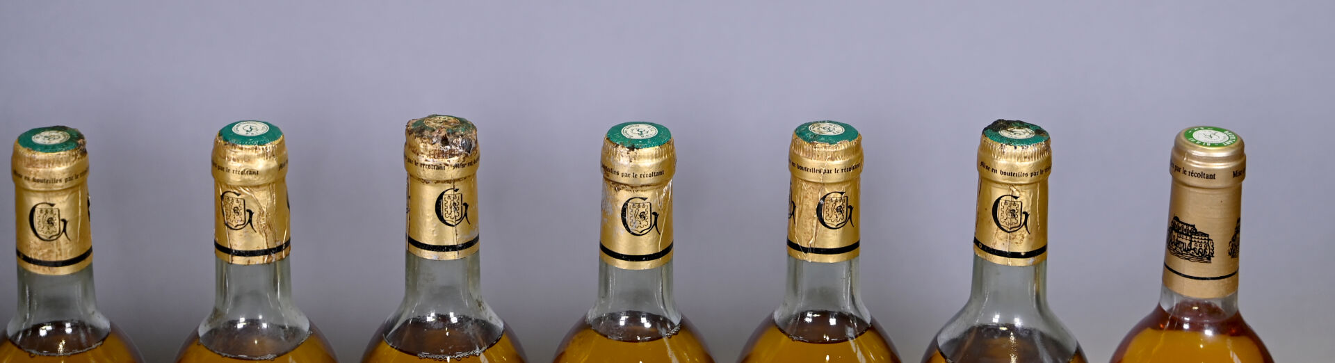 9 bouteilles, Gaillac, Le Moelleux de Robert Plageoles, 1985. 1 TLB, 3 HE (+), 2 HE, 3 HE (-) et 1 ME (+). Capsules légèrement sales à sales dont trois sont légèrement abimées. Etiquettes sales à très sales avec des traces d’humidité et des points de décollement et dont quatre sont légèrement dégradées à dégradées.