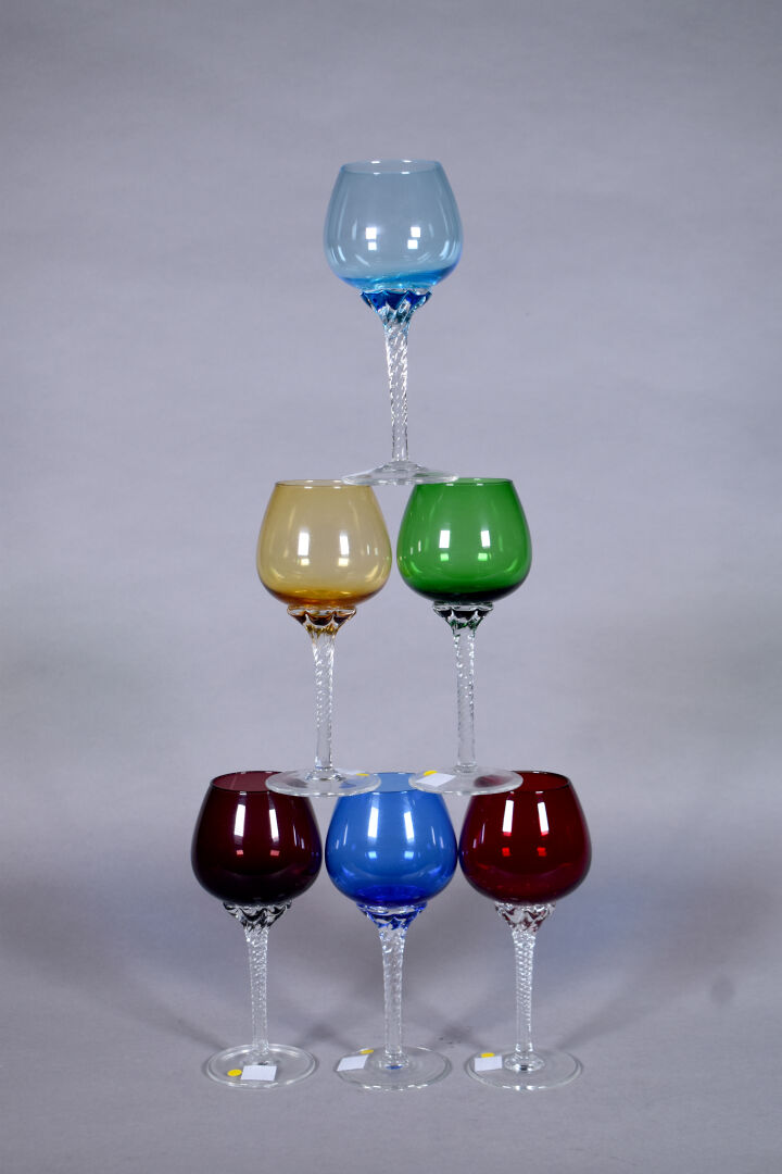 Suite 6 verres en cristal de couleur soit un rouge, un rose, un jaune, un vert et deux bleu. Haut. : 18,5 cm.