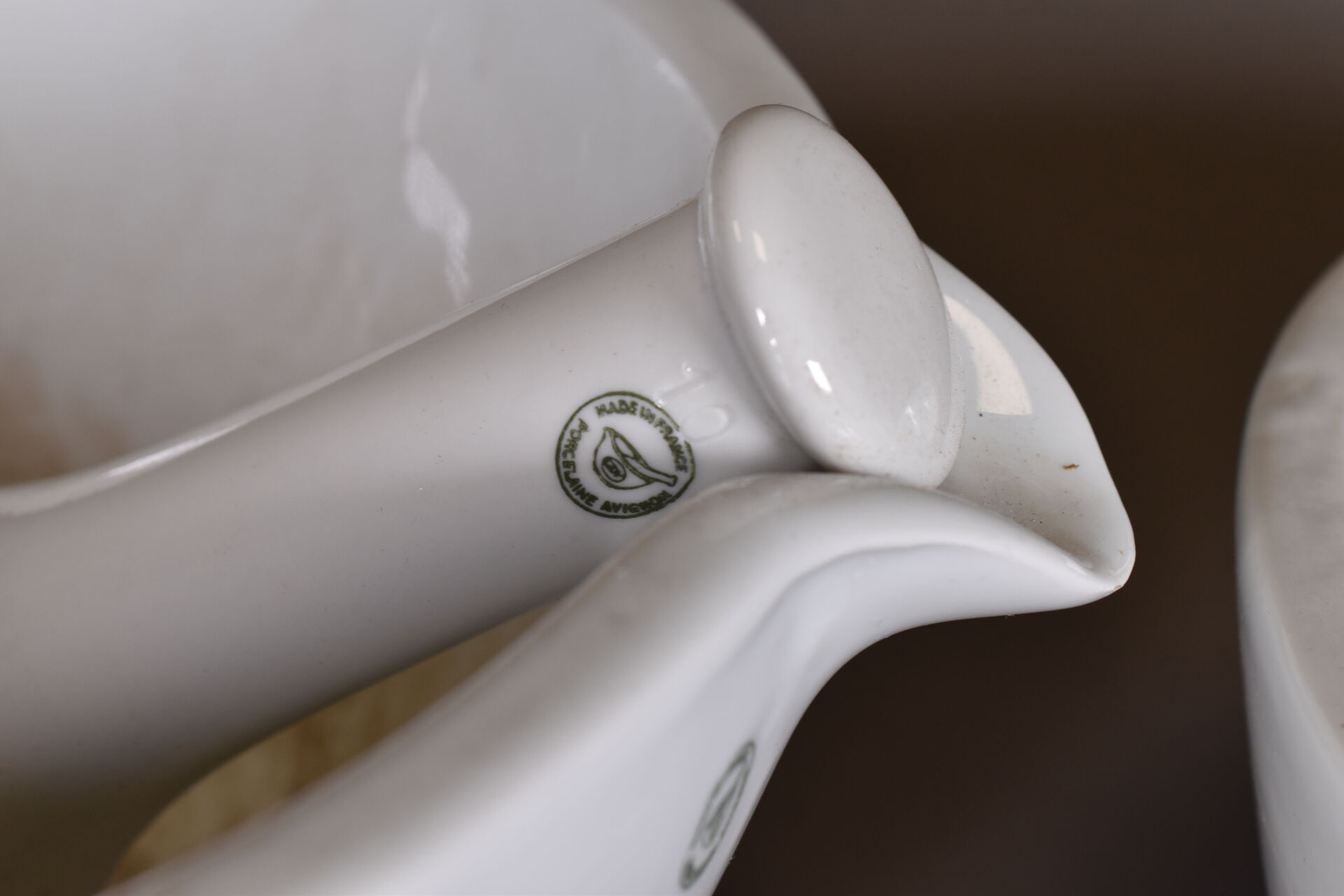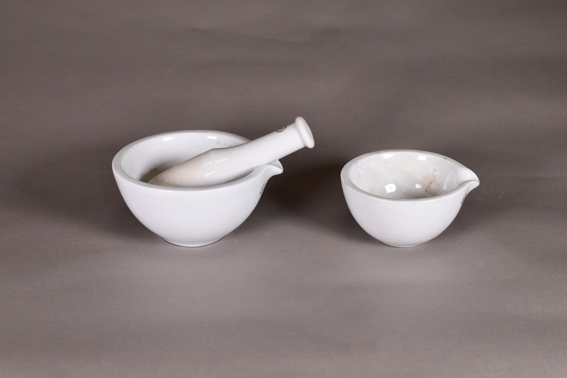 Suite 8 de mortiers et 7 pilons en porcelaine blanche d’Avignon et leurs pilon. Diam. du plus grand. : 35 cm. Diam. du plus petit. : 17 cm.