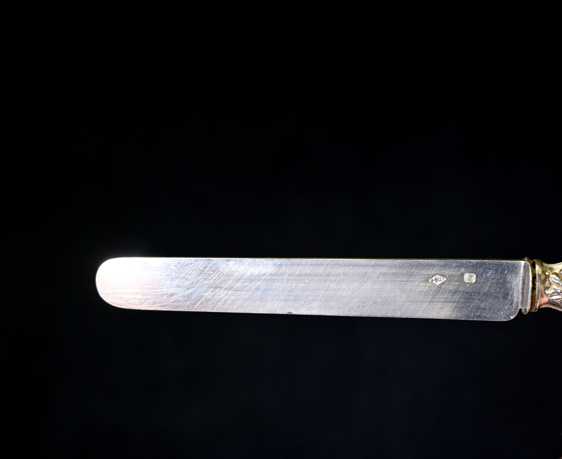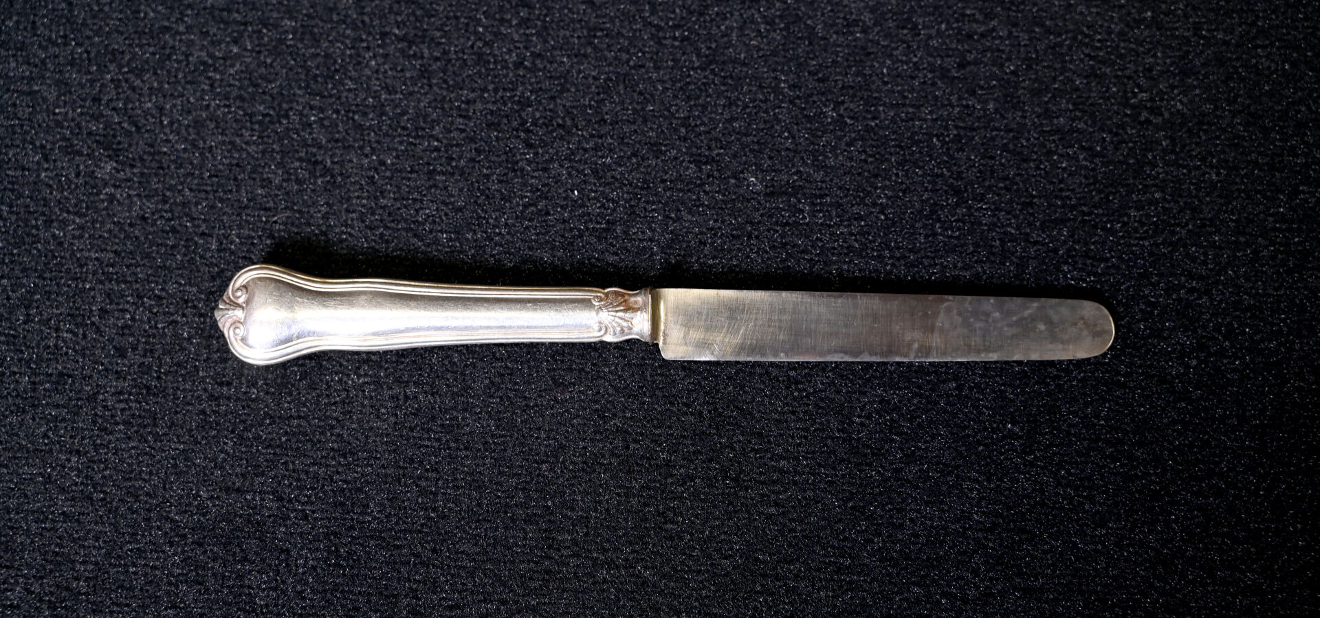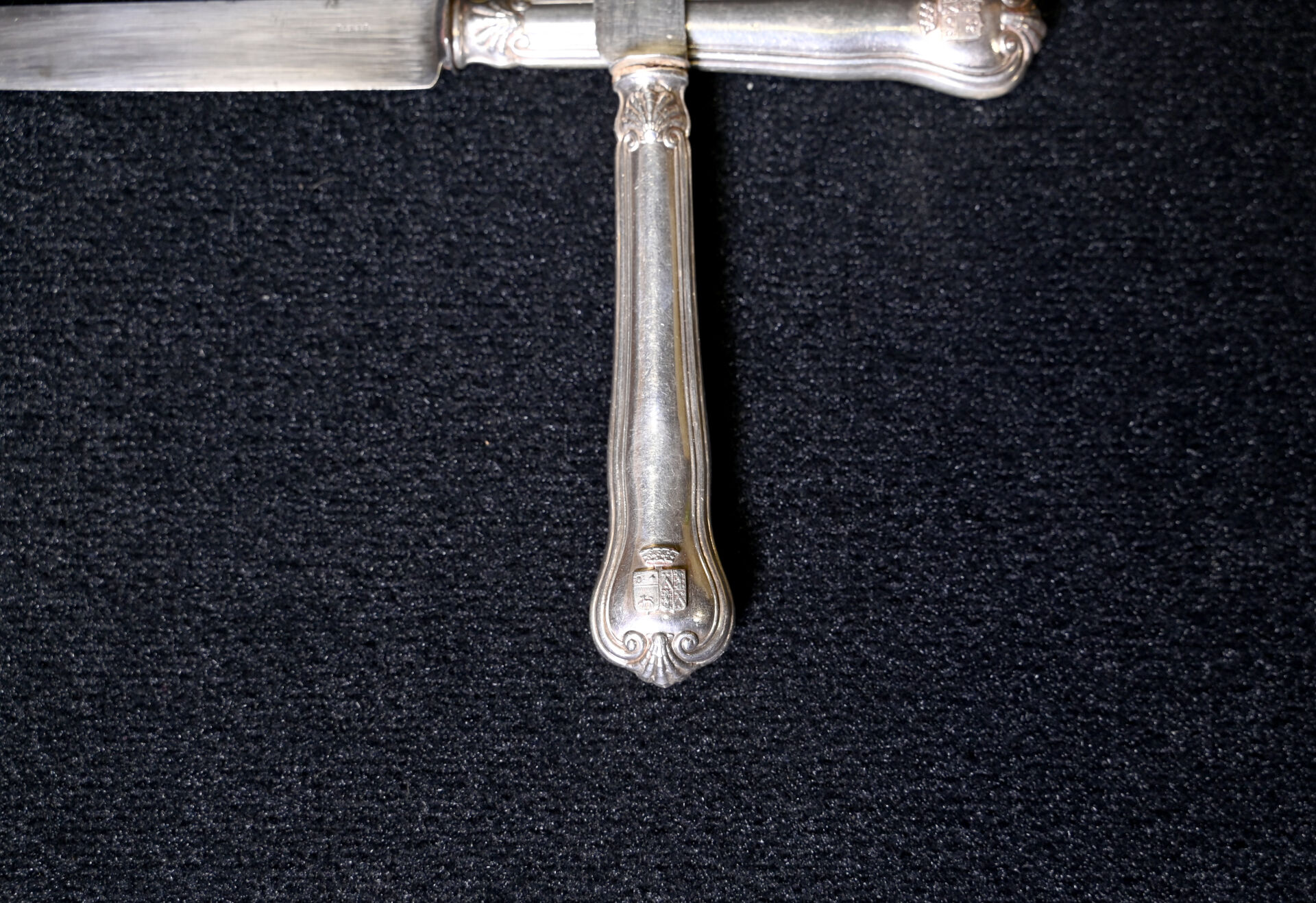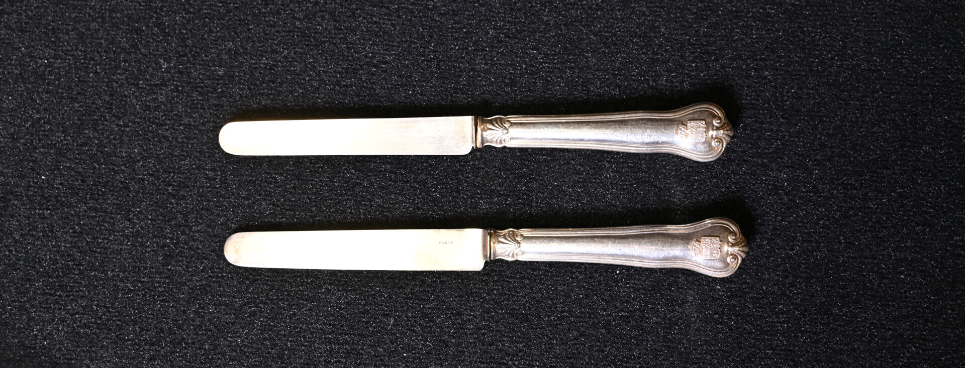 Suite de 12 couteaux à fruits à lames en argent 925/1000e (poinçon Minerve) et manches en argent fourré à décor d’armoiries sous une couronne de baron. Poids brut total . : 521 g. Ecrin. On joint 12 couteaux du même modèle avec manches en argent fourré et lames en métal.