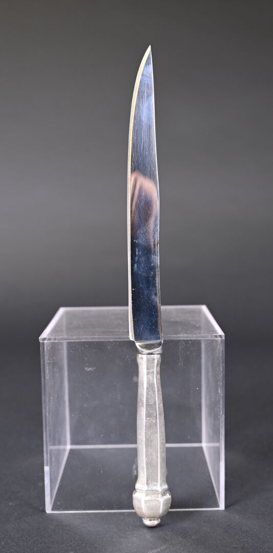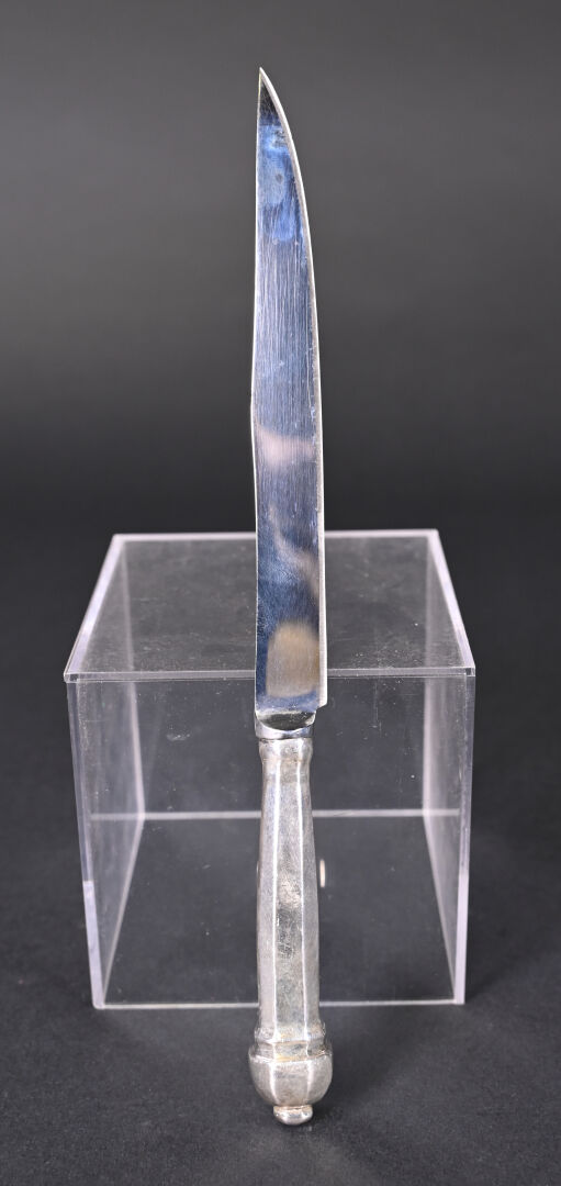 Suite de 12 couteaux à viande à manches en argent fourré. Poids brut total. : 1791 g. Ecrin.