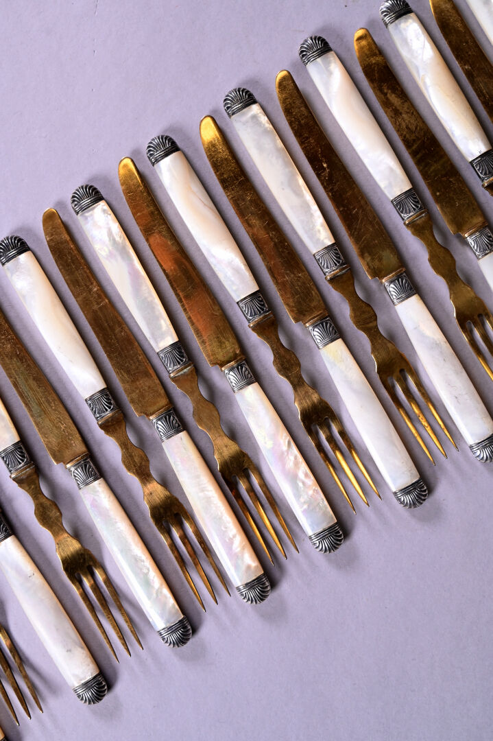 Suite de 12 couverts à melon (?) en métal doré, les manches en nacre à viroles et pointes en argent. Epoque Art déco. Poids brut total. : 530 g.