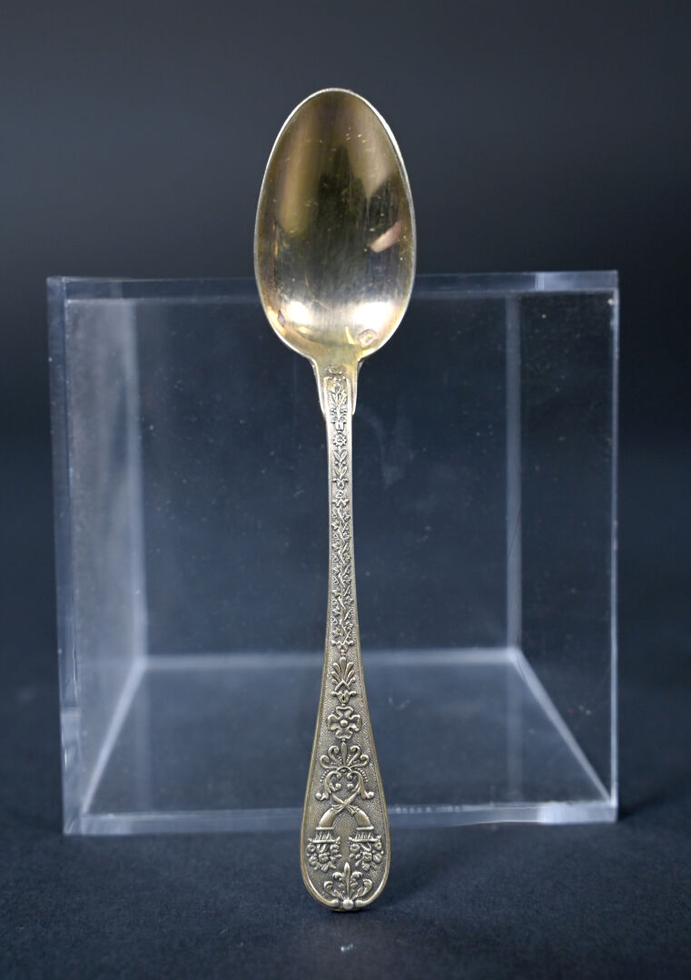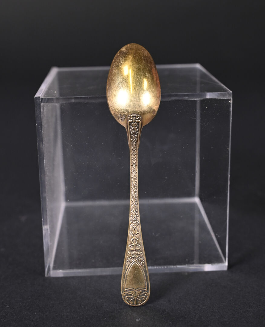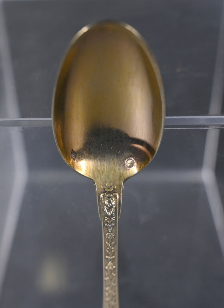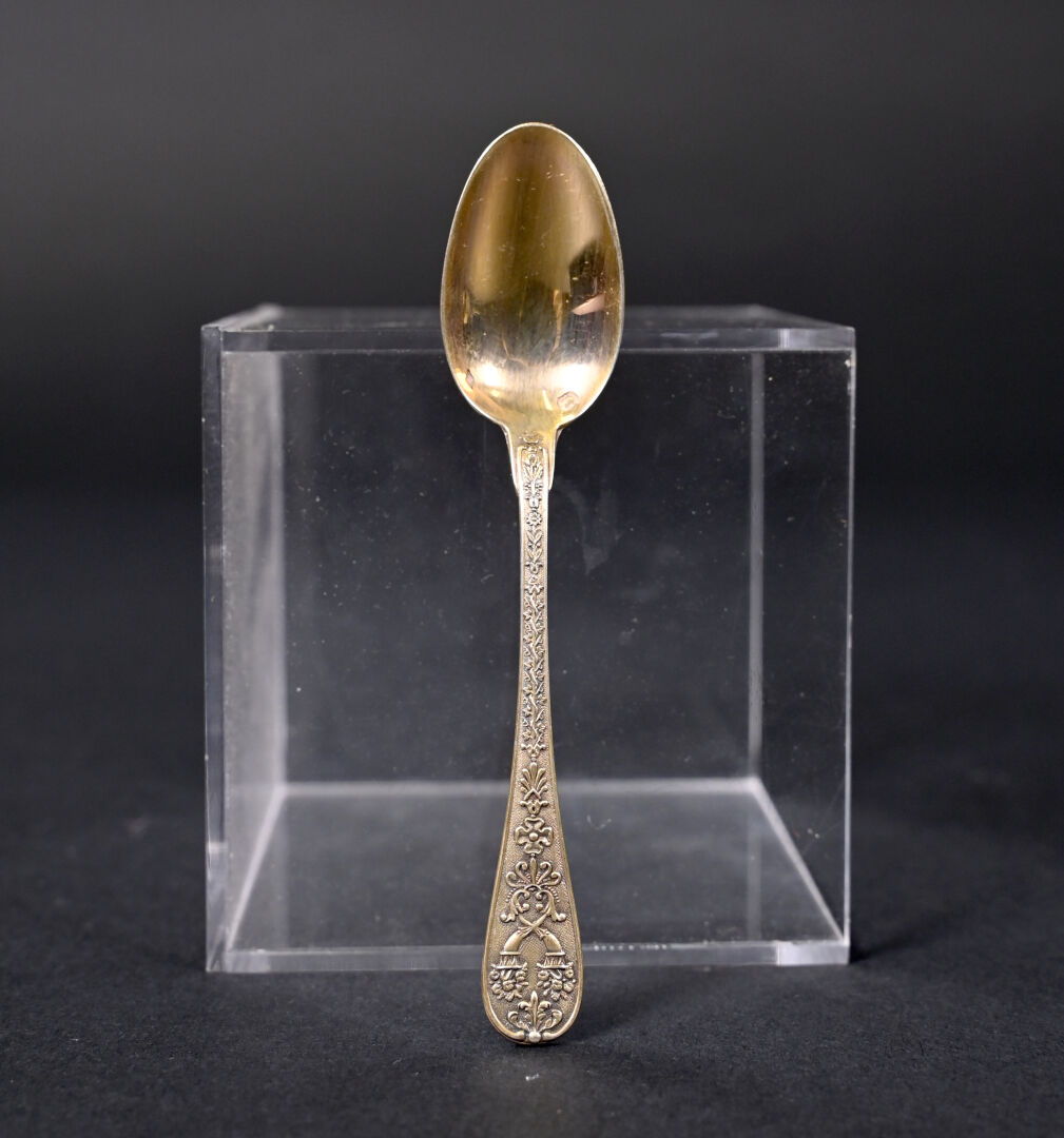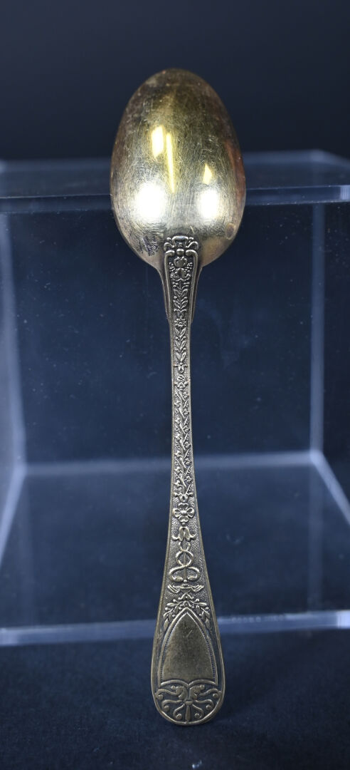 Suite de 12 cuillères à moka en argent doré 925/1000e à décor de caducée et cornes d’abondance. Poids total. : 156 g. Ecrin.