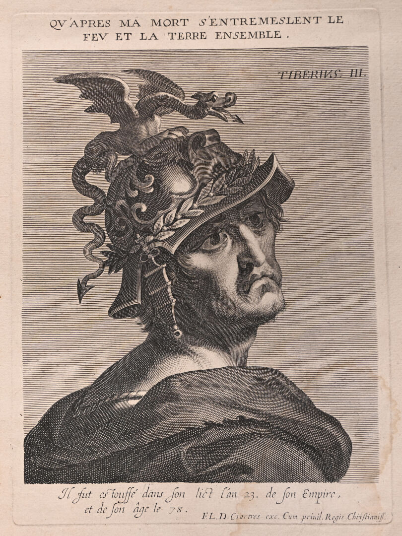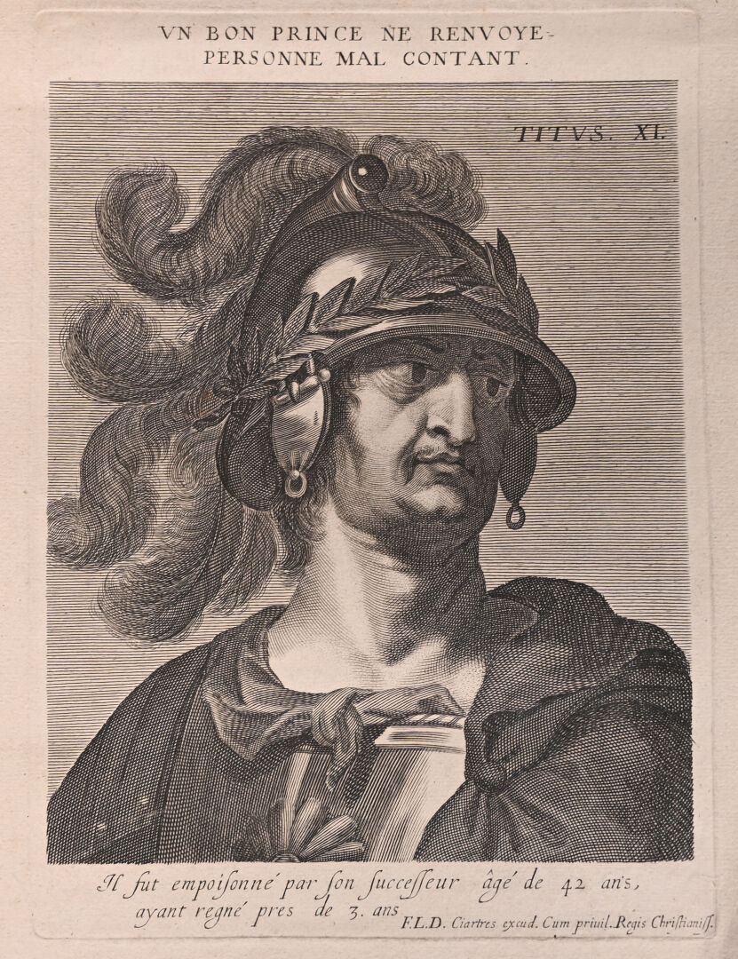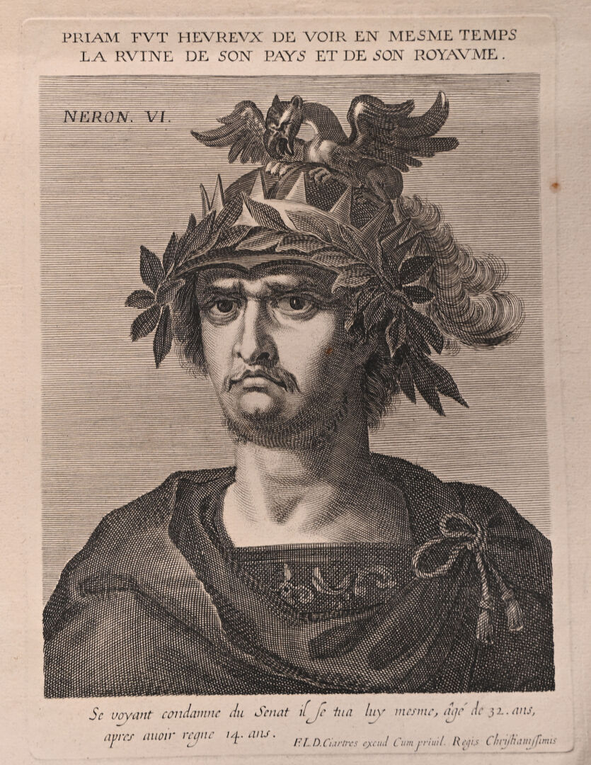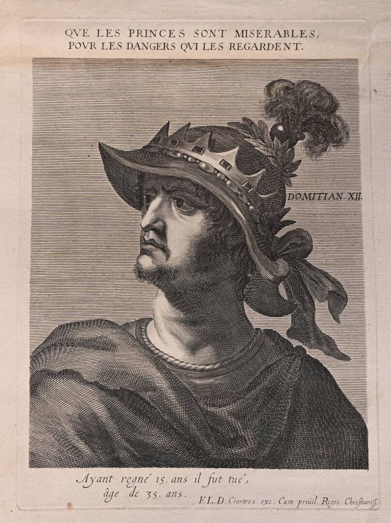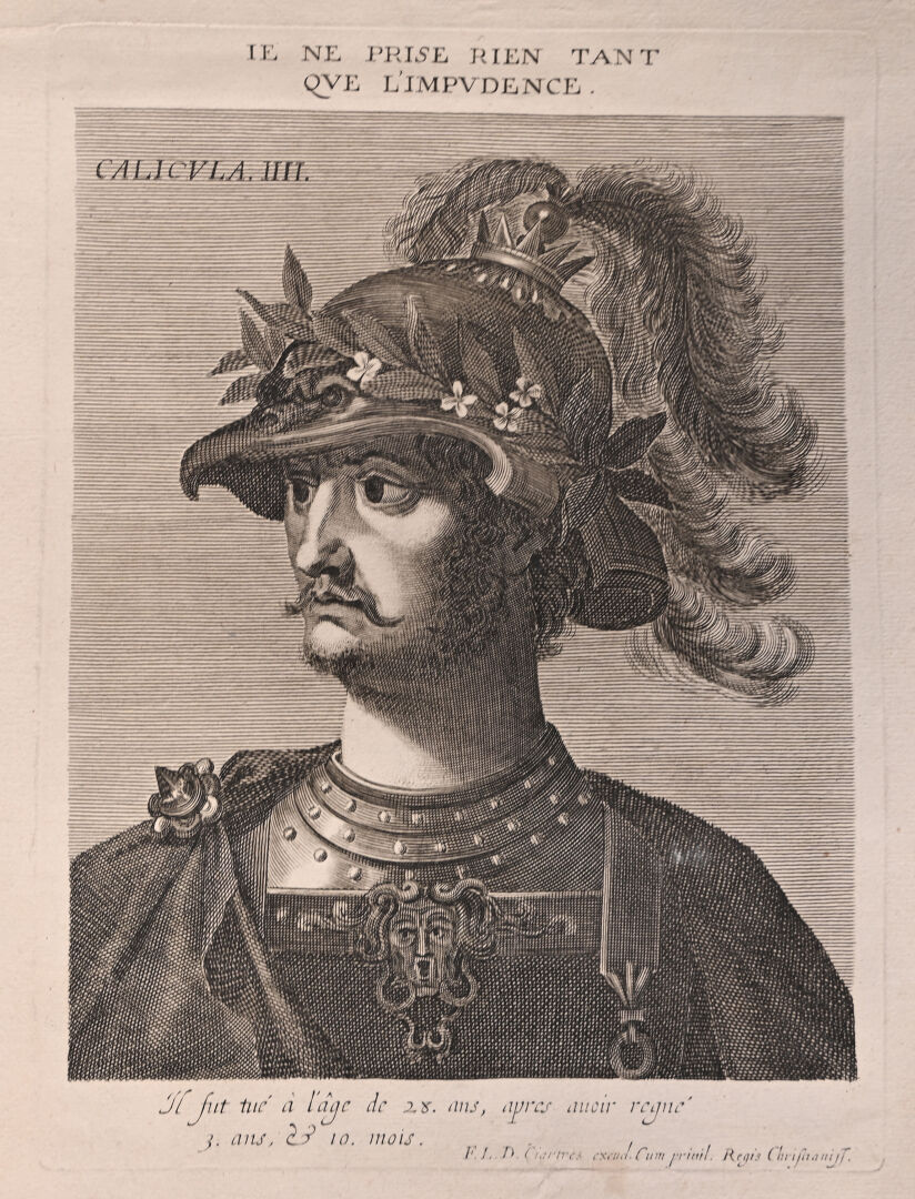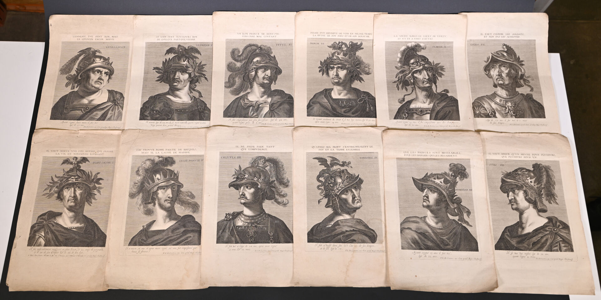 Suite de 12 gravures au burin représentant les empereurs romains (rousseurs mouillures). 40,5 x 25,5 cm.