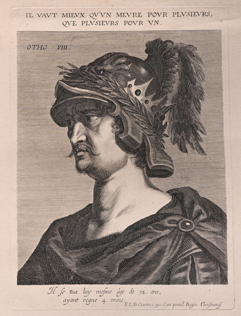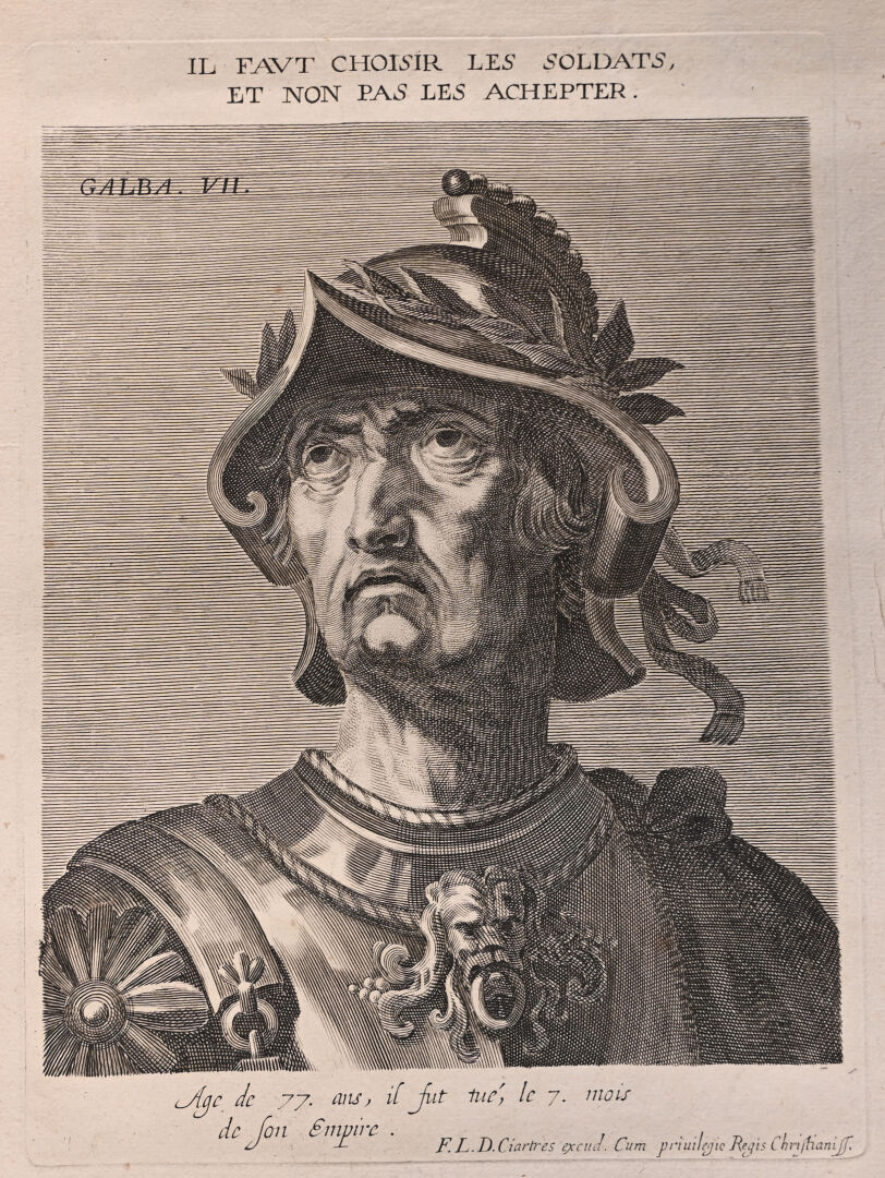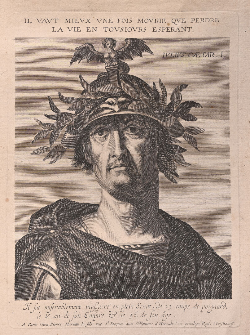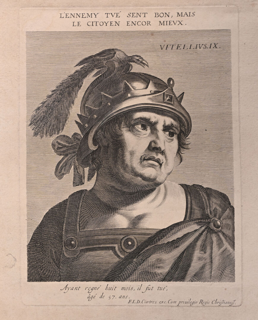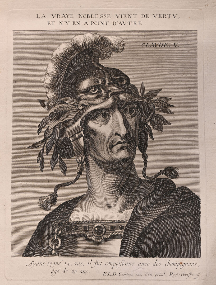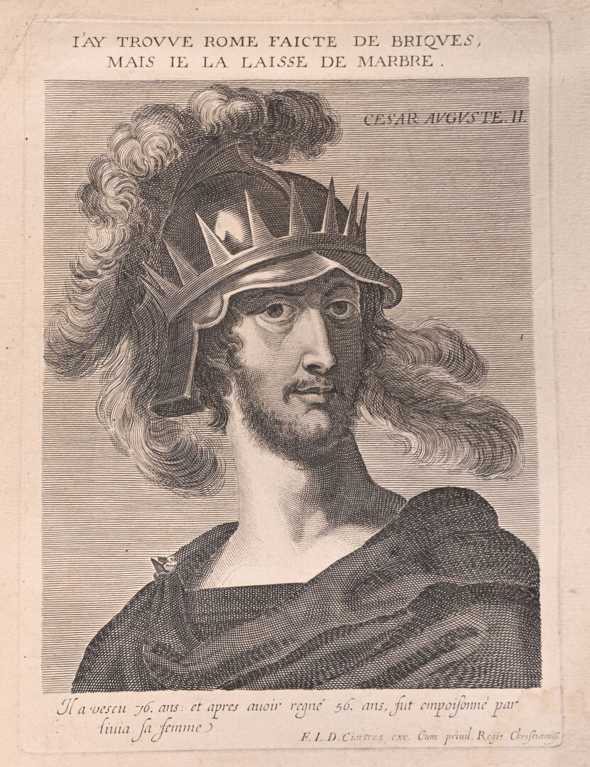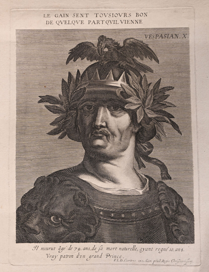 Suite de 12 gravures au burin représentant les empereurs romains (rousseurs mouillures). 40,5 x 25,5 cm.