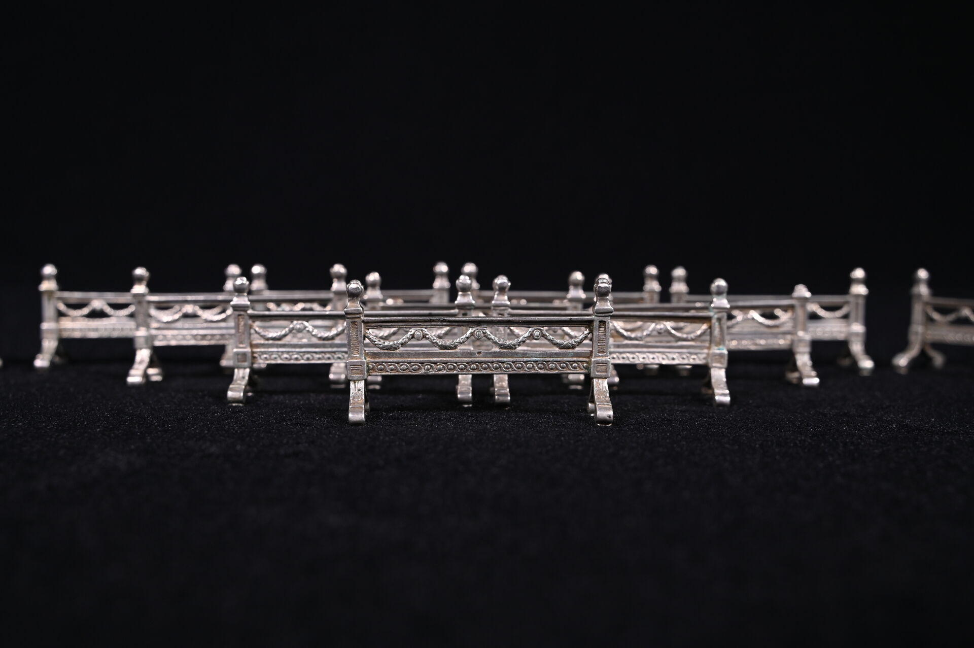 Suite de 12 porte-couteaux en argent 925/1000e à décor de guirlandes de laurier. Poids total. : 285 g. A charge : les lots seront poinçonnés après la vente, et seront récupérables à partir du mardi 14 avril.