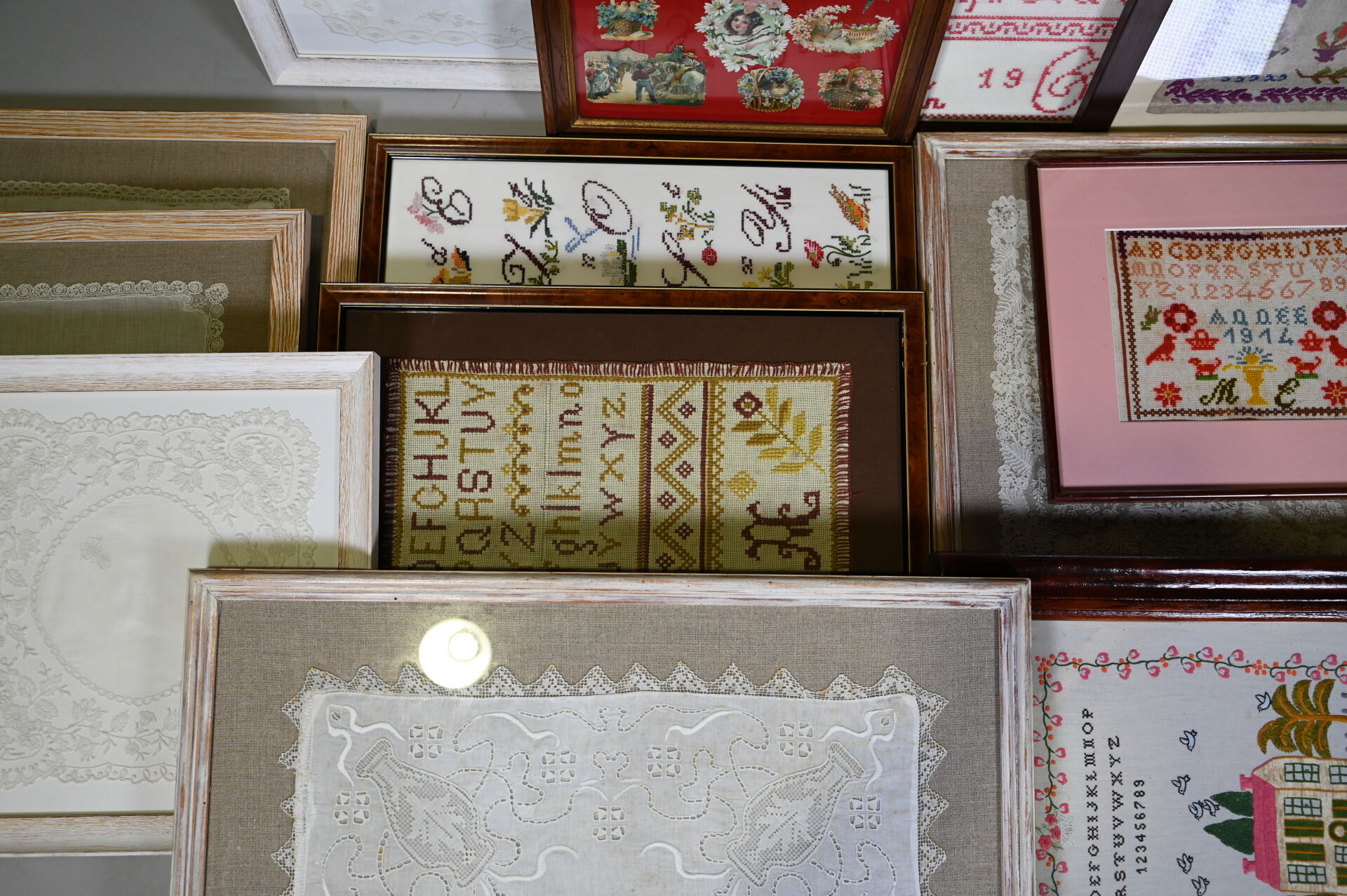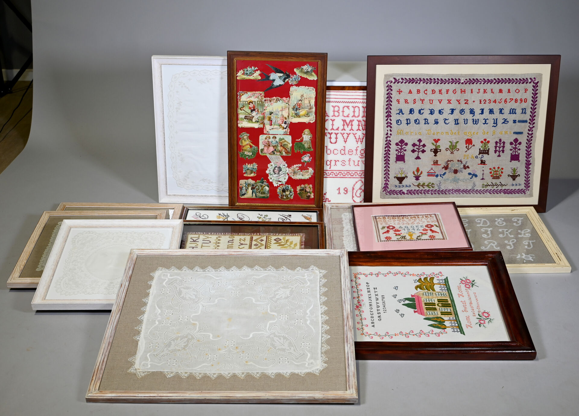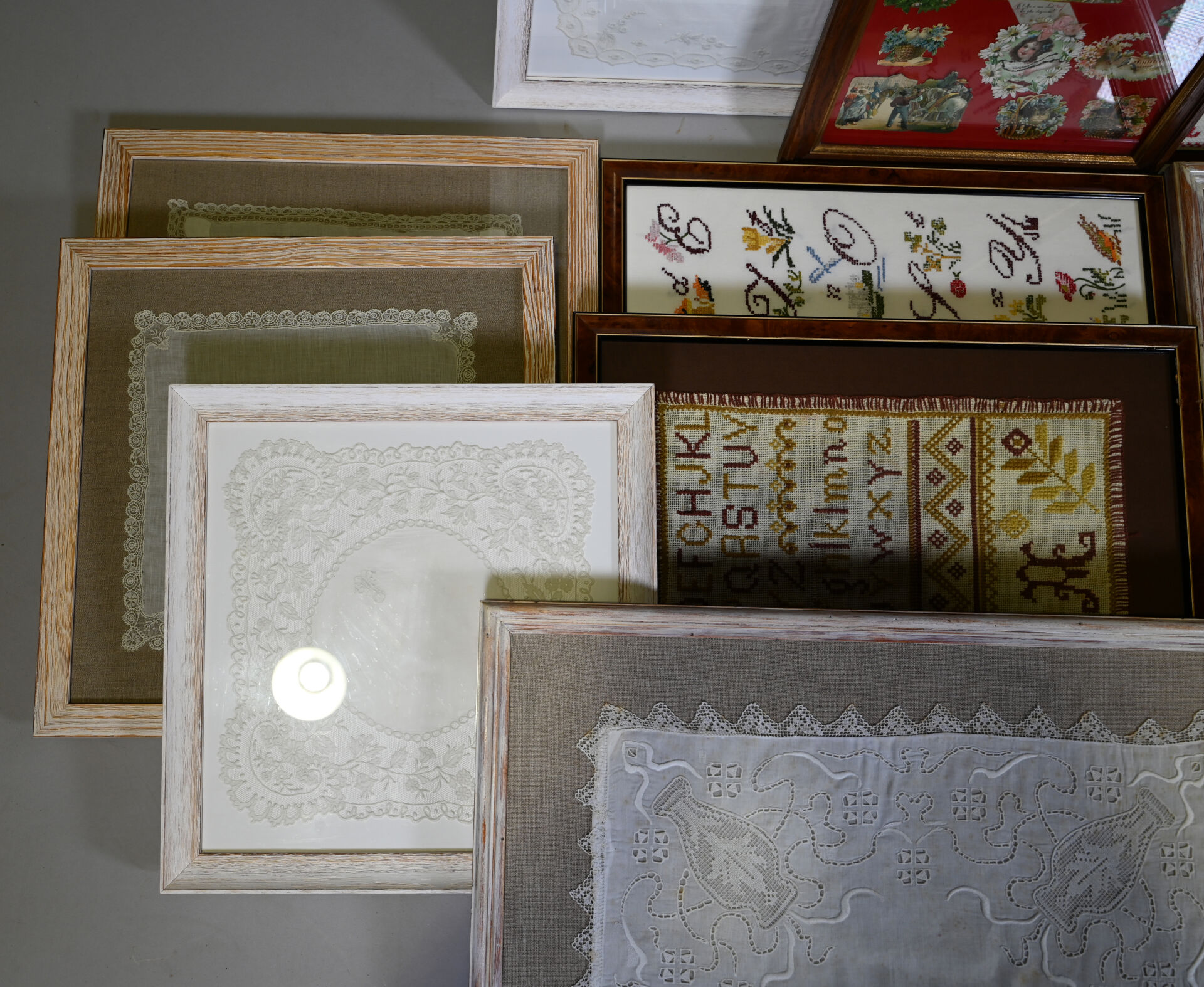 Suite de 14 pièces encadrées soit des broderies, mouchoirs brodés, dentelles, points de croix, cartes postales.
