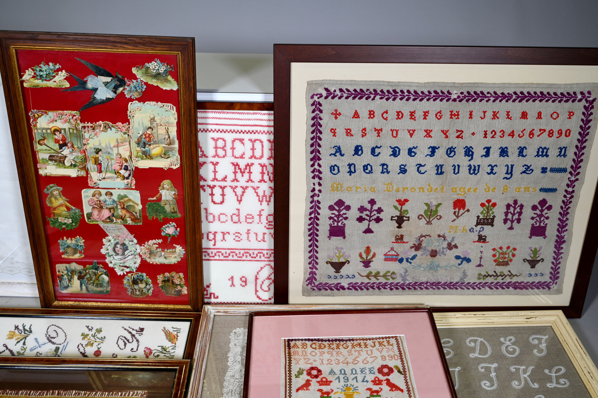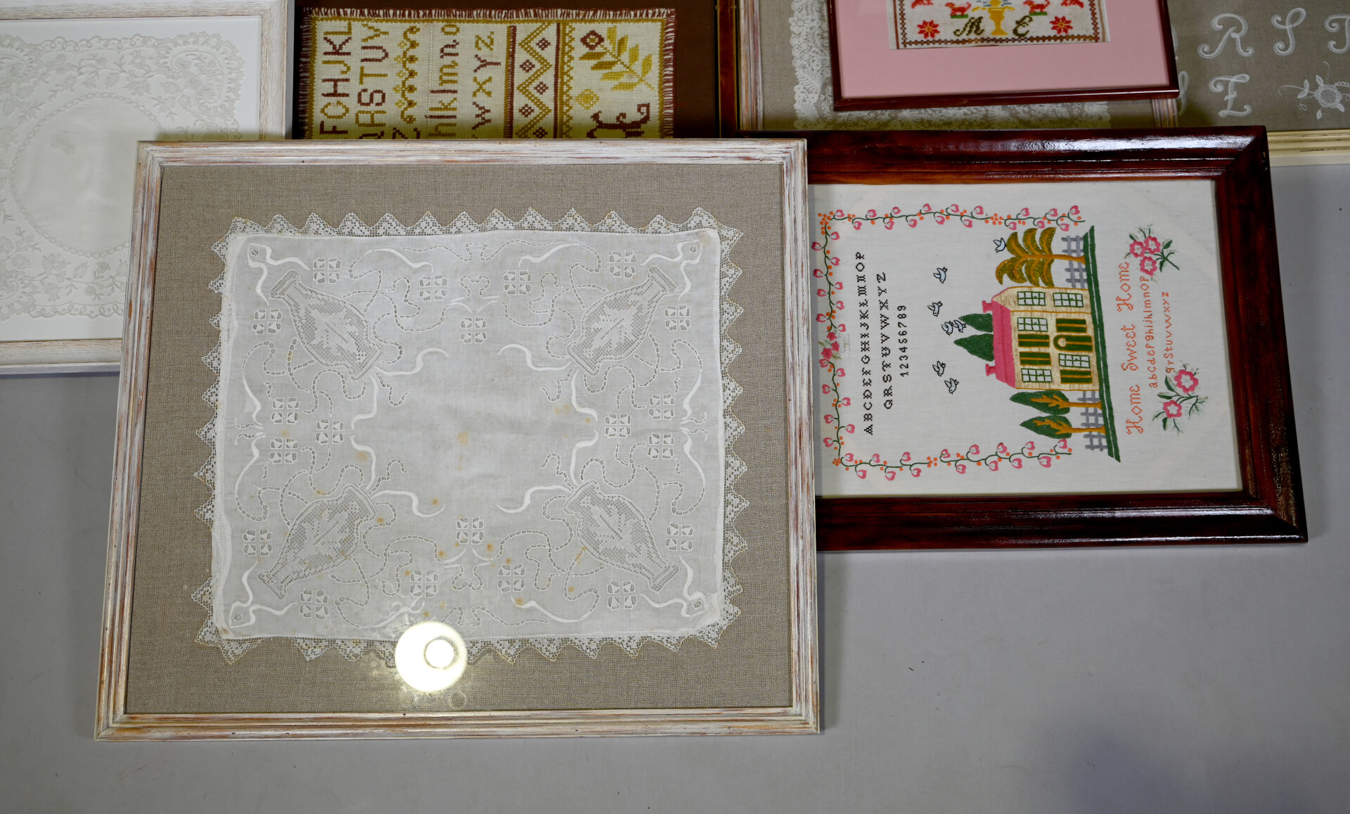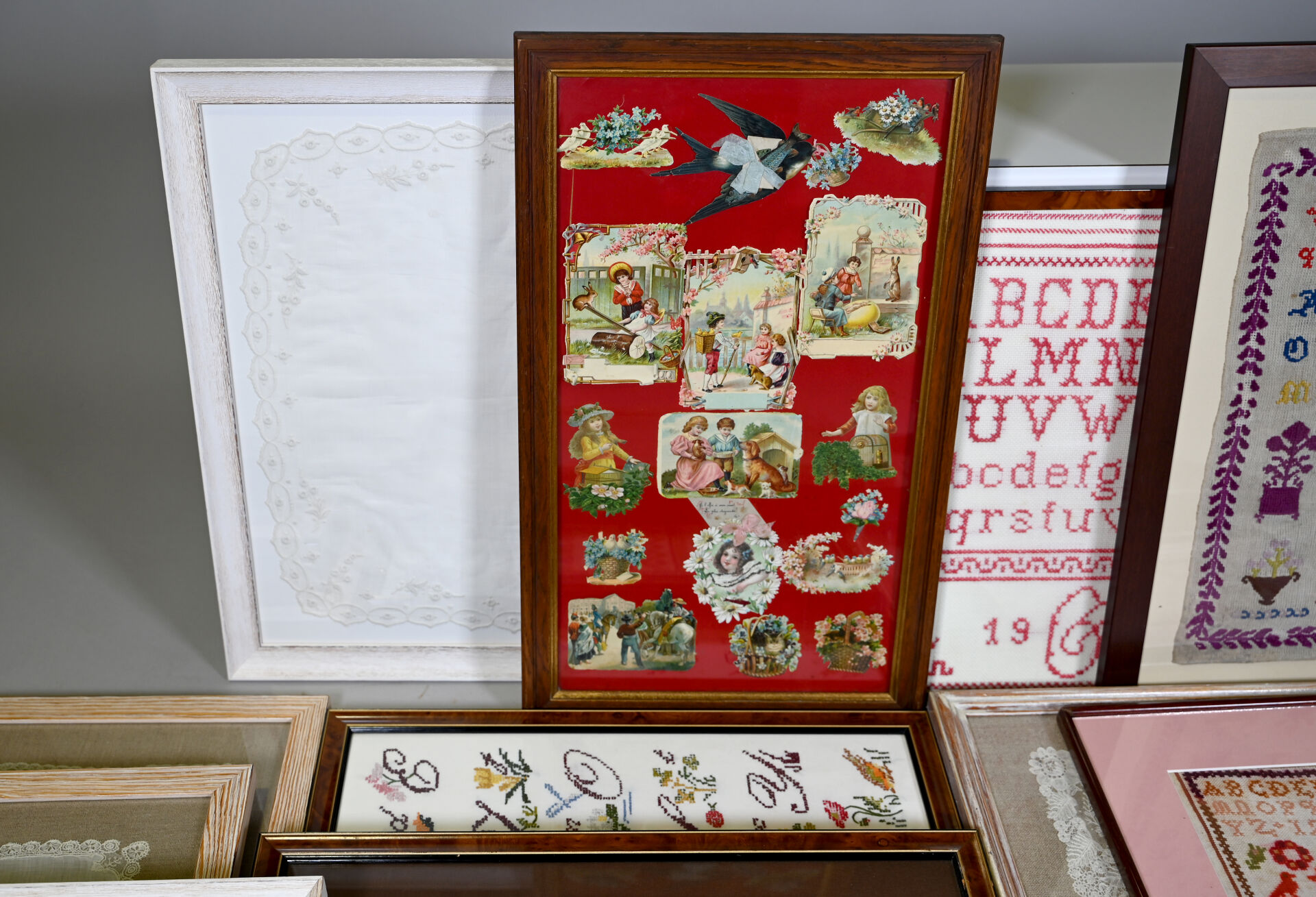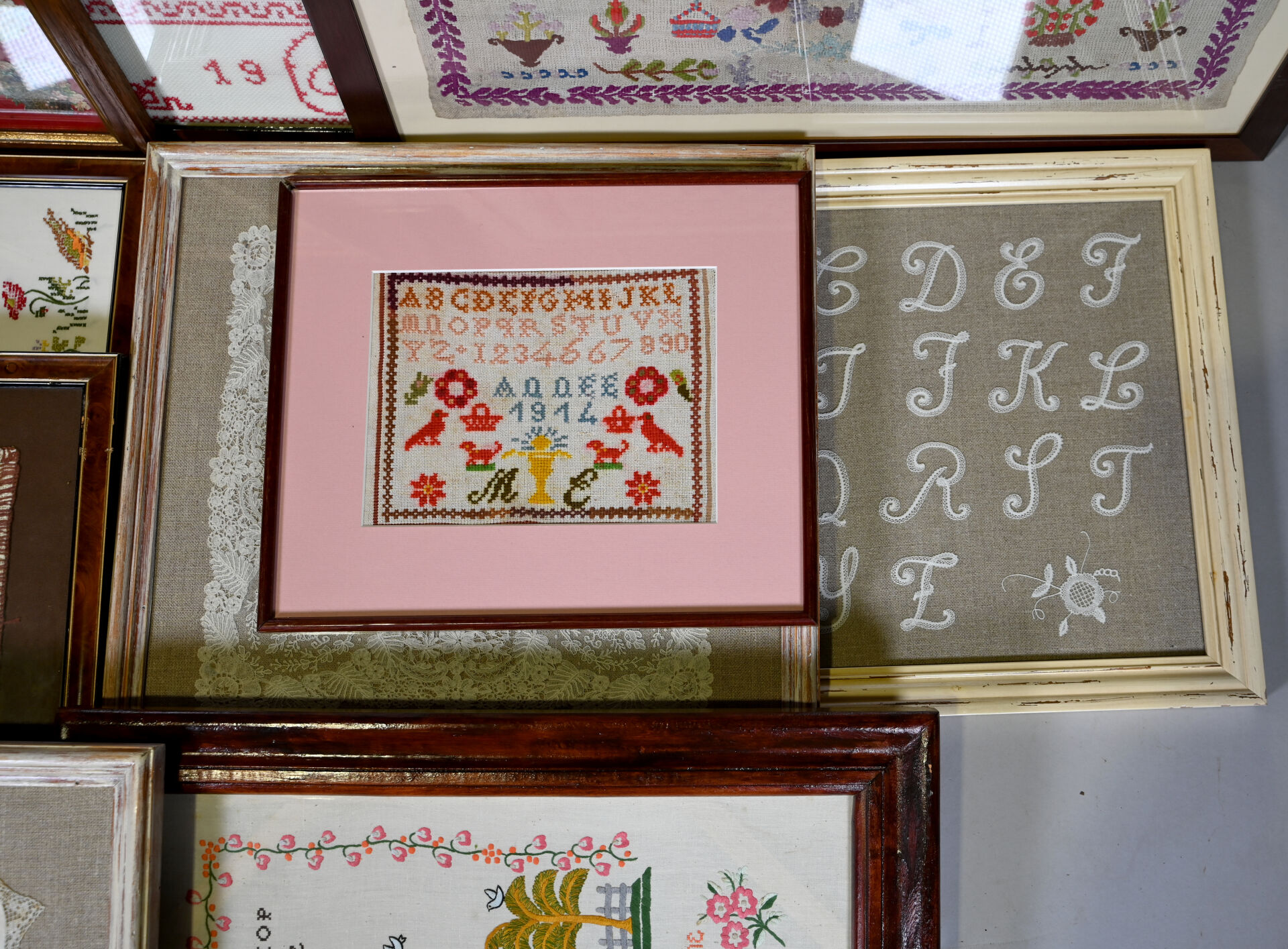 Suite de 14 pièces encadrées soit des broderies, mouchoirs brodés, dentelles, points de croix, cartes postales.