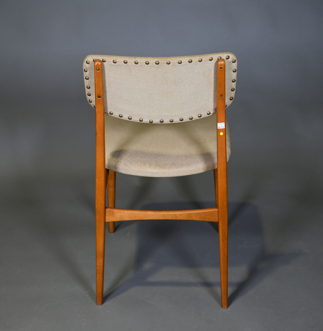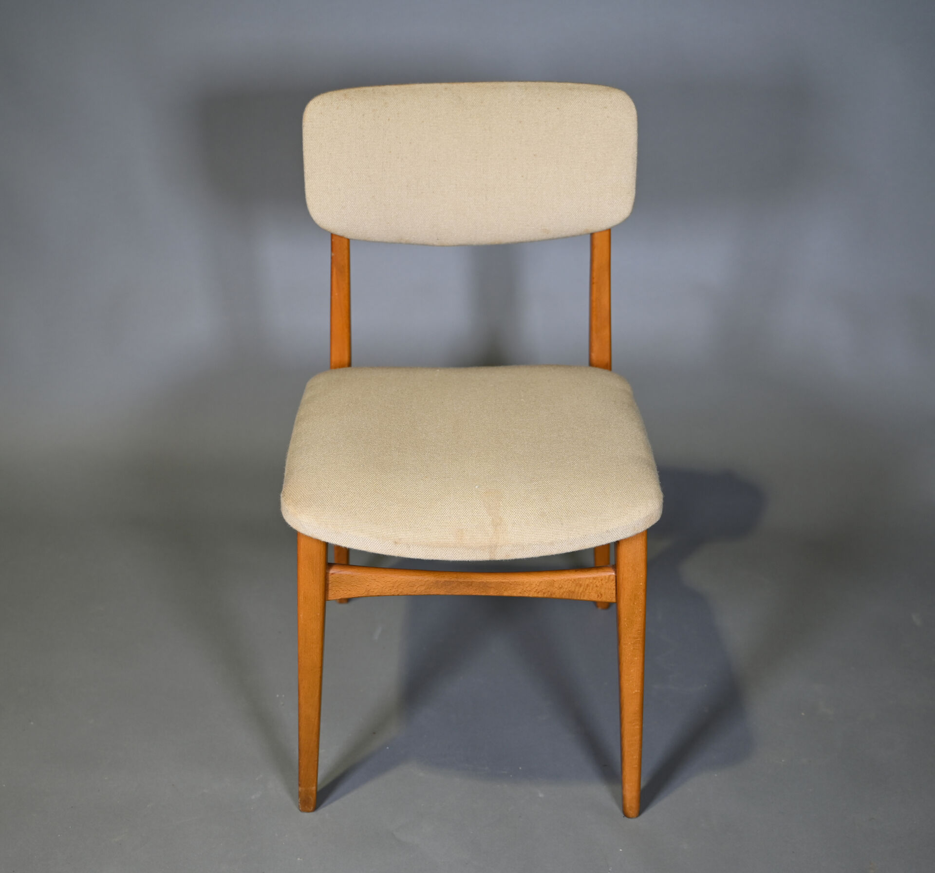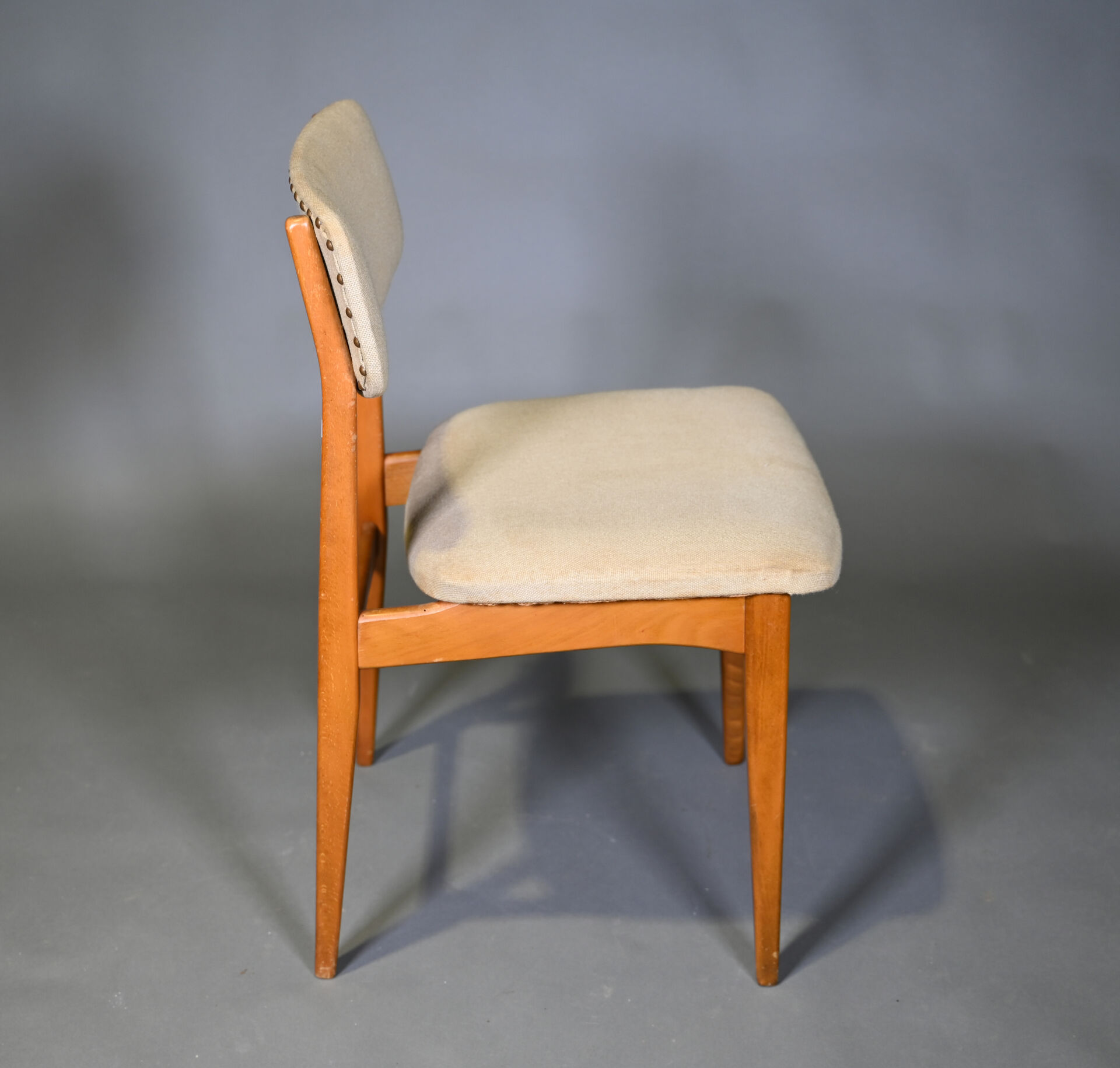 Suite de 3 chaises en bois blond à garniture de tissu beige chiné (frottements). Vers 1970. Haut. : 80 cm.