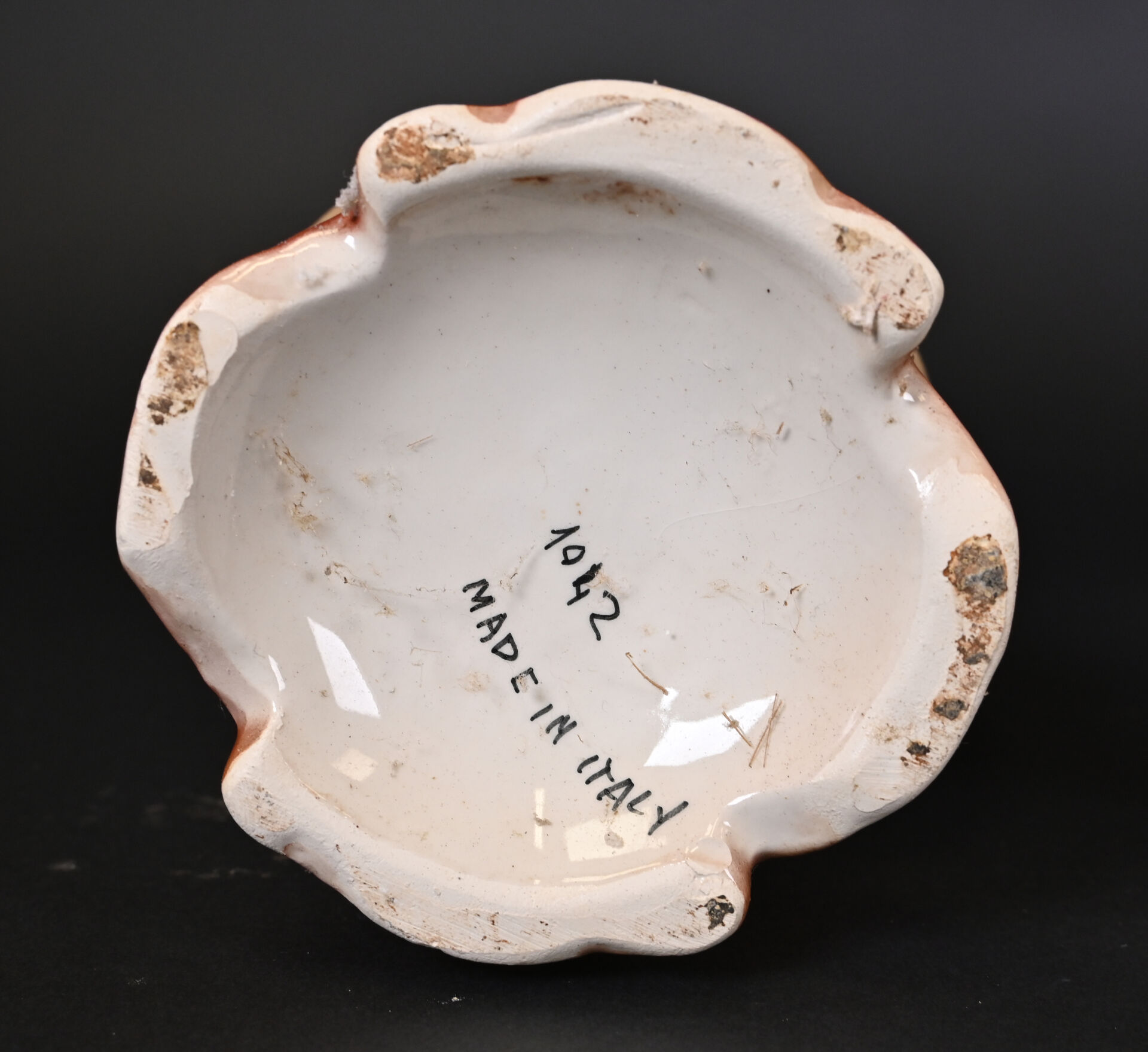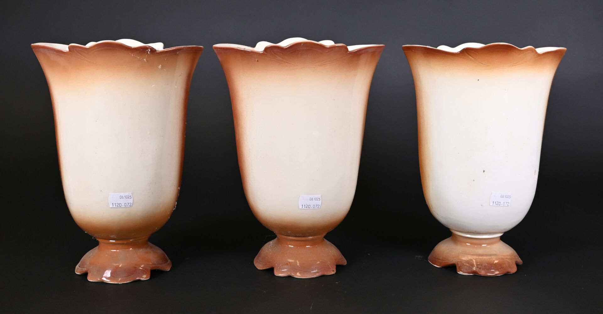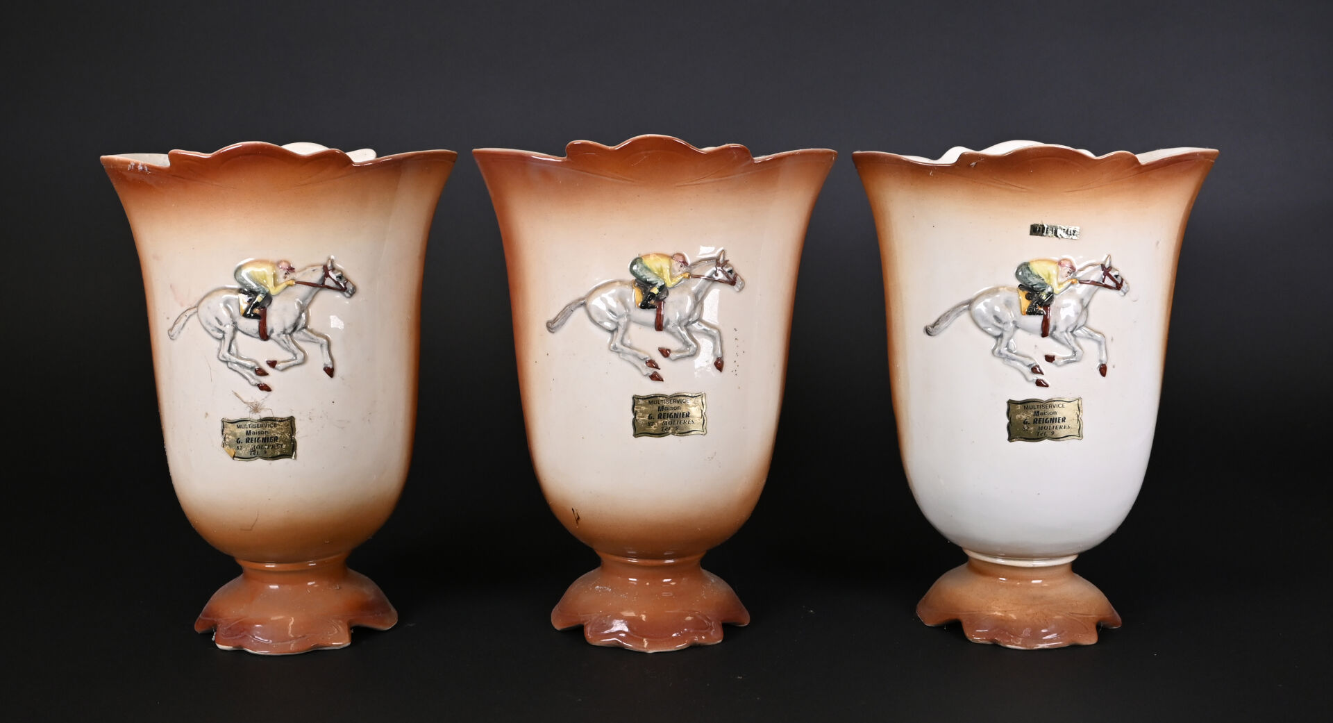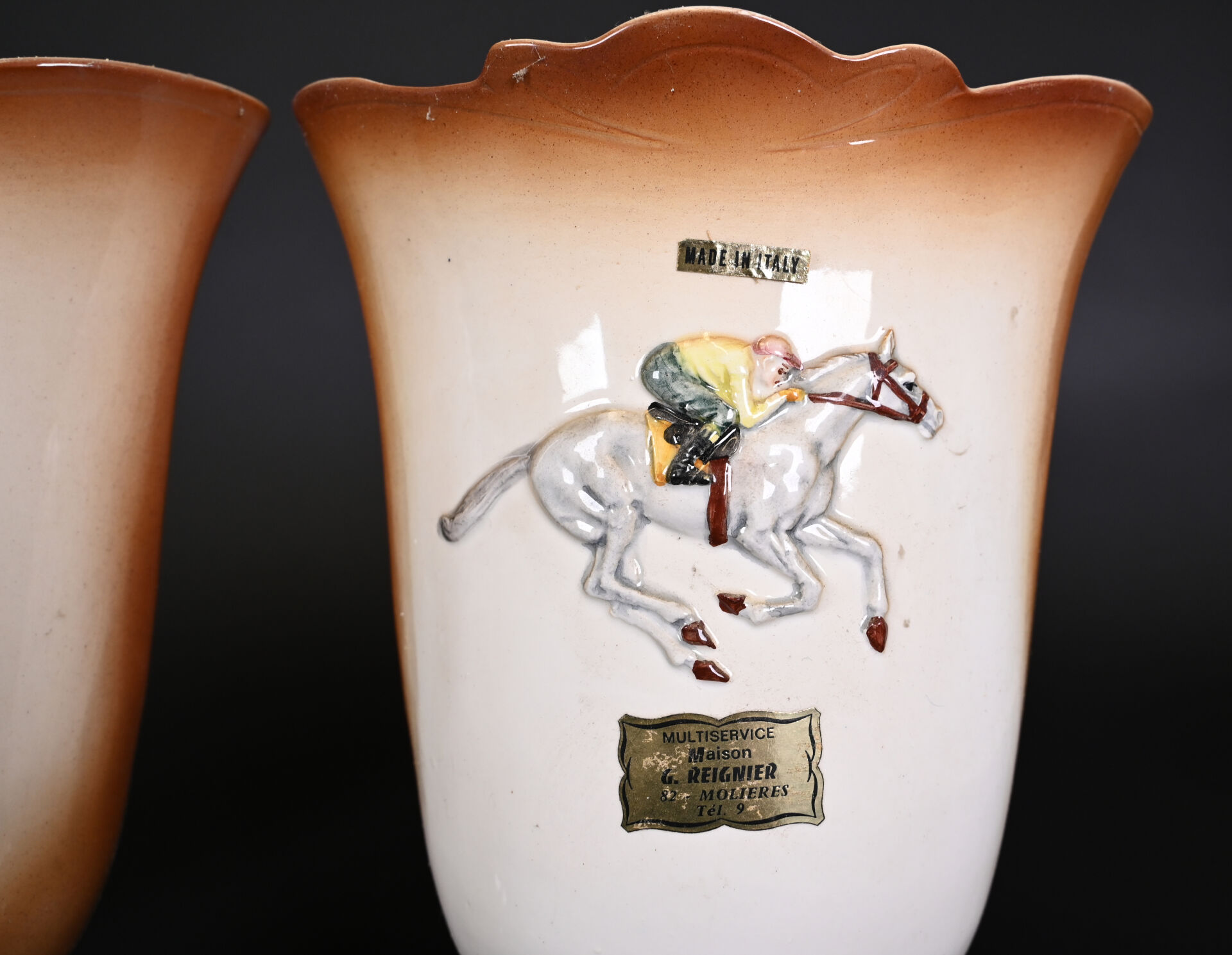 Suite de 3 vases en céramique à décor en relief d’un jockey sur son cheval en polychromie sur fond chocolat nuancé. Marqués Italy au dessous. Haut. : 26 cm.