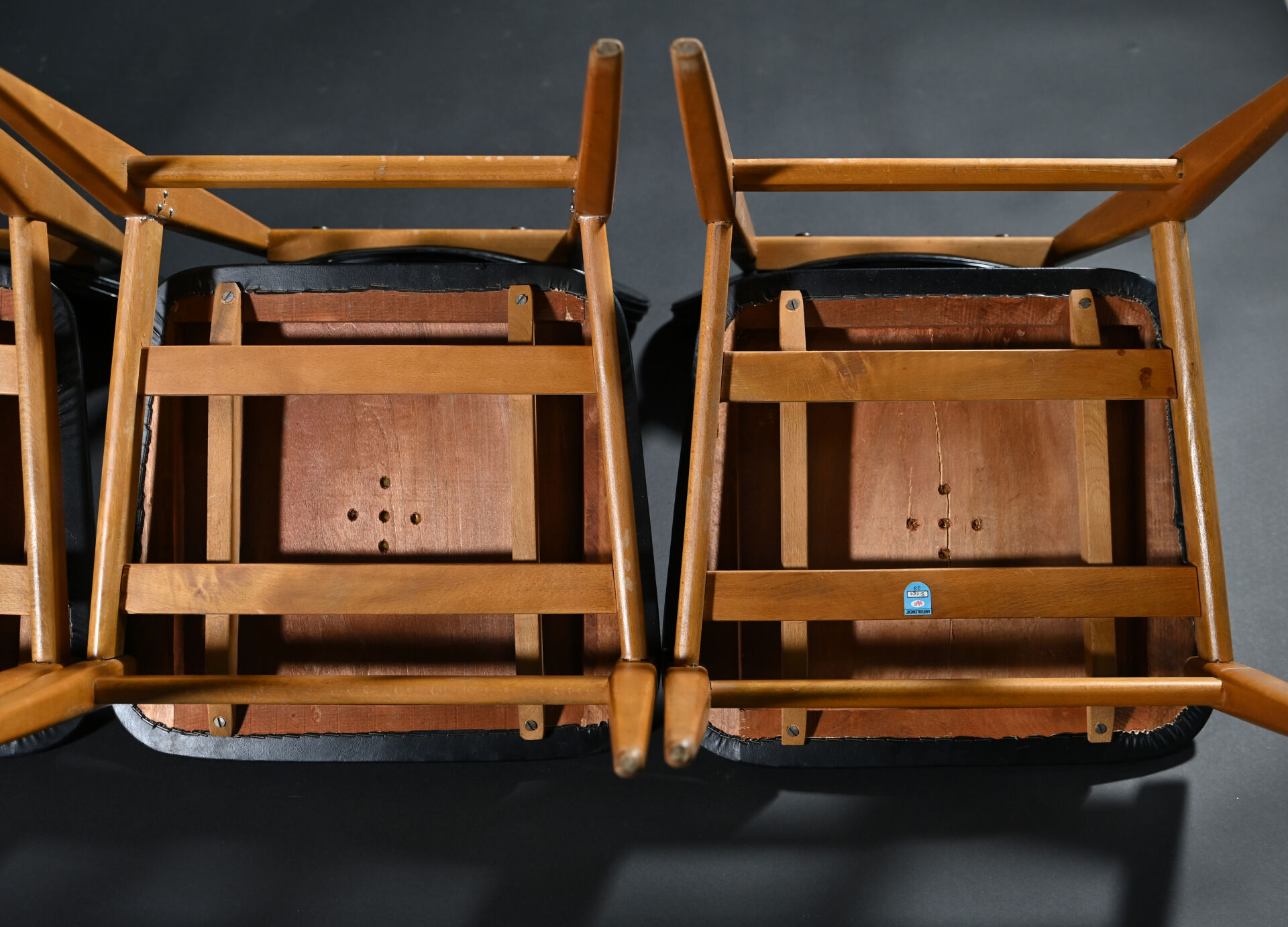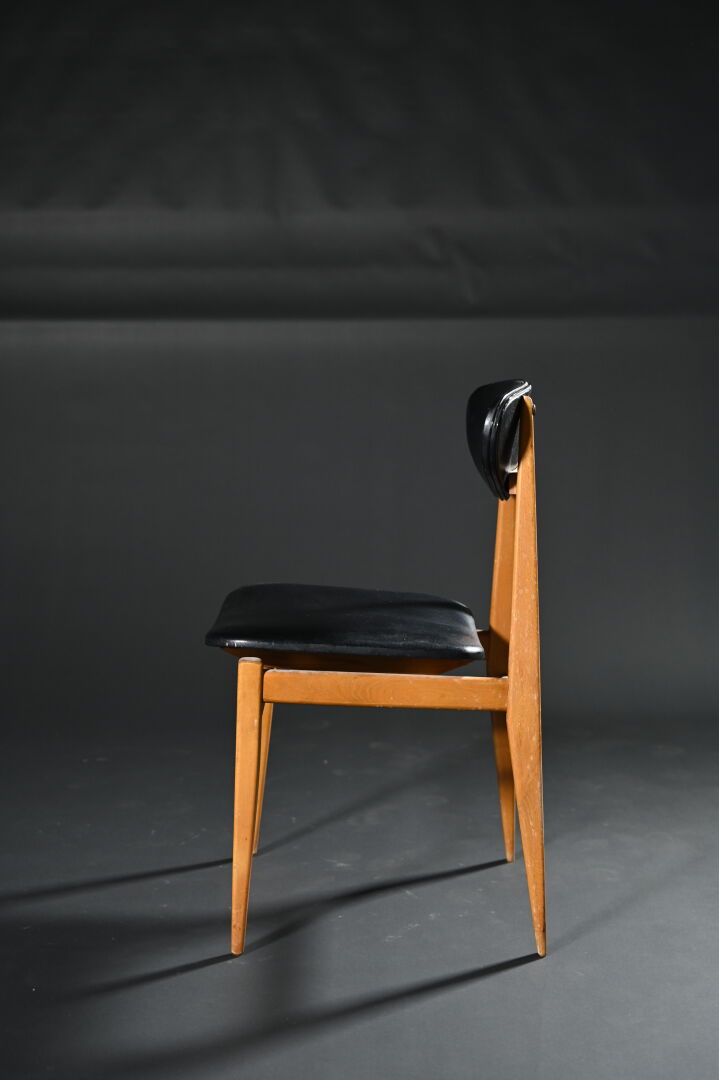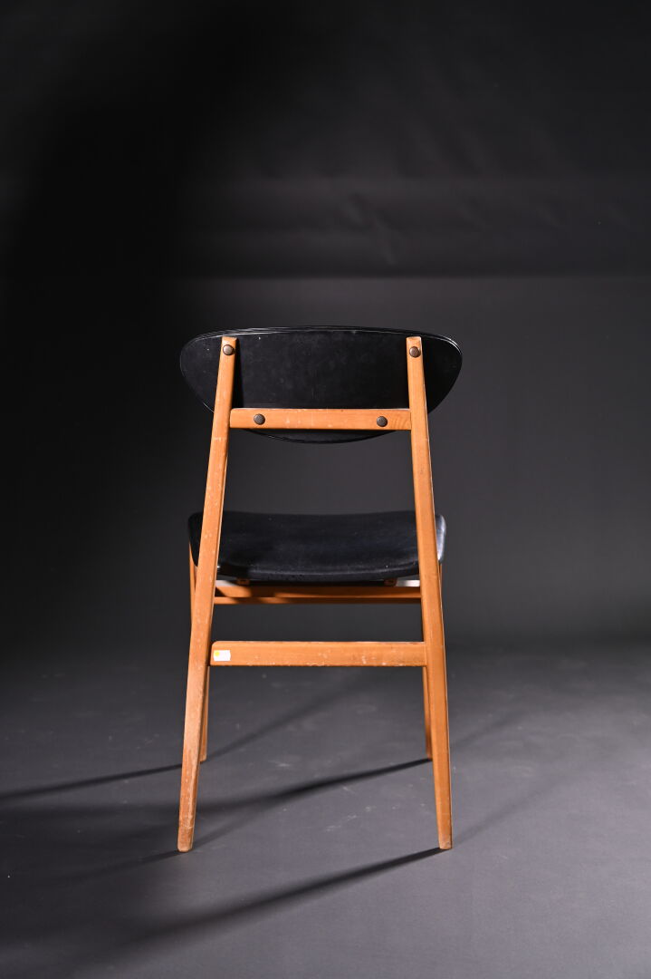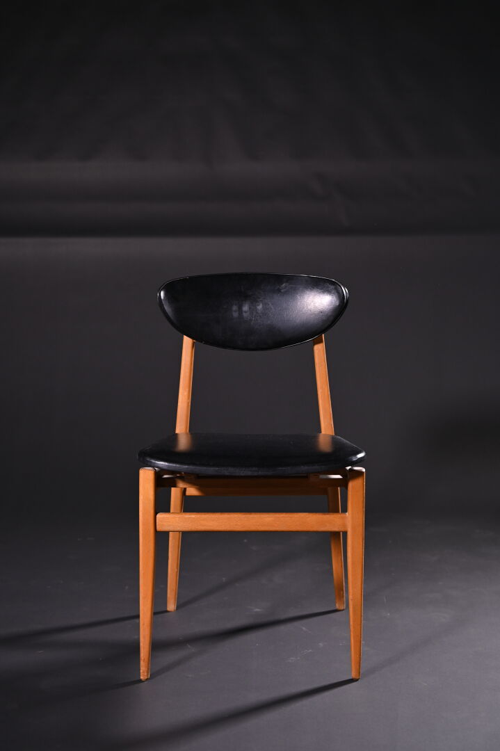 Suite de 4 chaises en bois exotique et contreplaqué à garniture de skaï noir (deux assises accidentées au dessous). Travail français dans le goût scandinave, vers 1960. Haut. : 80 cm.