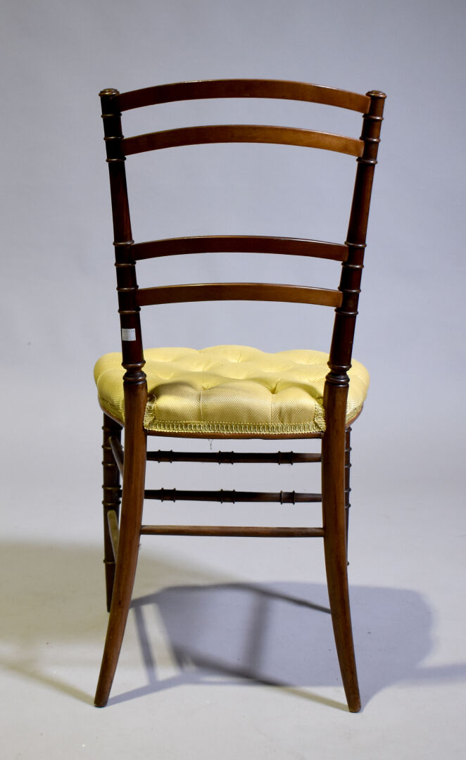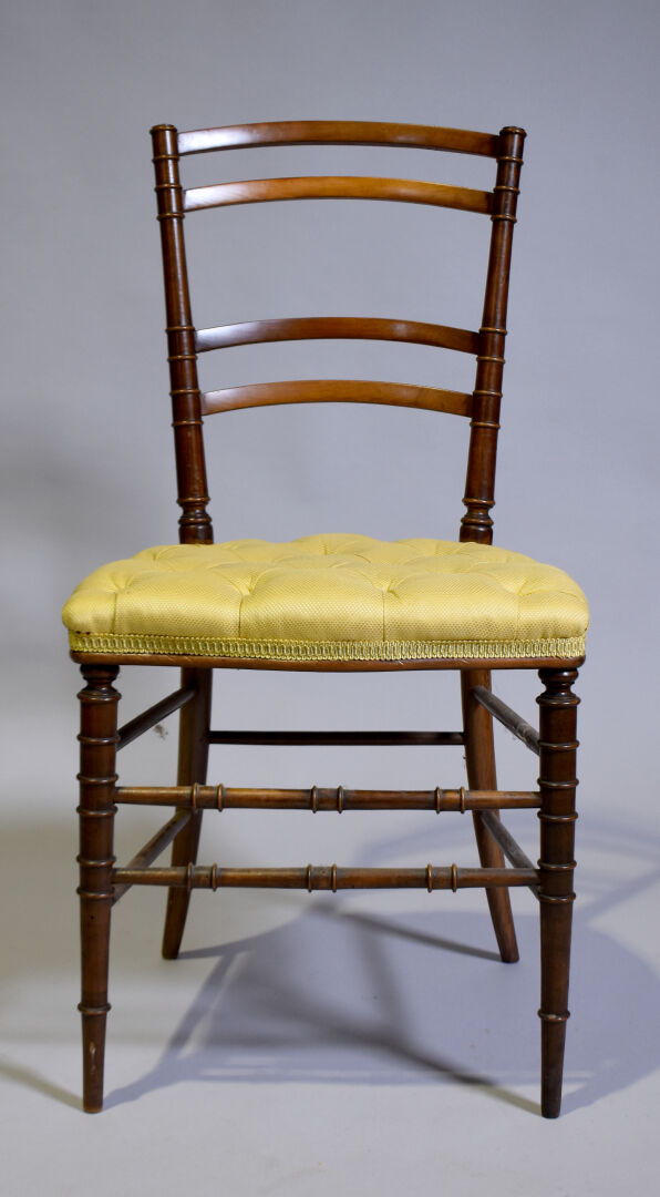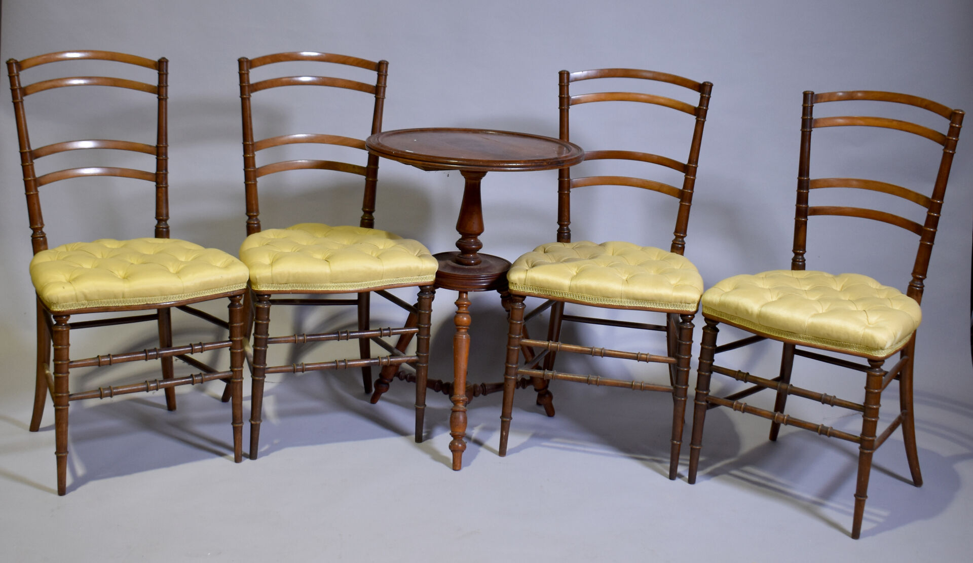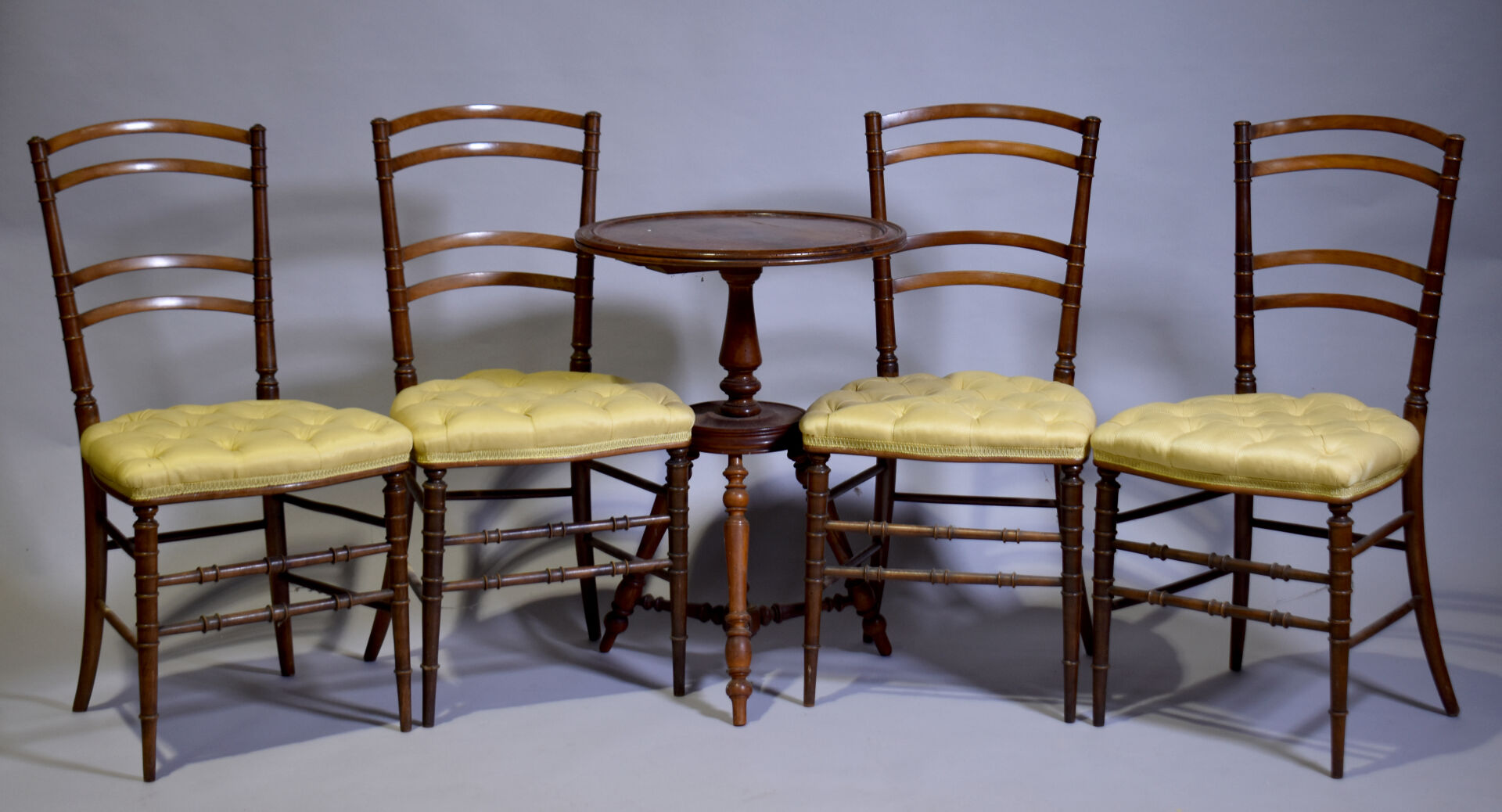 Suite de 4 chaises en bois tourné façon bambou, garnies de tissu jaune capitonné. Epoque Napoléon III. Haut. : 86 cm. On joint un guéridon en bois tourné. Haut. : 71 cm.