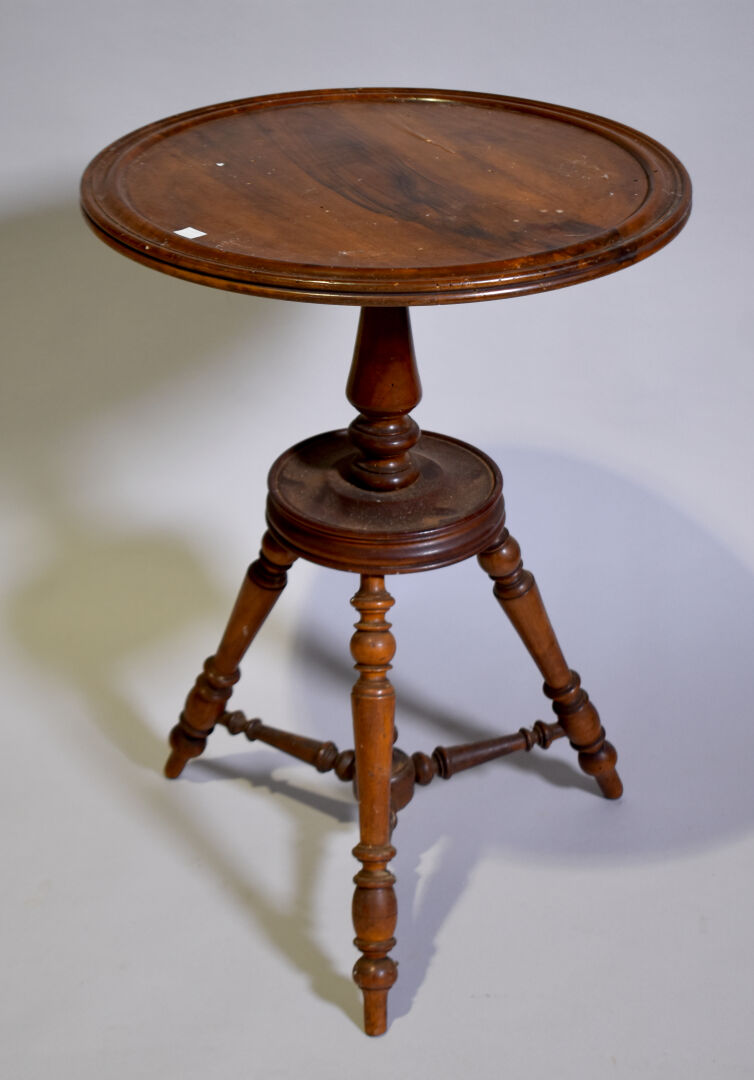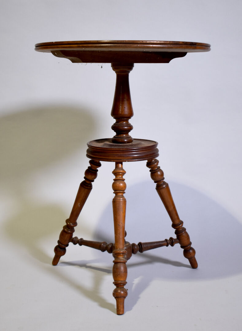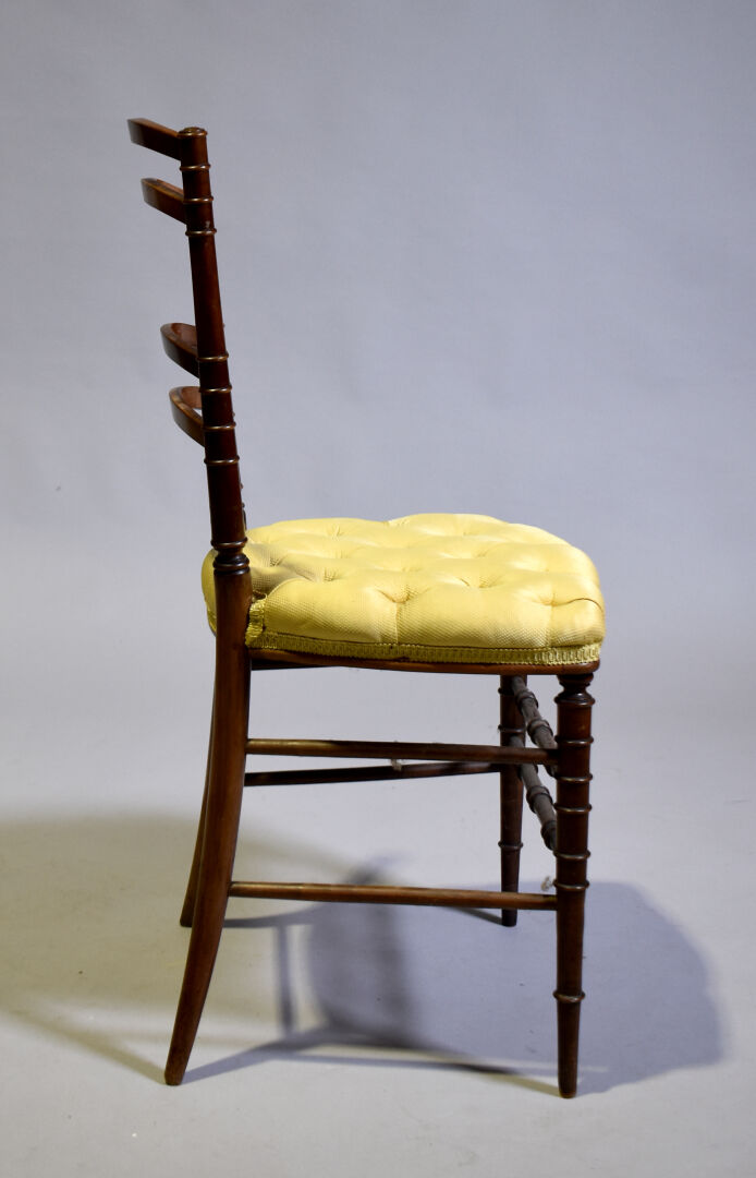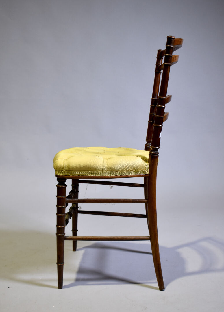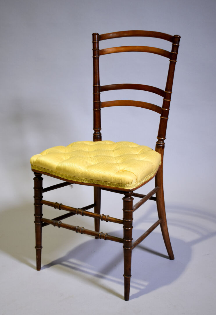 Suite de 4 chaises en bois tourné façon bambou, garnies de tissu jaune capitonné. Epoque Napoléon III. Haut. : 86 cm. On joint un guéridon en bois tourné. Haut. : 71 cm.