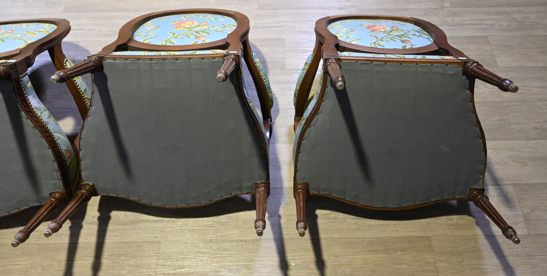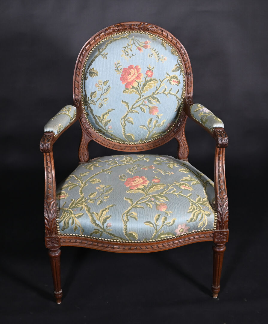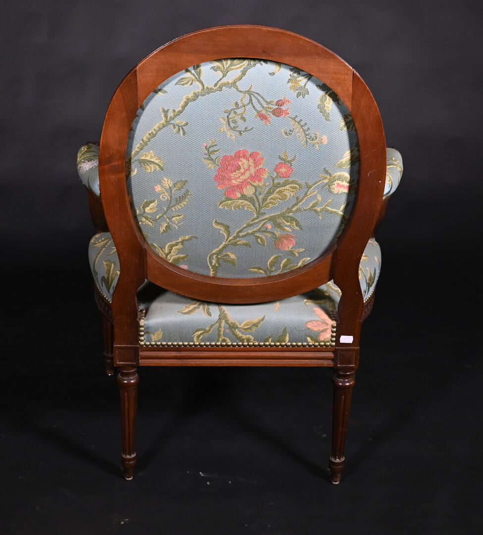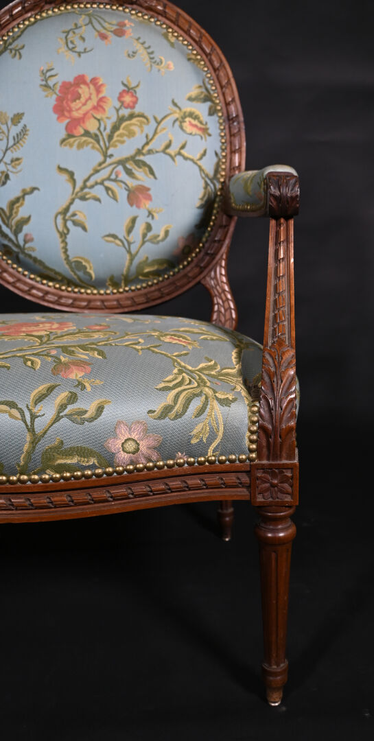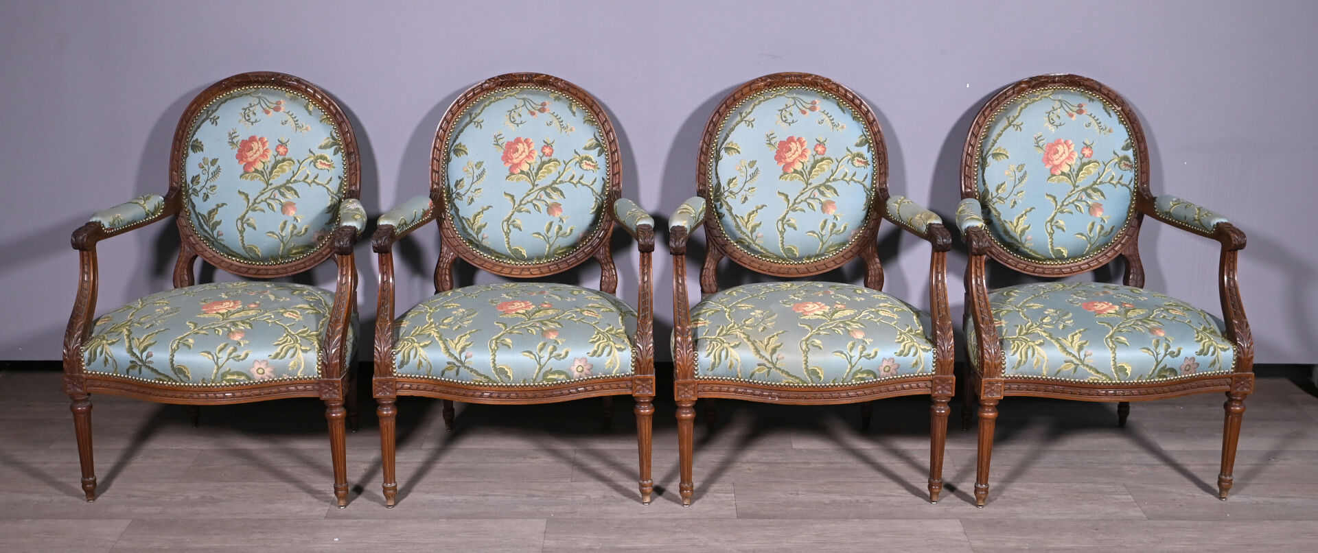 Suite de 4 fauteuils médaillon en bois mouluré sculpté de rubans tors. Les accotoirs à manchettes, les pieds fuselés cannelés. Garniture de tissu fleuri sur fond bleu. Style Louis XVI, XXe siècle. Haut. : 98 cm.